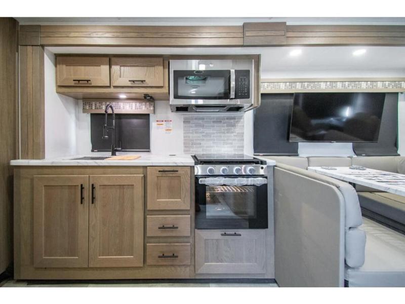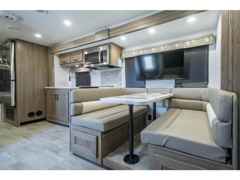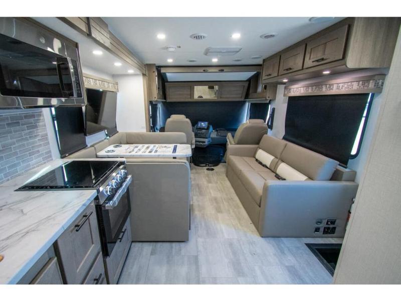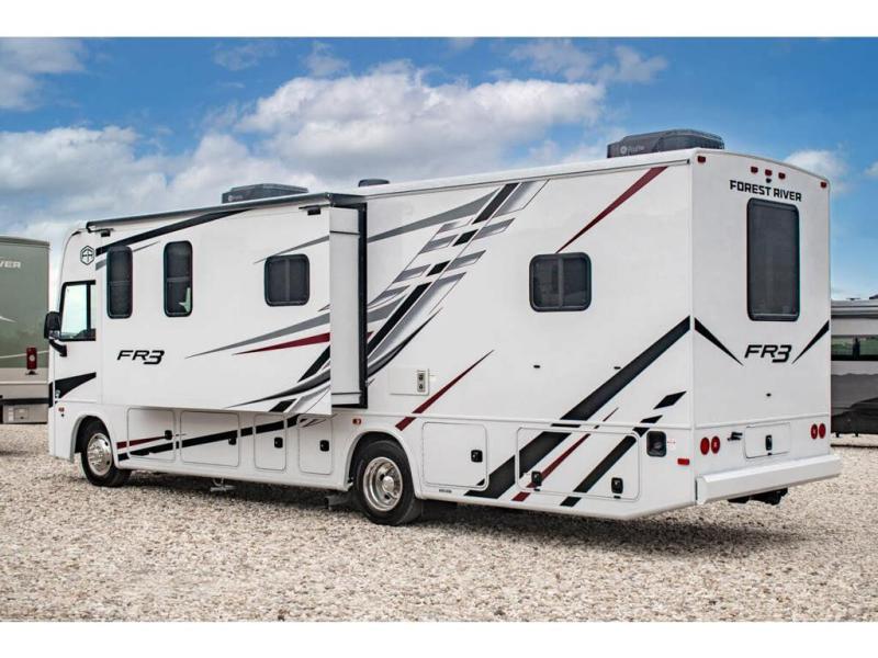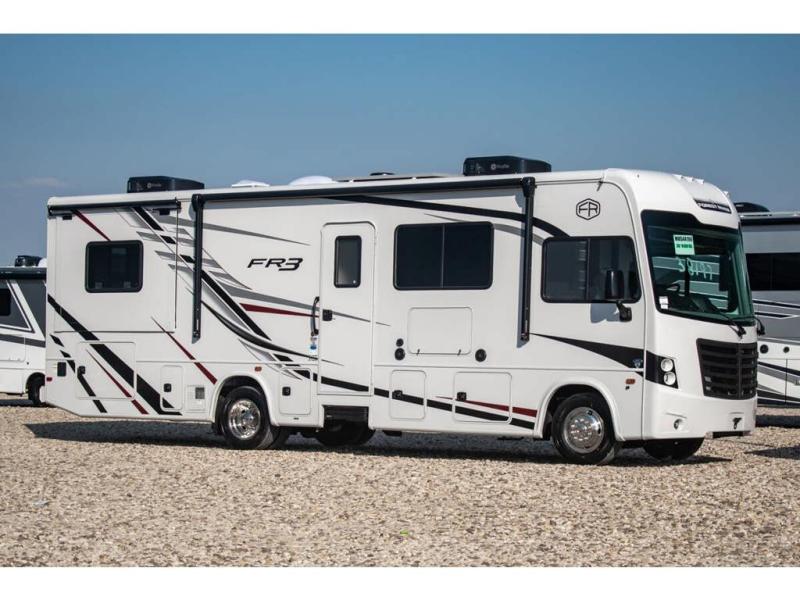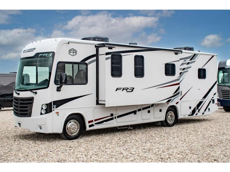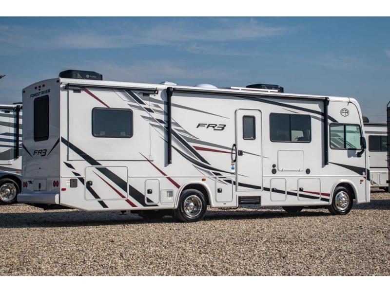 With each FR3 Class A gas motorhome by Forest River, you will find an easy-to-drive coach with a spacious interior allowing you to gather with friends and family with convenience and style found throughout! Each is built with vacuum-bonded construction, a one-piece fiberglass roof with extended rain spouts, a steel firewall and A-pillar extension, Bi-LED headlamps and lower LED fog lights, and grey Rotocast storage boxes with drains, plus more! Inside, you will enjoy black hardware, appliances, plumbing fixtures, and a glass shower door frame. Plus, you will also find a stainless steel kitchen sink with a bamboo cutting board and roll-up dryer, heavy-duty full-extension ball bearing drawer guides, dual-access dinette storage with doors, and nightstands with charging stations to keep your cellphones ready for whatever is next. Make your selection today!