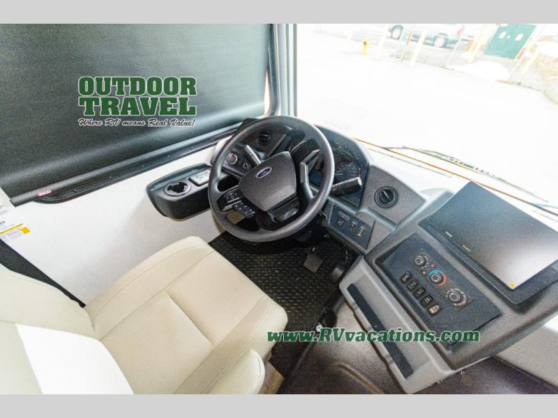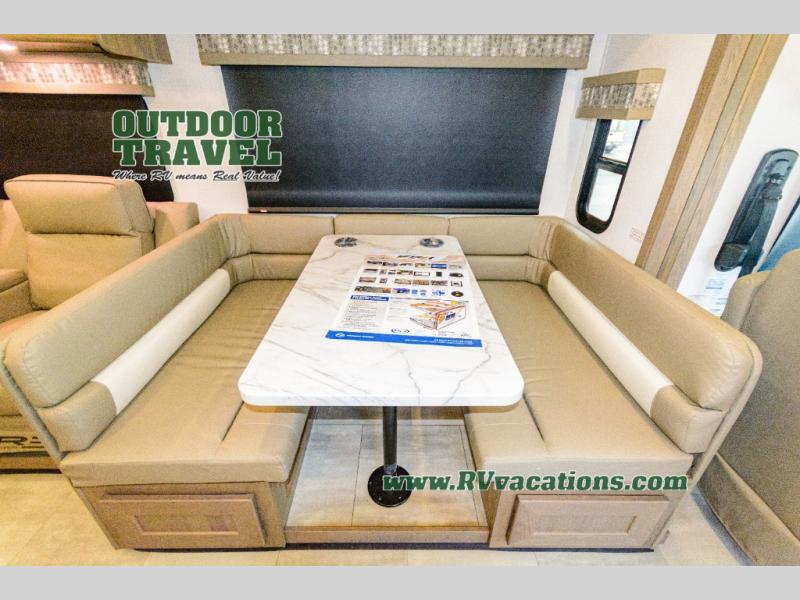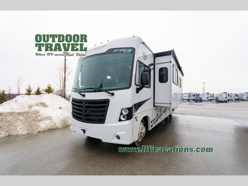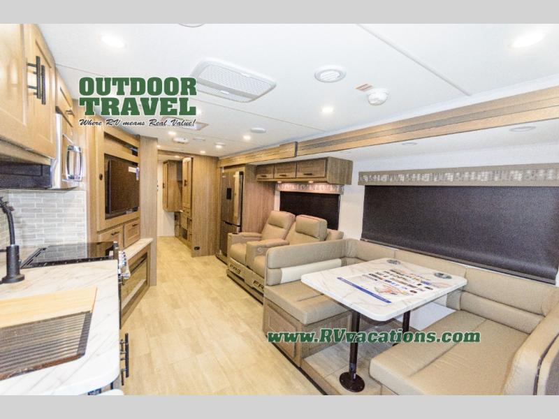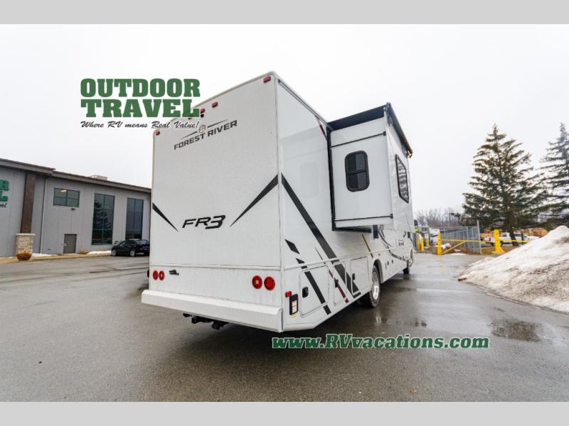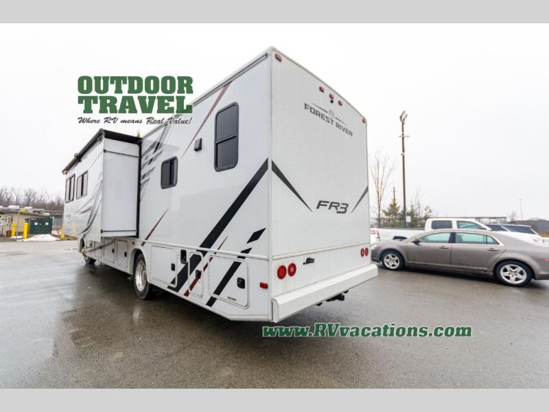 With each FR3 Class A gas motorhome by Forest River, you will find an easy-to-drive coach with a spacious interior allowing you to gather with friends and family with convenience and style found throughout! Each is built with vacuum-bonded construction, a one-piece fiberglass roof with extended rain spouts, a steel firewall and A-pillar extension, Bi-LED headlamps and lower LED fog lights, and grey Rotocast storage boxes with drains. Inside, you will enjoy black hardware, appliances, plumbing fixtures, and a glass shower door frame. You will also find a stainless steel kitchen sink with a bamboo cutting board and roll-up dryer, heavy-duty full-extension ball bearing drawer guides, dual-access dinette storage with doors, and nightstands with charging stations to keep your cellphones ready for whatever is next. Make your selection today!
