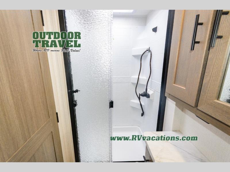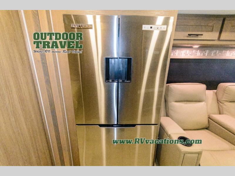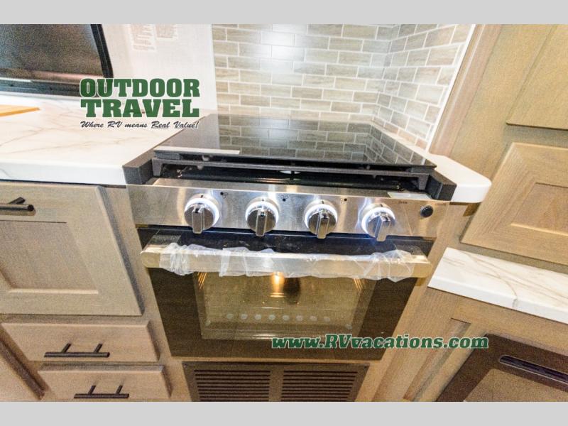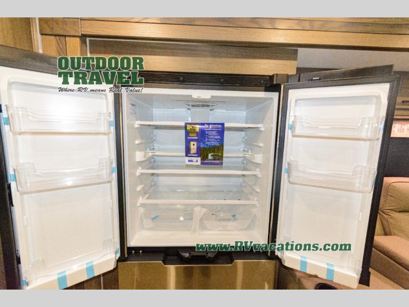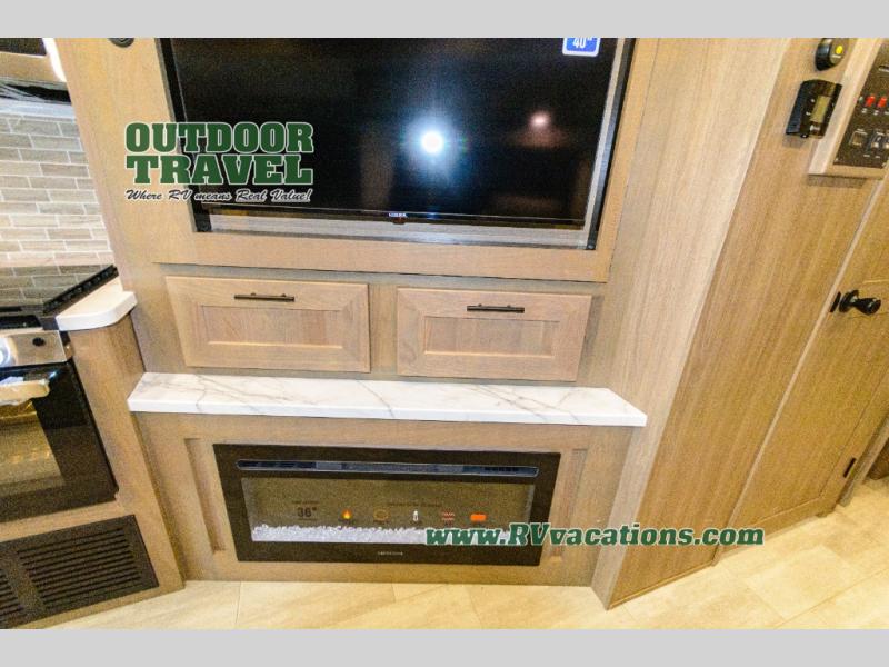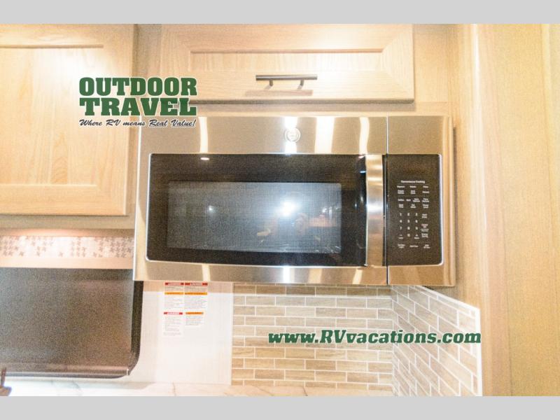 Spacious and inviting for couples or families, this FR3 Class A gas motorhome offers convenience throughout including a half bath for the kids and guests and a full rear bathroom for the owners. This full bathroom is located within the rear master suite where you will also find a king-size bed for relaxing. Once at your destination, you can quickly set up the power awning to relax outside while watching the exterior TV and visiting with other RVers. You might have decided to add the washer and dryer option in the bedroom, so a load of laundry might even get done. Once you are ready to fill your tummy, the full kitchen offers everything you need plus a residential microwave. You might even decide to relax on one of the theater seats after dinner as you watch the big game on the 40" LED 12V TV with a fireplace below.