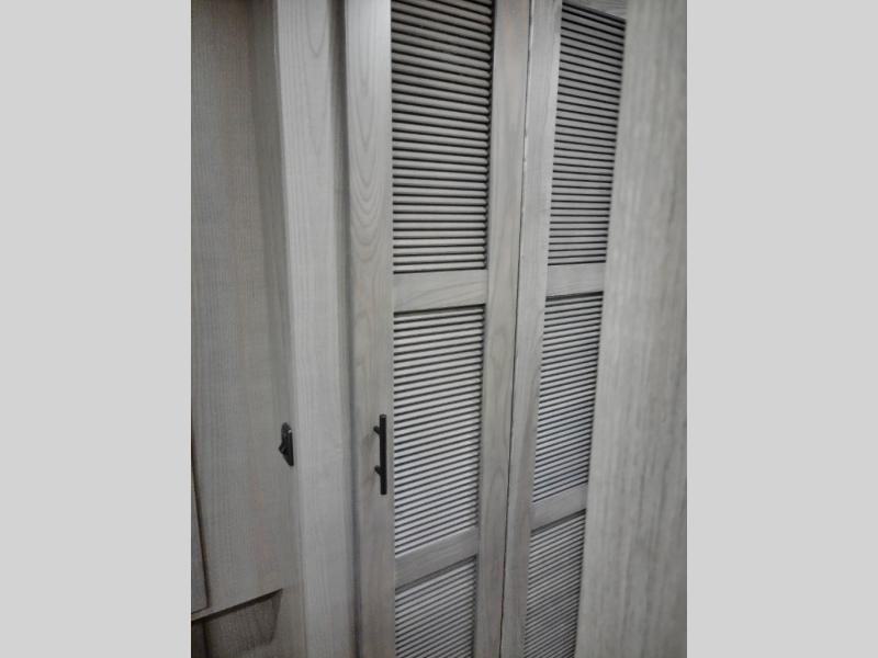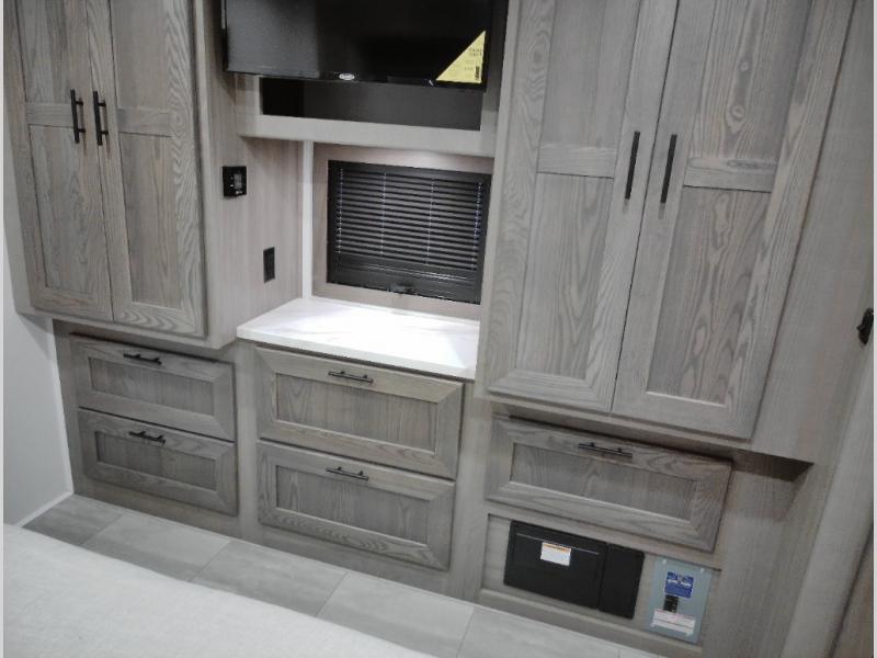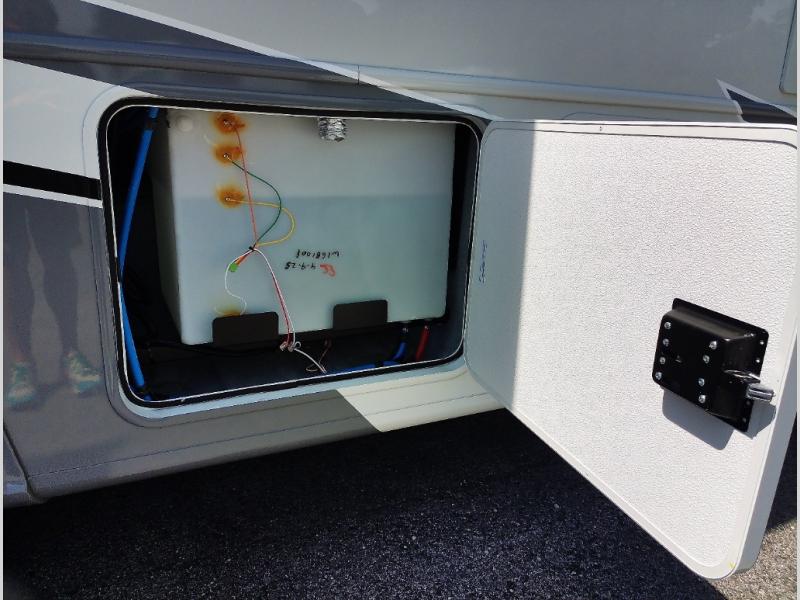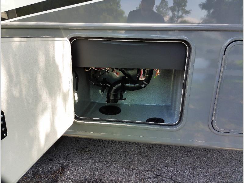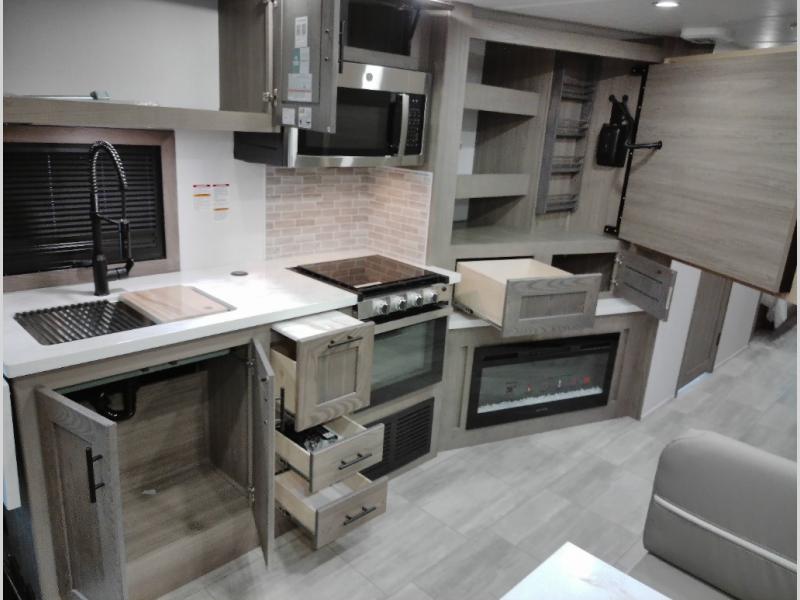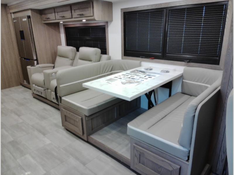 It won't be hard to find comfort in this spacious coach for five to six! Once you arrive at the campground, you can put out the 19' power awning with an LED light and turn on the outdoor TV. Once you've unloaded the pass-through storage, you can head inside to relax on the 68" theater seating or play a game at the wrap-around booth dinette. There is also a 40" Smart TV with a hidden pantry behind it and a fireplace for those cooler evenings. The chef will find everything they need to prepare meals each day, including a residential microwave, a stainless steel three burner cooktop with a 22" oven, and a stainless steel 15 cu. ft. 12V refrigerator for food storage. You can retreat to the rear private bedroom when you're ready to call it a night. Here, you'll enjoy a king bed slide out with dual nightstands and 110V/USB ports, dual bedroom wardrobes, and a 32" 12V TV. This model also includes a convenient full bath and a stackable washer and dryer prep if you choose to add those appliances!