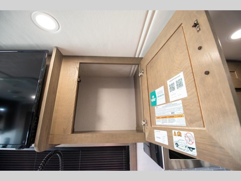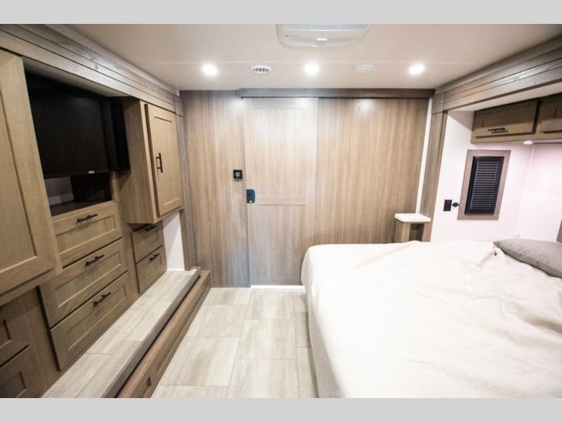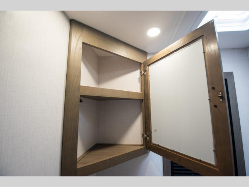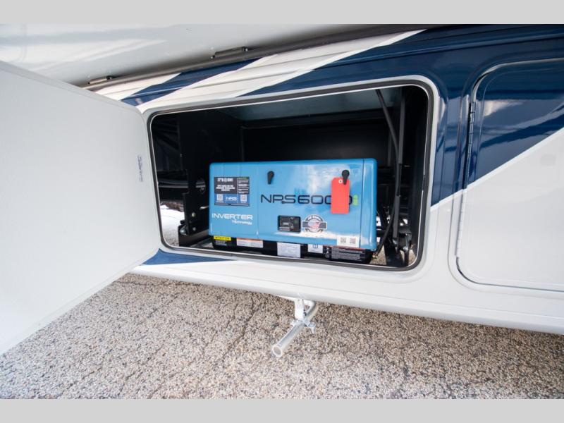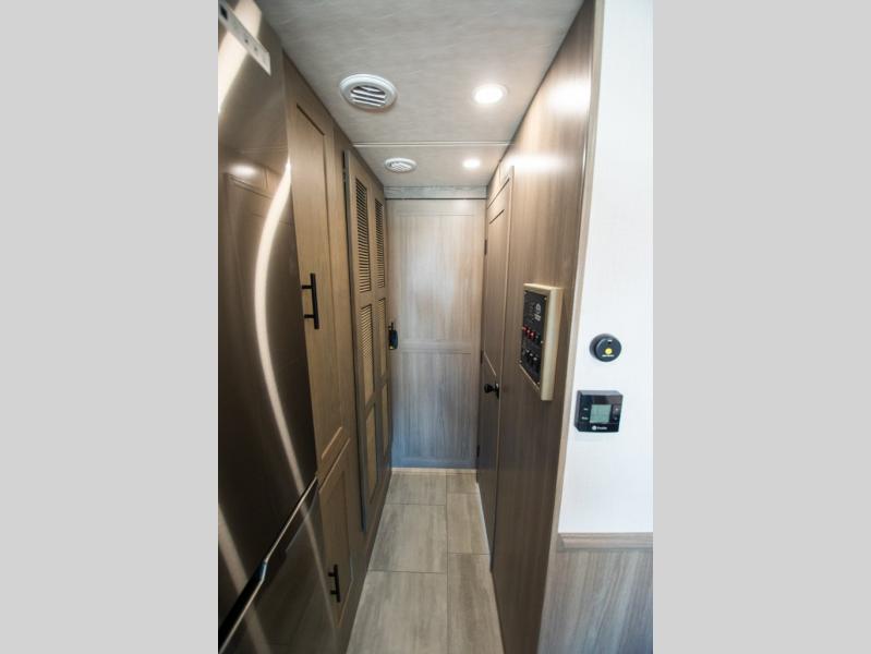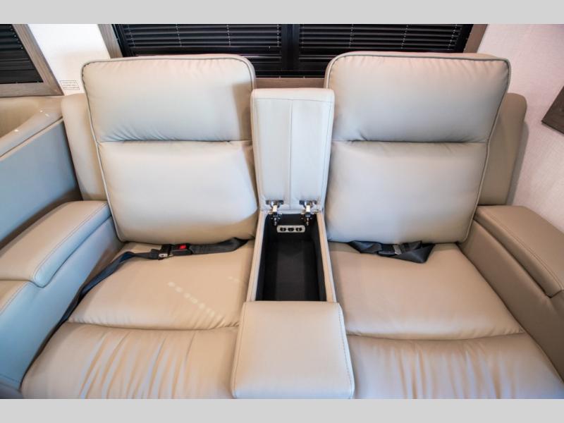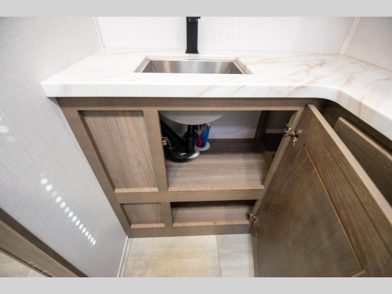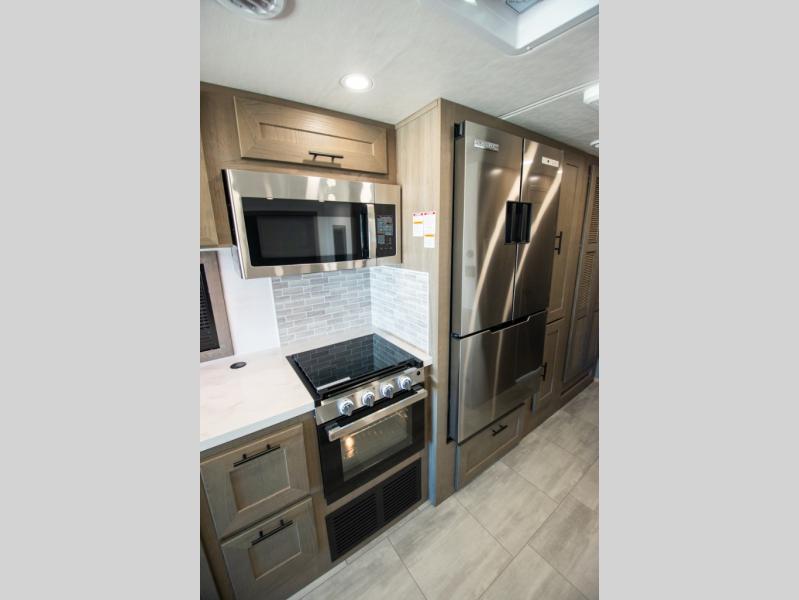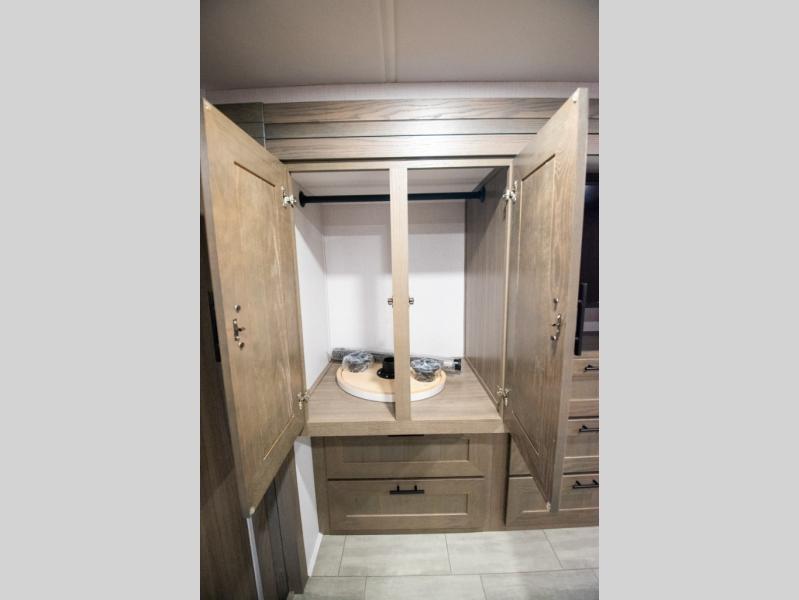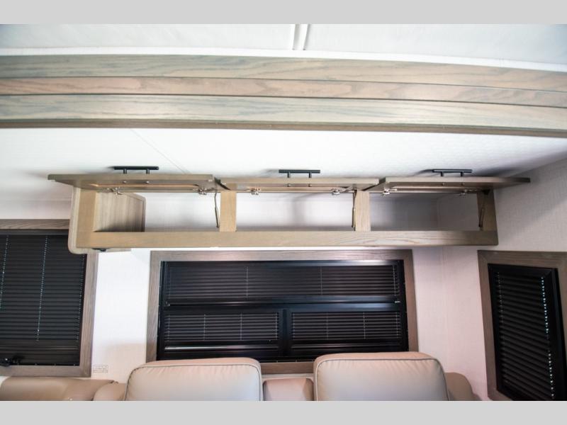 If you're looking for more space when you travel and a little more convenience, this coach may just be perfect for you! Not only will you enjoy a master bedroom with a full rear bath, but your guest will have the mid-coach half bath for easy use! A king bed slide out will provide a great night's rest each nigh, and you'll appreciate dual bedroom wardrobes to keep your clothes organized. There is also a wardrobe with stackable washer and dryer prep if you want the option to make laundry day easier. Head to the kitchen to prepare breakfast on the stainless steel three burner cooktop, or you can use the 30" residential over-the-range microwave. There is a wrap-around booth dinette where you can dine together plus 68" power theater seating across from the 32" 12V TV for easy viewing. This model also includes secure overhead storage above the cab where you can put luggage, lawn equipment, board games, and more!