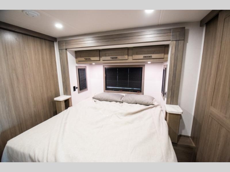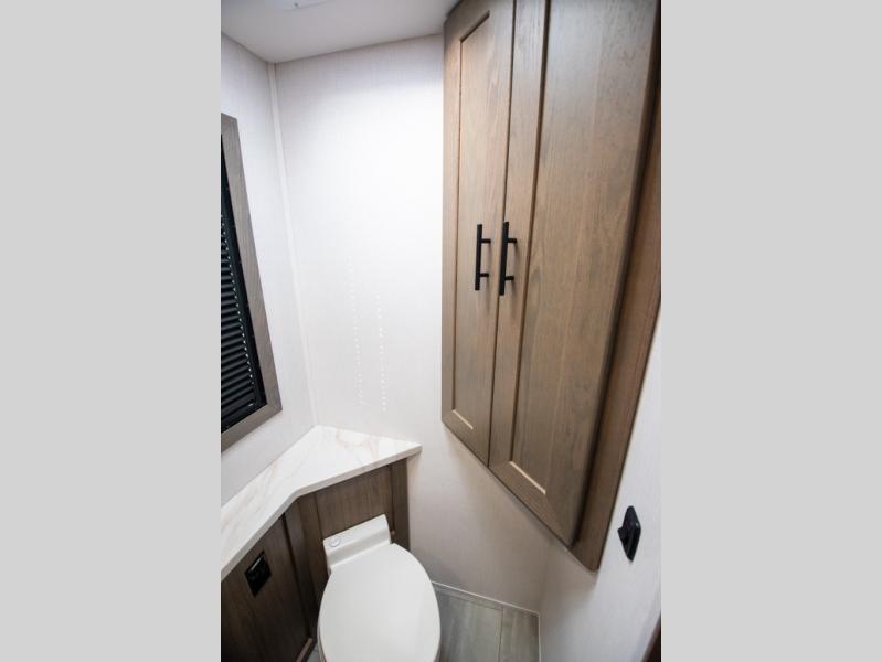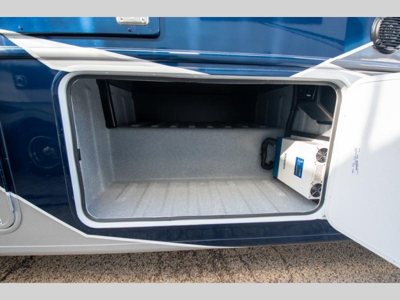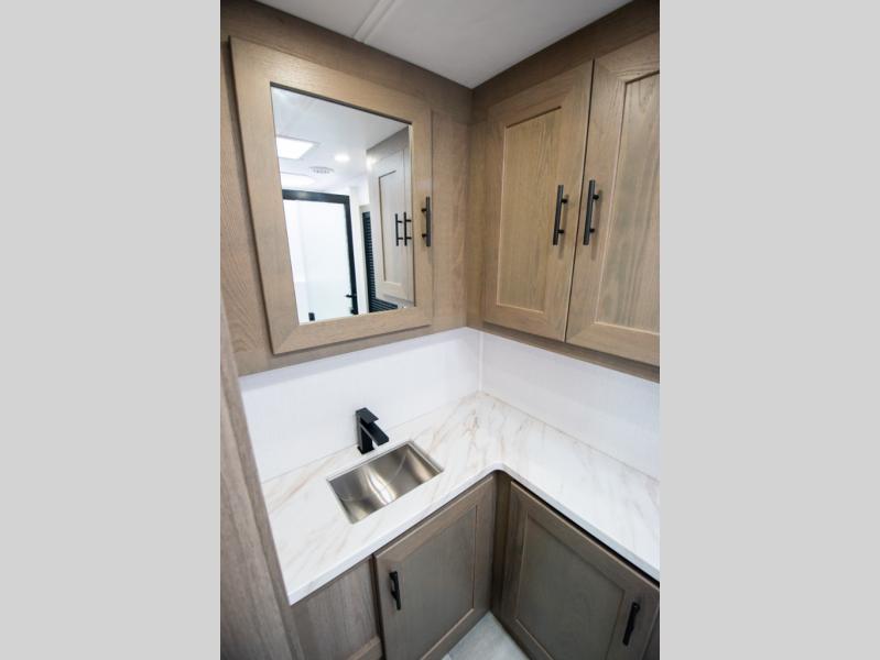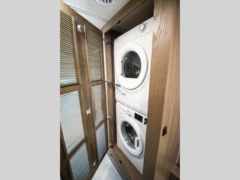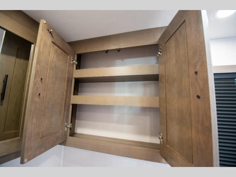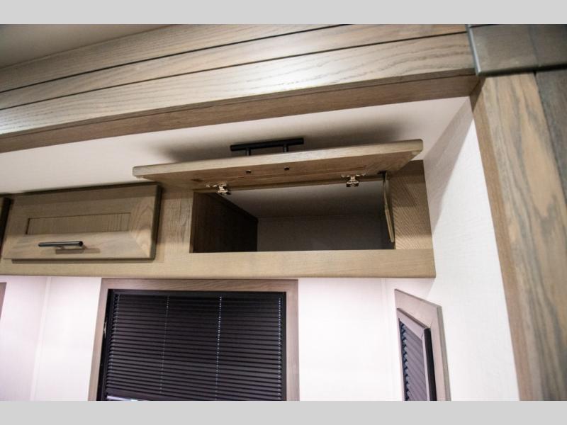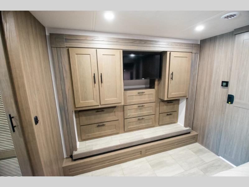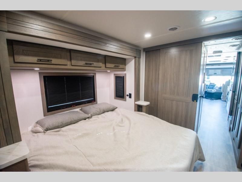 If you're looking for more space when you travel and a little more convenience, this coach may just be perfect for you! Not only will you enjoy a master bedroom with a full rear bath, but your guest will have the mid-coach half bath for easy use! A king bed slide out will provide a great night's rest each nigh, and you'll appreciate dual bedroom wardrobes to keep your clothes organized. There is also a wardrobe with stackable washer and dryer prep if you want the option to make laundry day easier. Head to the kitchen to prepare breakfast on the stainless steel three burner cooktop, or you can use the 30" residential over-the-range microwave. There is a wrap-around booth dinette where you can dine together plus 68" power theater seating across from the 32" 12V TV for easy viewing. This model also includes secure overhead storage above the cab where you can put luggage, lawn equipment, board games, and more!
