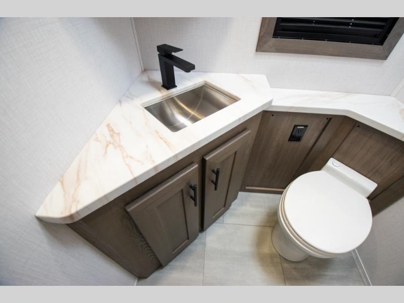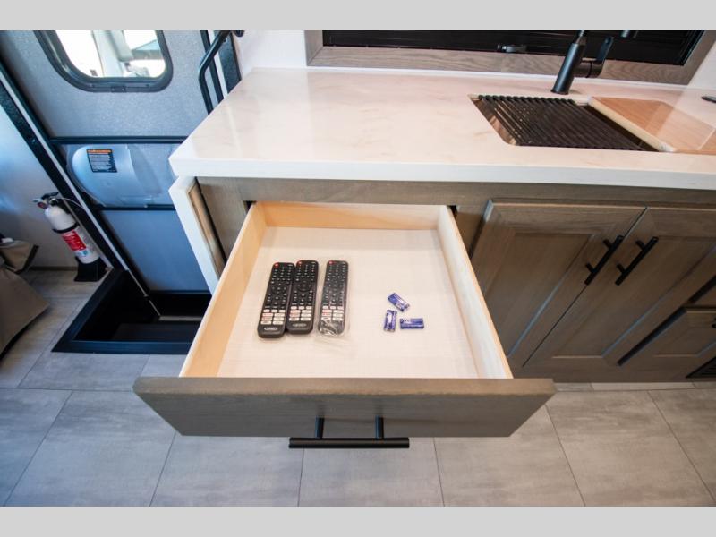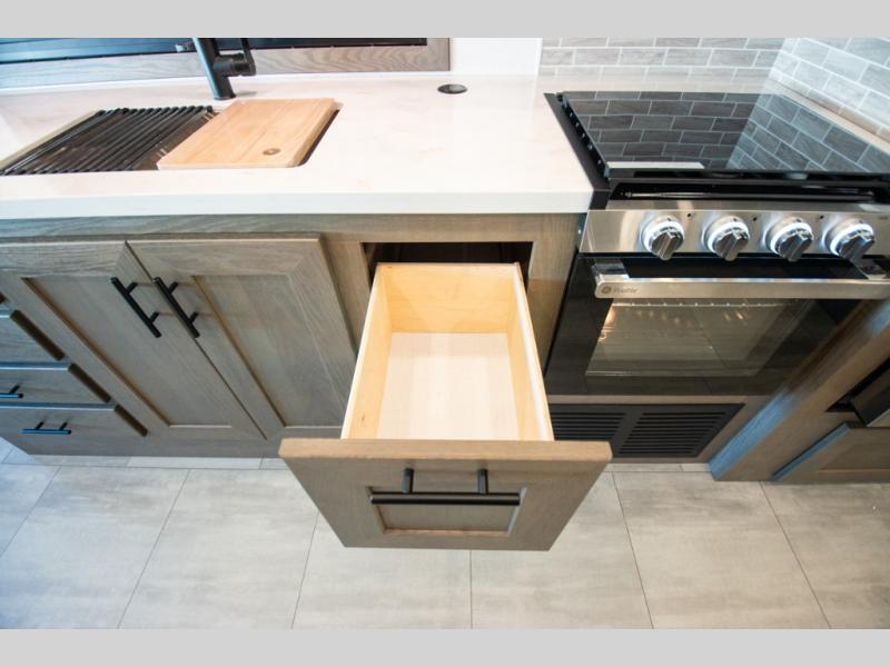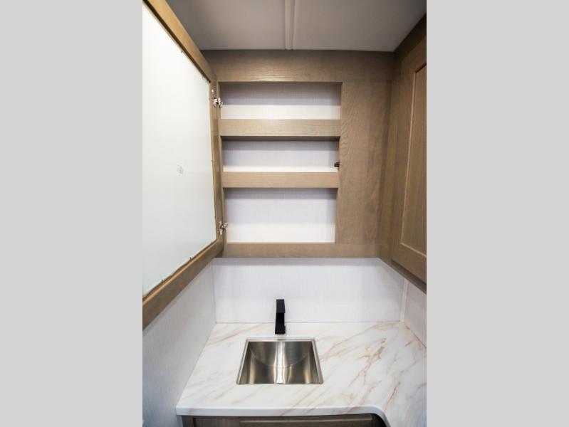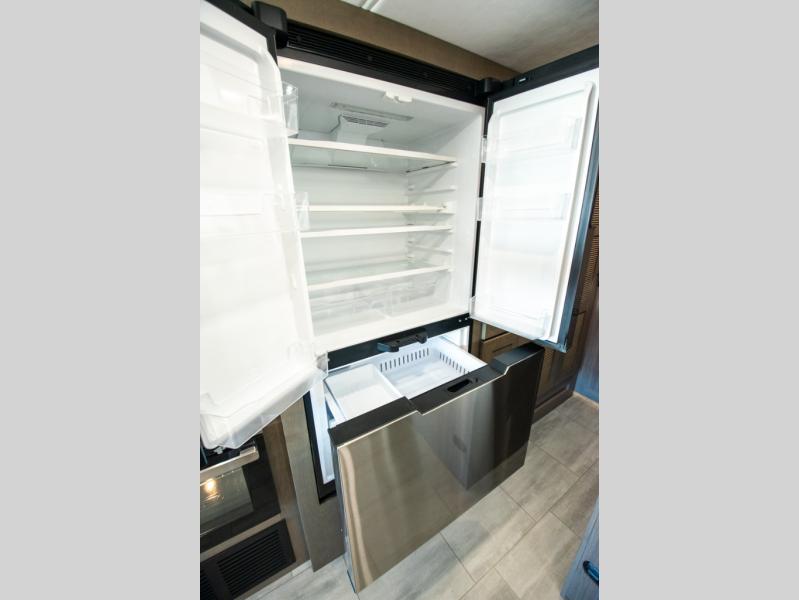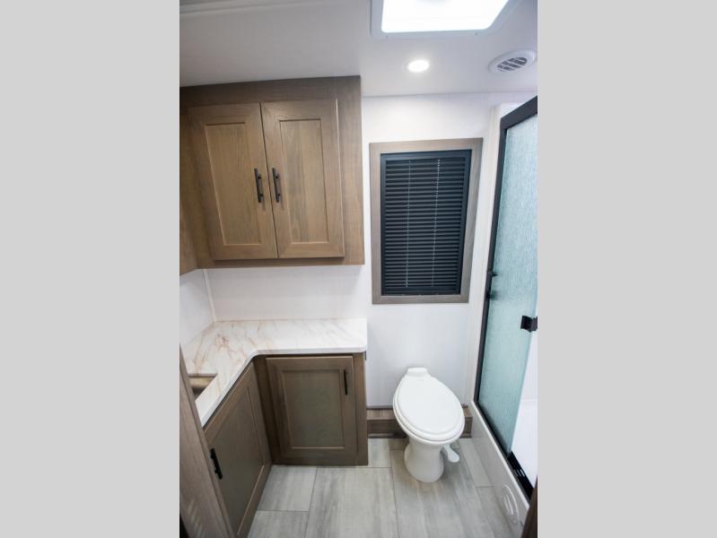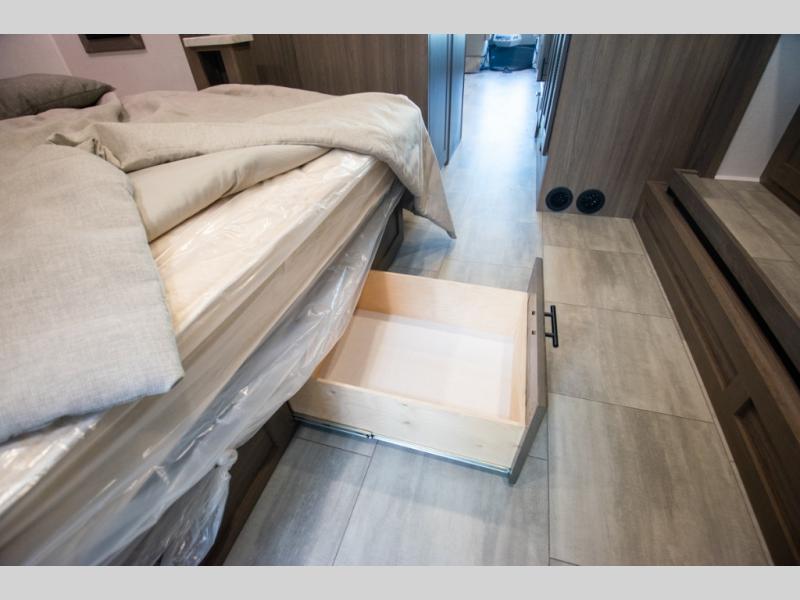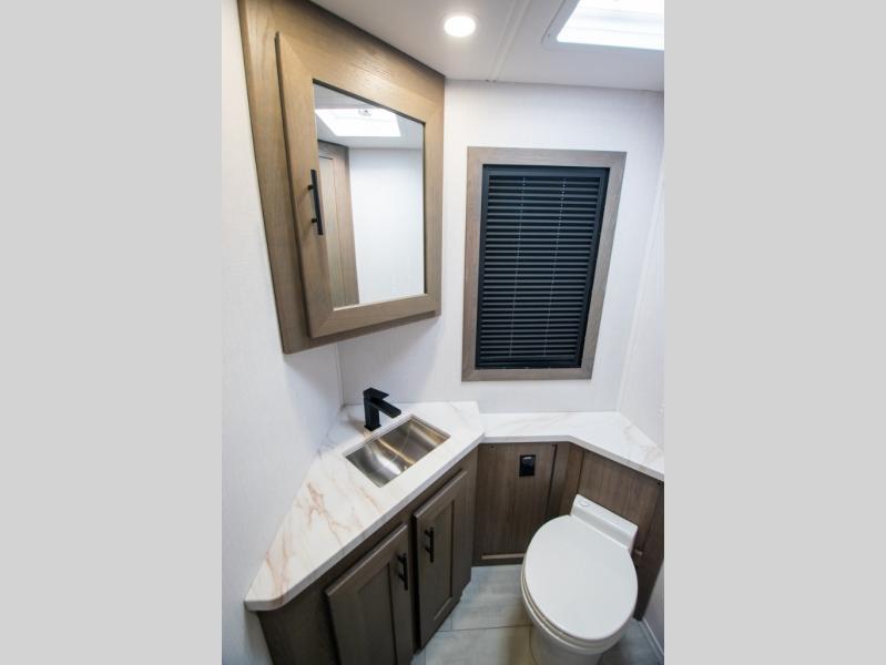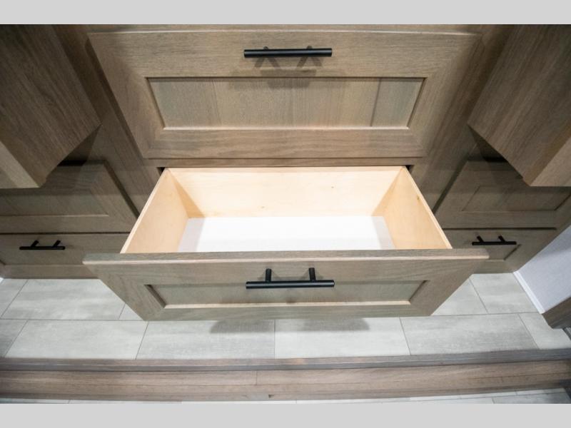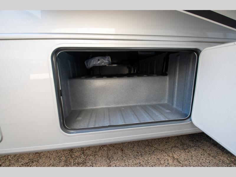 If you're looking for more space when you travel and a little more convenience, this coach may just be perfect for you! Not only will you enjoy a master bedroom with a full rear bath, but your guest will have the mid-coach half bath for easy use! A king bed slide out will provide a great night's rest each nigh, and you'll appreciate dual bedroom wardrobes to keep your clothes organized. There is also a wardrobe with stackable washer and dryer prep if you want the option to make laundry day easier. Head to the kitchen to prepare breakfast on the stainless steel three burner cooktop, or you can use the 30" residential over-the-range microwave. There is a wrap-around booth dinette where you can dine together plus 68" power theater seating across from the 32" 12V TV for easy viewing. This model also includes secure overhead storage above the cab where you can put luggage, lawn equipment, board games, and more!