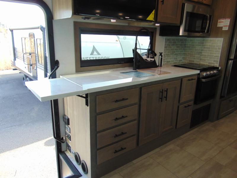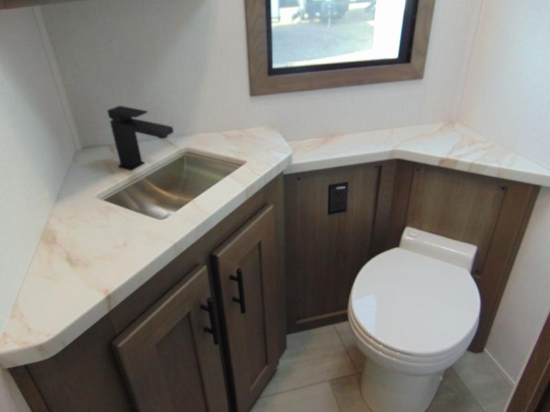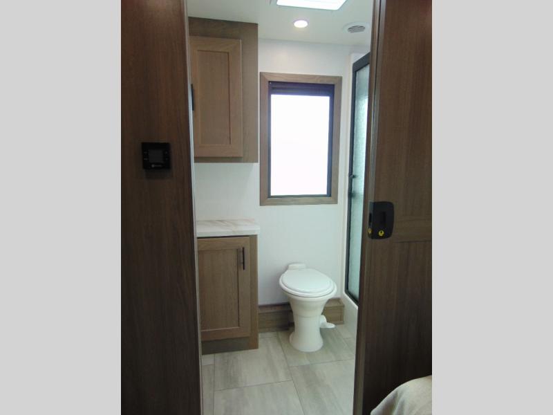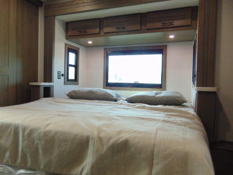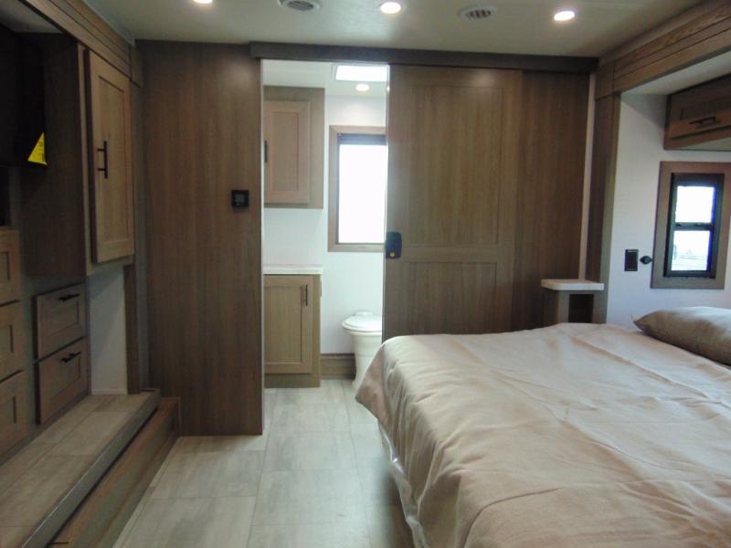 If you're looking for more space when you travel and a little more convenience, this coach may just be perfect for you! Not only will you enjoy a master bedroom with a full rear bath, but your guest will have the mid-coach half bath for easy use! A king bed slide out will provide a great night's rest each nigh, and you'll appreciate dual bedroom wardrobes to keep your clothes organized. There is also a wardrobe with stackable washer and dryer prep if you want the option to make laundry day easier. Head to the kitchen to prepare breakfast on the stainless steel three burner cooktop, or you can use the 30" residential over-the-range microwave. There is a wrap-around booth dinette where you can dine together plus 68" power theater seating across from the 32" 12V TV for easy viewing. This model also includes secure overhead storage above the cab where you can put luggage, lawn equipment, board games, and more!