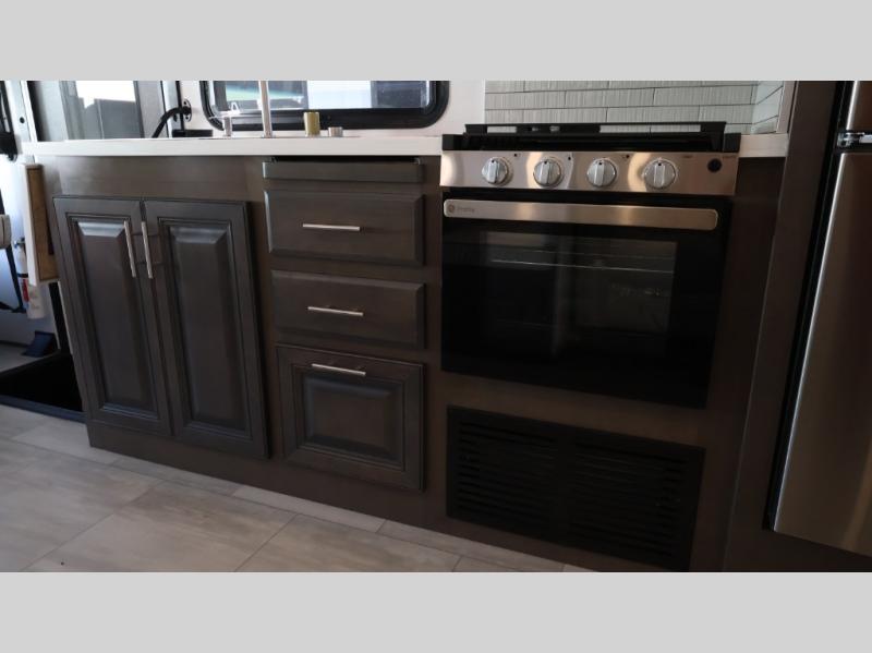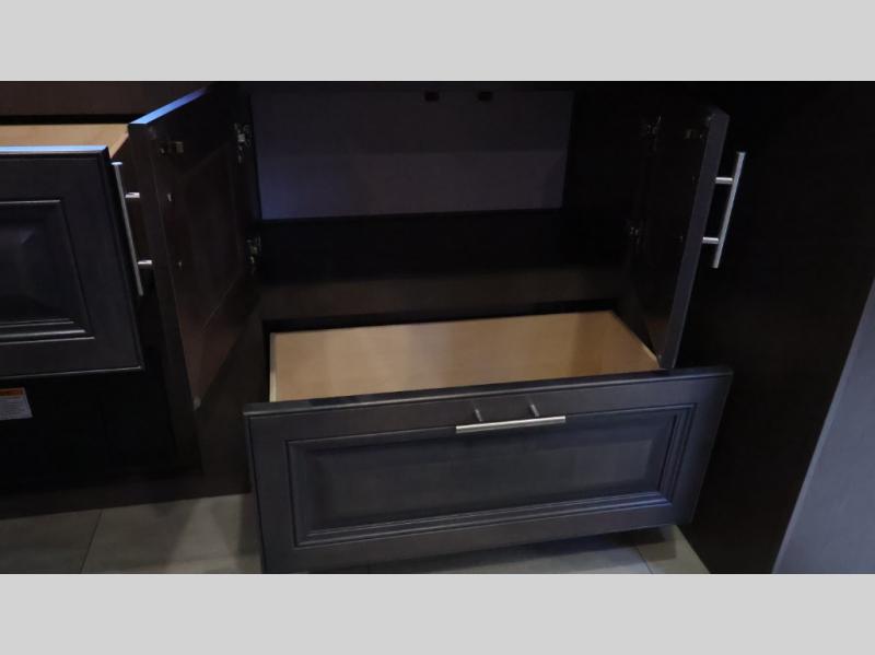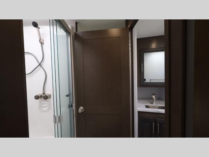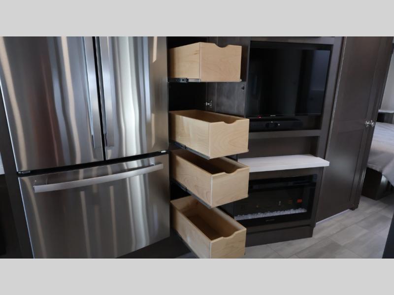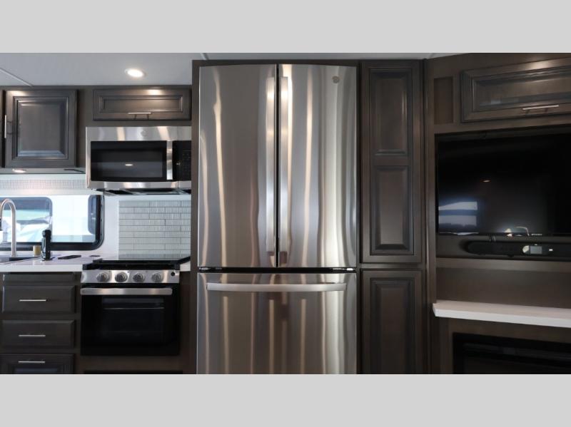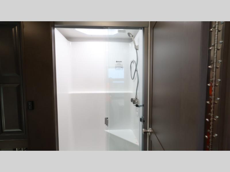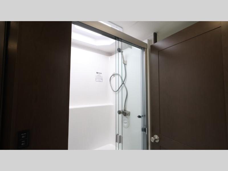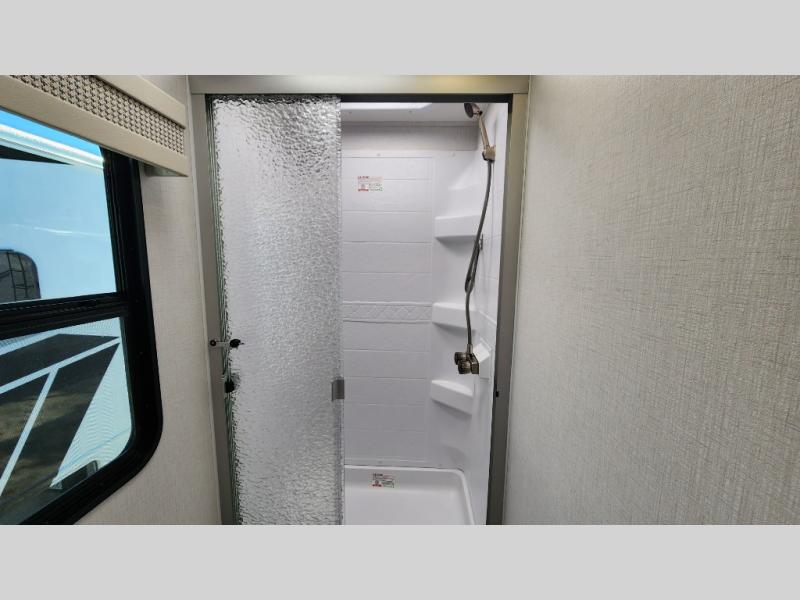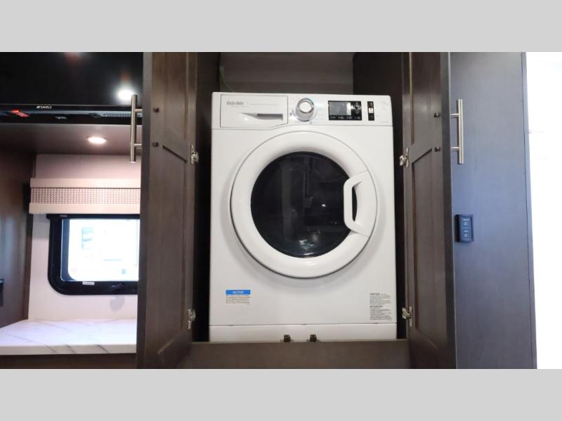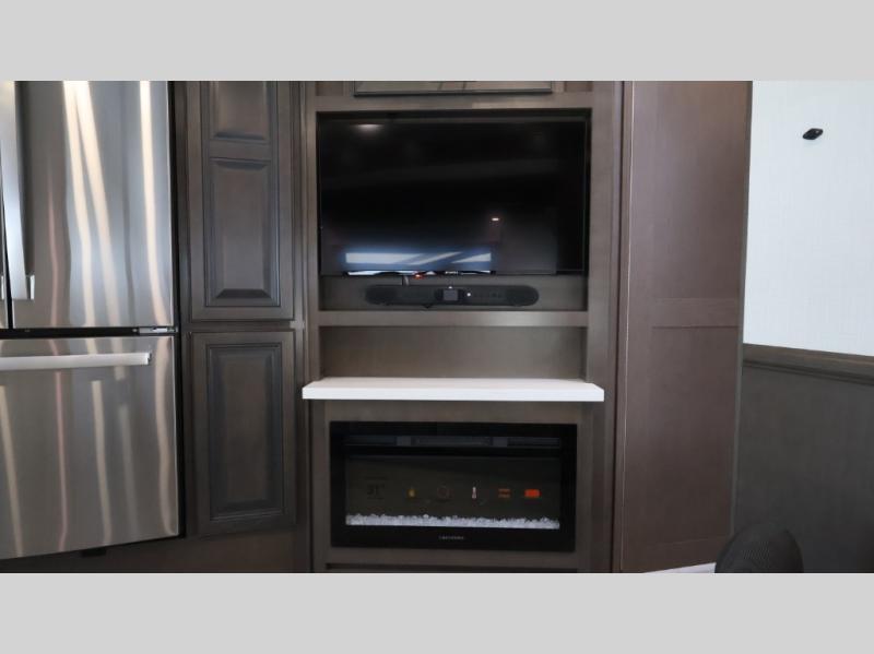 This motorhome is more than just a couple's coach; It's a home on wheels with room for you and even some guests to embark on great adventures. The hide-a-bed sofa and Dream Dinette slide not only offer comfortable places to eat meals and relax but also transform into extra sleeping spaces. You will have your own privacy in the rear master bedroom with a queen bed slide and even a fireplace over the 32" LED Smart TV to enjoy movies in the warmth of this room on those chilly nights. The master bathroom gives you all the comfort you need just a few steps from your bed so you can take a shower and easily get changed. The chef can keep everyone's bellies full of delicious meals with the three-burner cooktop, the stainless steel residential refrigerator, and the pantry with shelves, plus there is a stainless steel microwave for popcorn on movie night!