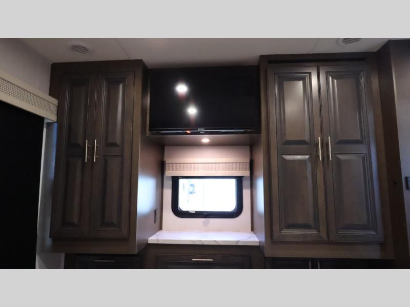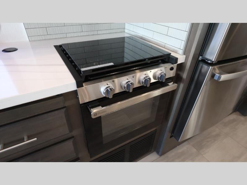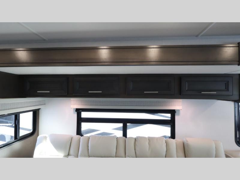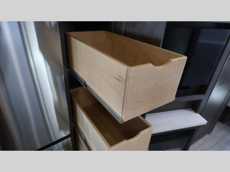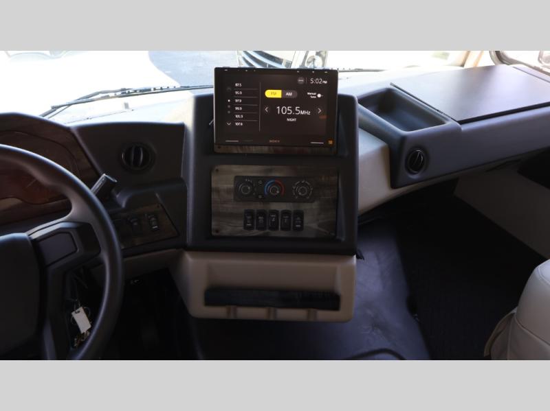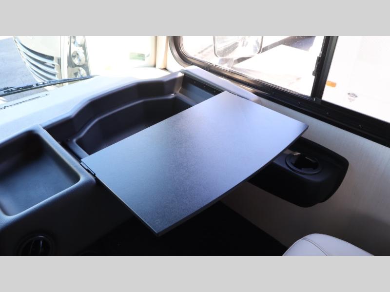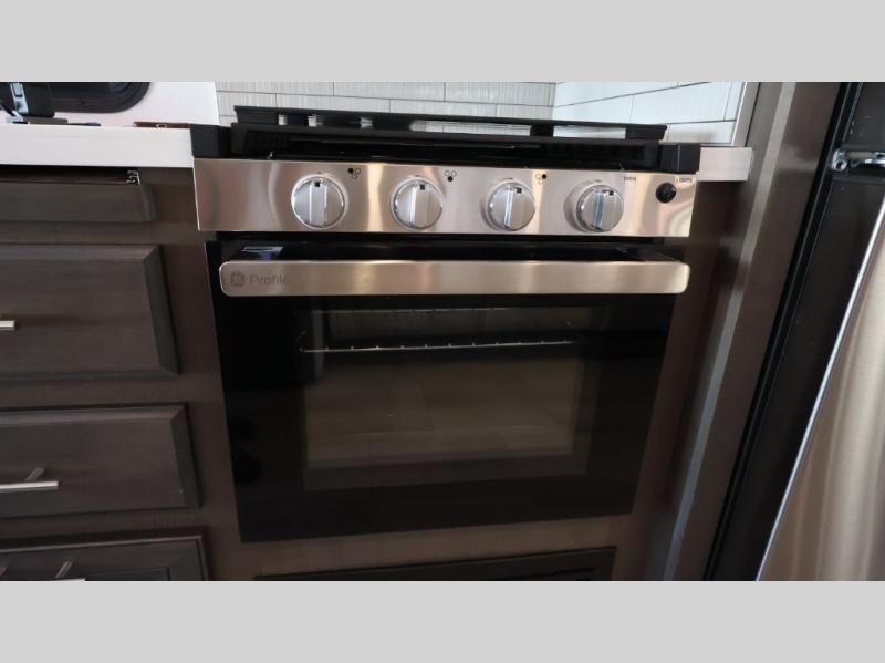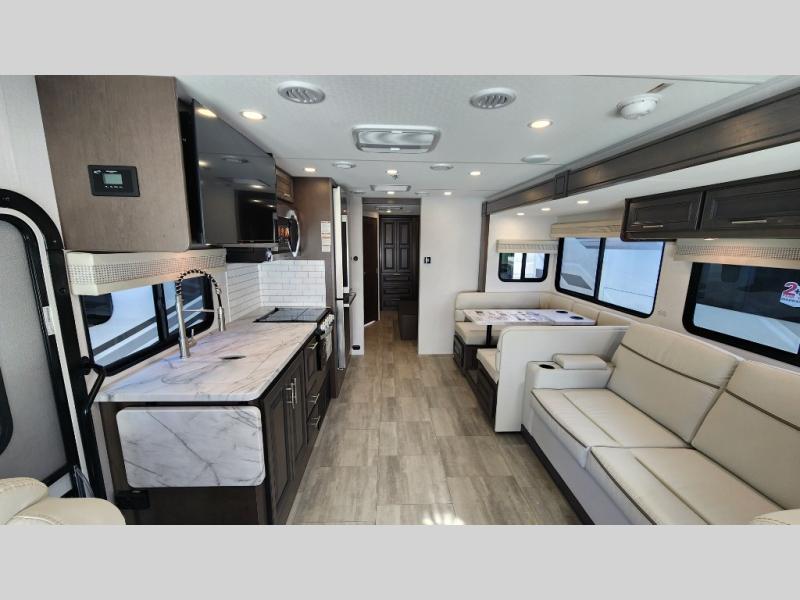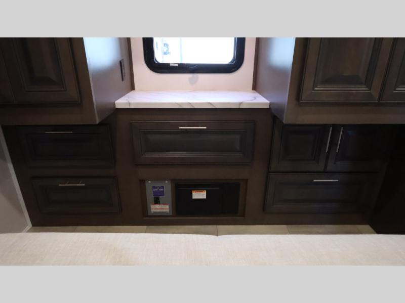 This motorhome is more than just a couple's coach; It's a home on wheels with room for you and even some guests to embark on great adventures. The hide-a-bed sofa and Dream Dinette slide not only offer comfortable places to eat meals and relax but also transform into extra sleeping spaces. You will have your own privacy in the rear master bedroom with a queen bed slide and even a fireplace over the 32" LED Smart TV to enjoy movies in the warmth of this room on those chilly nights. The master bathroom gives you all the comfort you need just a few steps from your bed so you can take a shower and easily get changed. The chef can keep everyone's bellies full of delicious meals with the three-burner cooktop, the stainless steel residential refrigerator, and the pantry with shelves, plus there is a stainless steel microwave for popcorn on movie night!