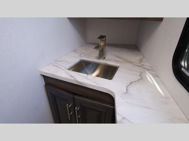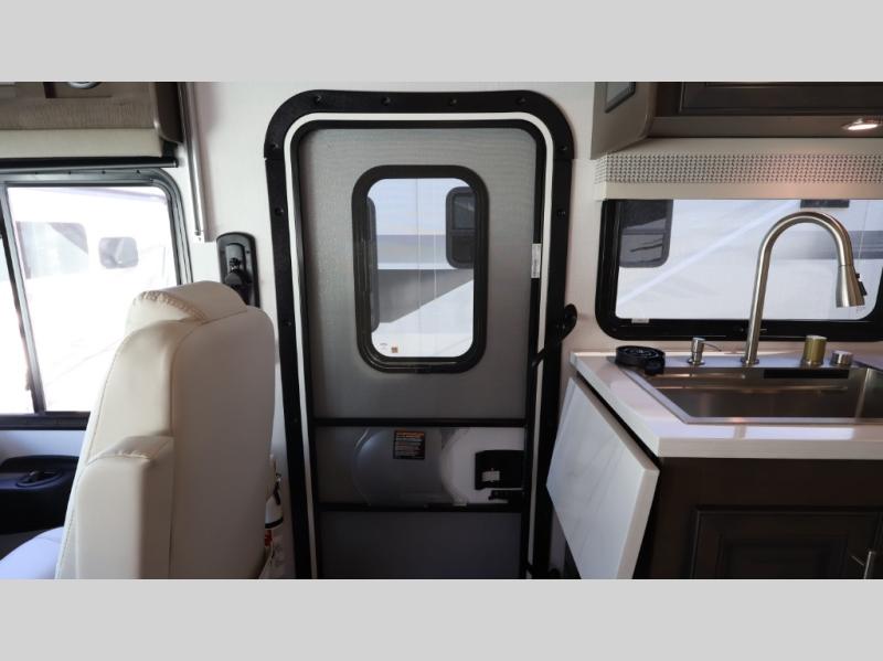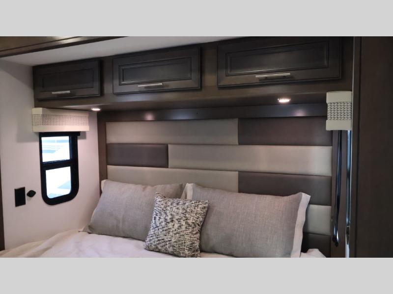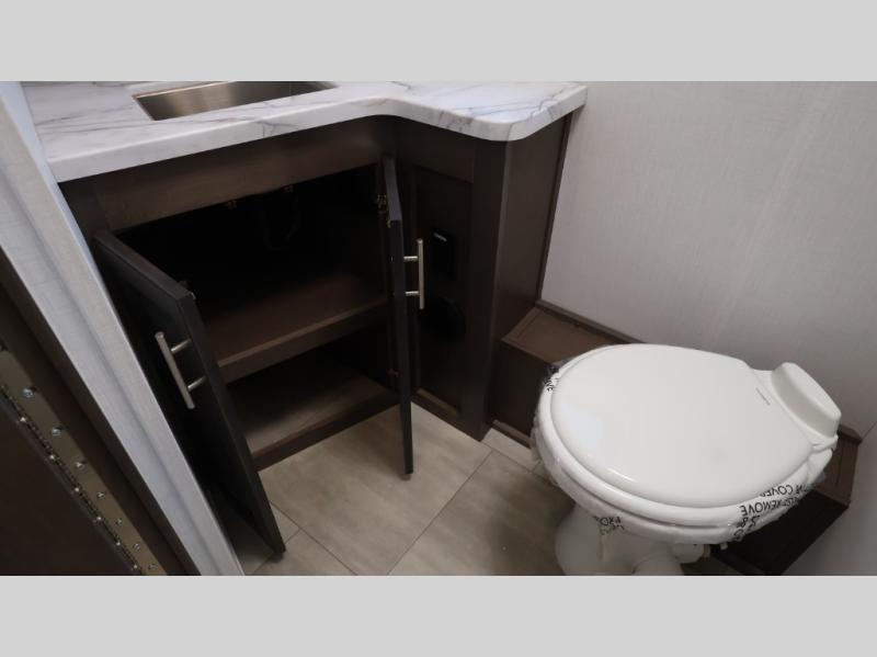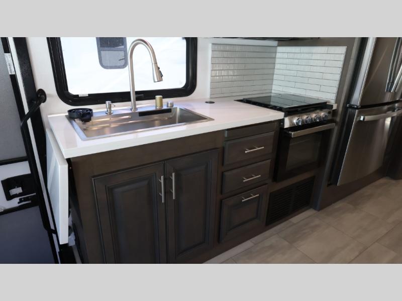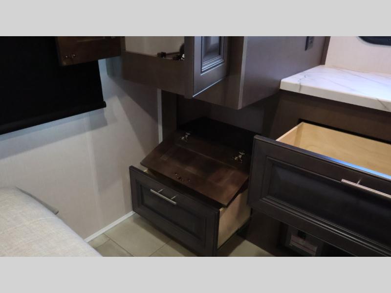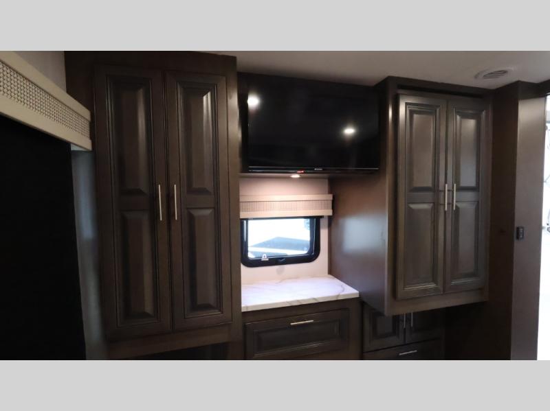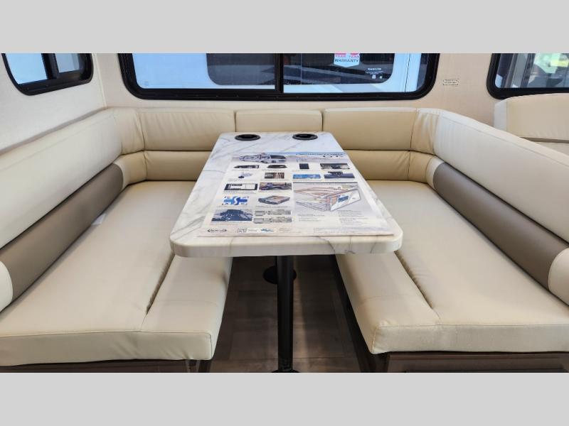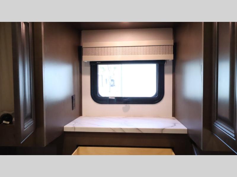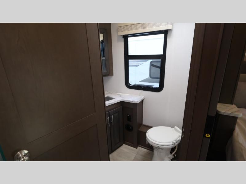 This motorhome is more than just a couple's coach; It's a home on wheels with room for you and even some guests to embark on great adventures. The hide-a-bed sofa and Dream Dinette slide not only offer comfortable places to eat meals and relax but also transform into extra sleeping spaces. You will have your own privacy in the rear master bedroom with a queen bed slide and even a fireplace over the 32" LED Smart TV to enjoy movies in the warmth of this room on those chilly nights. The master bathroom gives you all the comfort you need just a few steps from your bed so you can take a shower and easily get changed. The chef can keep everyone's bellies full of delicious meals with the three-burner cooktop, the stainless steel residential refrigerator, and the pantry with shelves, plus there is a stainless steel microwave for popcorn on movie night!