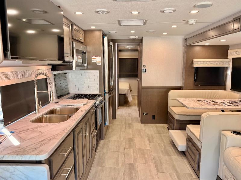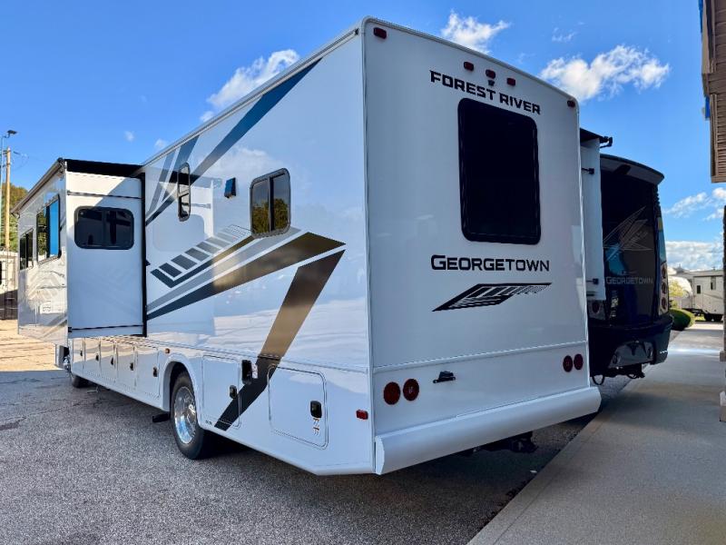 These Forest River Georgetown 3 Series Class A gas motorhomes have been engineered for the road and designed for the driver! Their construction consists of a multi-layered laminated roof system that includes aluminum framing, a crowned fiberglass roof, and block foam insulation. The vacuum bonded gel coated sidewalls, the front cockpit steel structure system and the steel firewall are sure to help with durability and stability. With a hydraulic 4-point leveling system, you can be sure your unit will stay level everywhere you set up. The MORryde 1 1/2" steel truss upfit chassis will hold your unit together for years of fun. A few key features you will appreciate having include a 360 Plus Winegard WiFi to stay connected, a Sony 10" entertainment system to play your favorite tunes, and an exterior solar panel with a controller for off-grid capabilities. Come find your favorite one today!