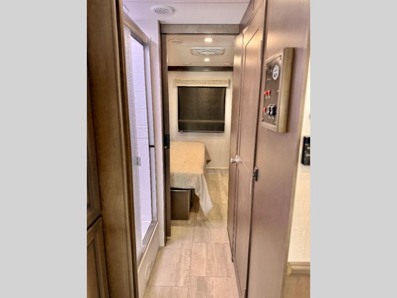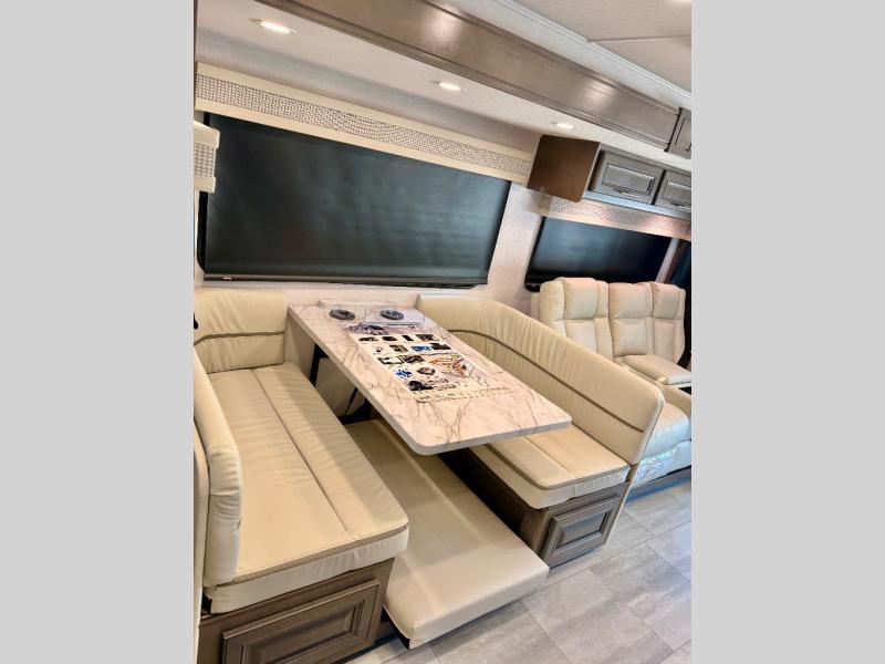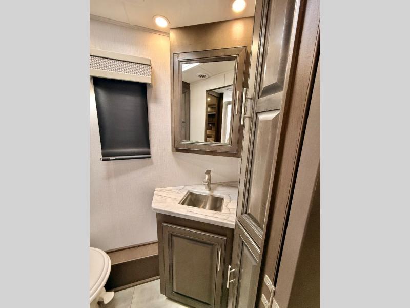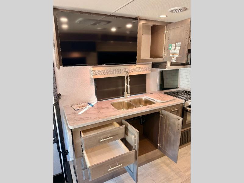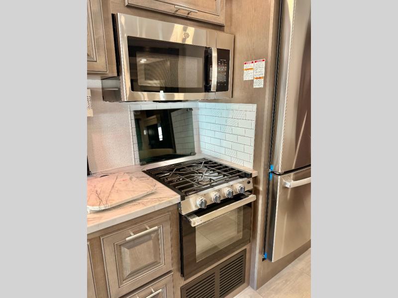 This motorhome is more than just a couple's coach; It's a home on wheels with room for three to four more guests for never ending fun. The hide-a-bed sofa and Dream Dinette slide not only offer comfortable places to eat meals and relax but also transform into extra sleeping spaces. You will have your own privacy in the rear private bedroom with a king bed slide and two closets on either side of a dresser with a TV. The separated bathroom makes it easy for one person to freshen up in the shower while another uses the private toilet and sink with two linen closets for your towels. The chef can keep everyone's bellies full of delicious meals with the three-burner cooktop, the stainless steel 3-door residential refrigerator, and the pantry with shelves, plus there is a stainless steel microwave for popcorn on movie night!