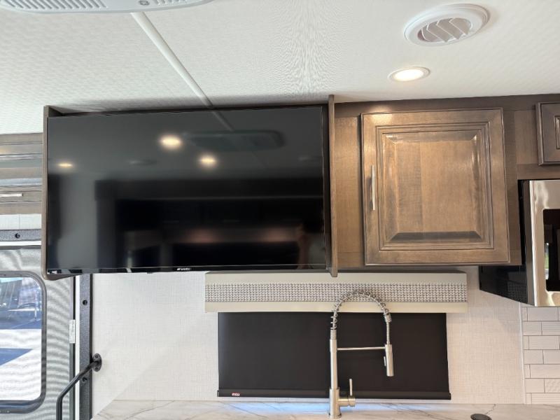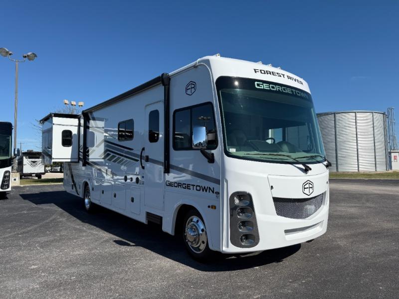 These Forest River Georgetown 3 Series Class A gas motorhomes have been engineered for the road and designed for the driver! Their construction consists of a multi-layered laminated roof system that includes aluminum framing, a crowned fiberglass roof, and block foam insulation. The vacuum bonded gel coated sidewalls, the front cockpit steel structure system and the steel firewall are sure to help with durability and stability. With a hydraulic 4-point leveling system, you can be sure your unit will stay level everywhere you set up. The MORryde 1 1/2" steel truss upfit chassis will hold your unit together for years of fun. A few key features you will appreciate having include a 360 Plus Winegard WiFi to stay connected, a Sony 10" entertainment system to play your favorite tunes, and an exterior solar panel with a controller for off-grid capabilities. Come find your favorite one today!