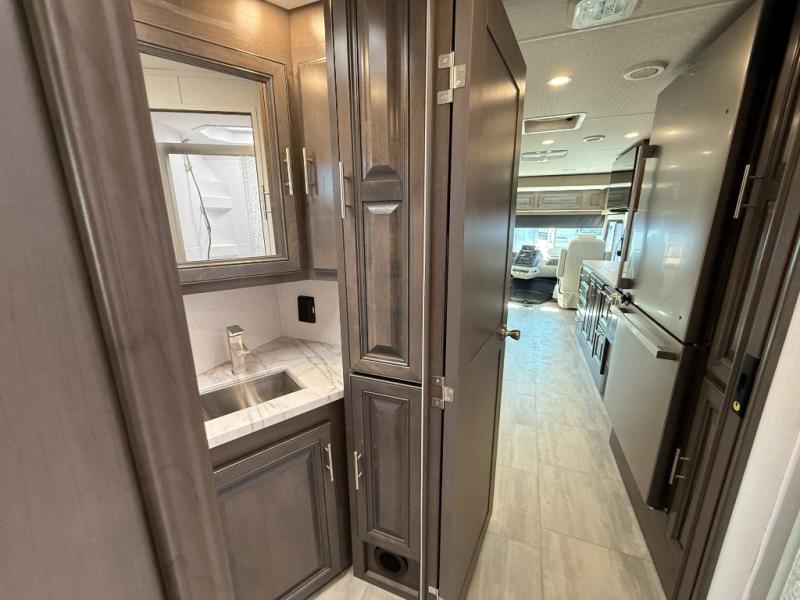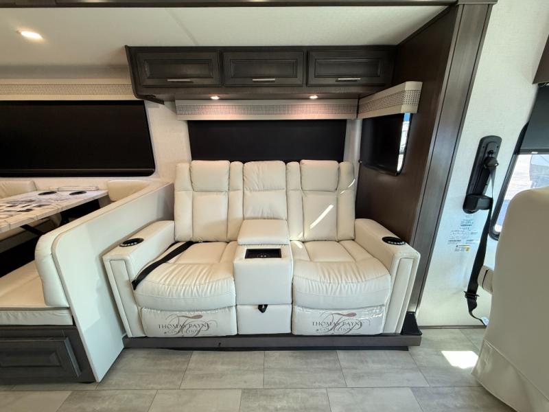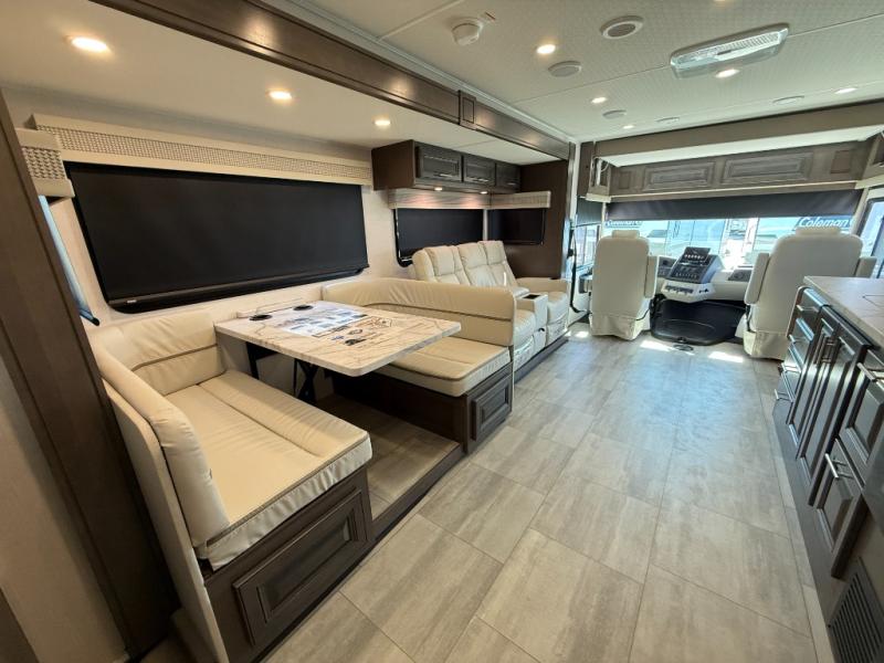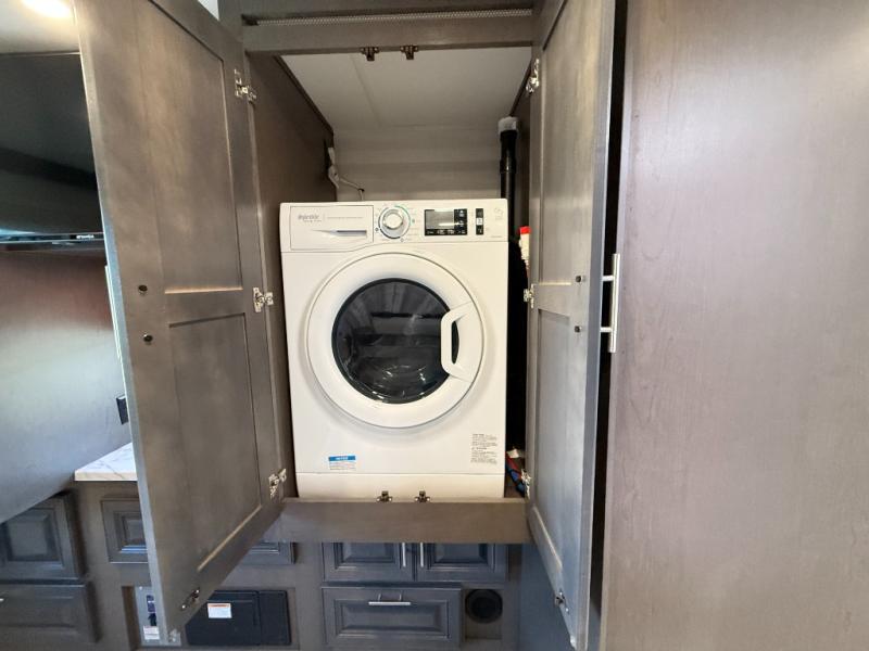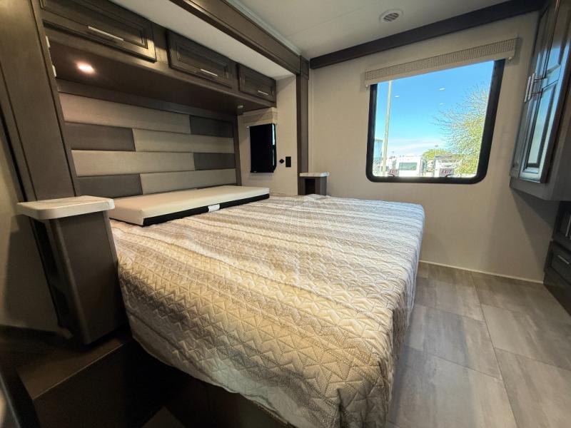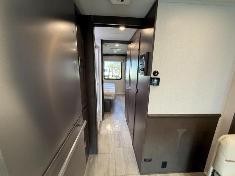 This motorhome is more than just a couple's coach; It's a home on wheels with room for three to four more guests for never ending fun. The hide-a-bed sofa and Dream Dinette slide not only offer comfortable places to eat meals and relax but also transform into extra sleeping spaces. You will have your own privacy in the rear private bedroom with a king bed slide and two closets on either side of a dresser with a TV. The separated bathroom makes it easy for one person to freshen up in the shower while another uses the private toilet and sink with two linen closets for your towels. The chef can keep everyone's bellies full of delicious meals with the three-burner cooktop, the stainless steel residential refrigerator, and the pantry with shelves, plus there is a stainless steel microwave for popcorn on movie night!