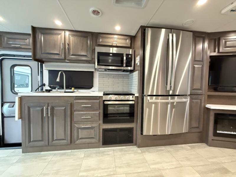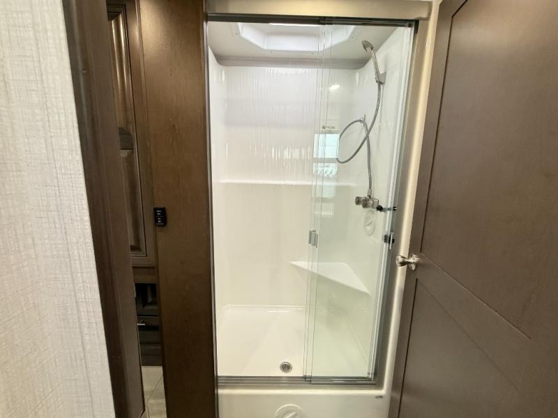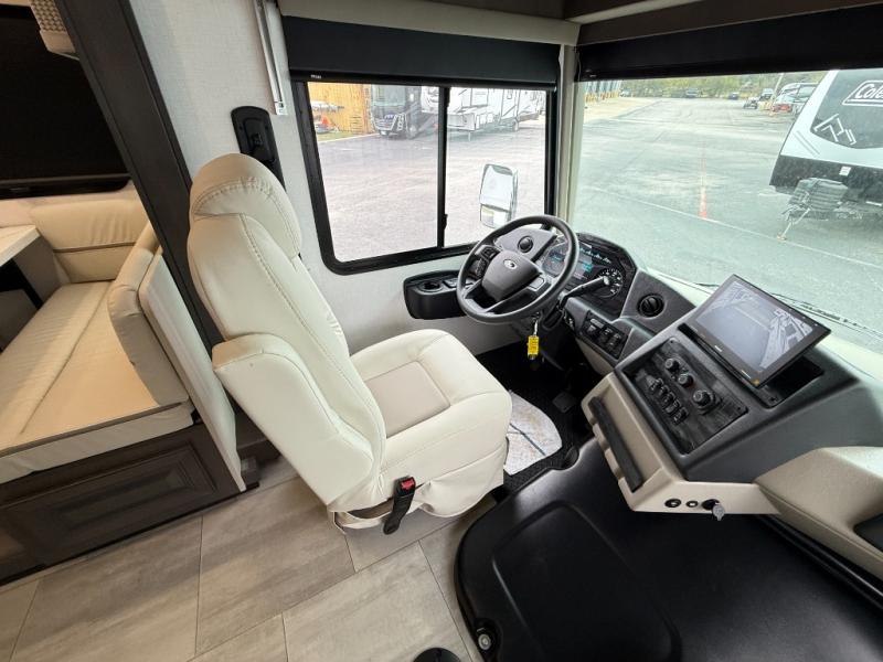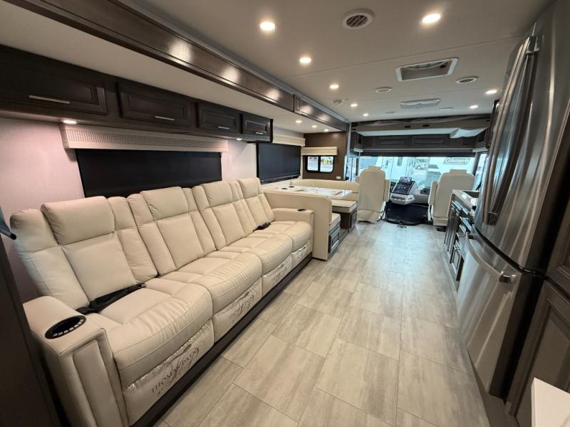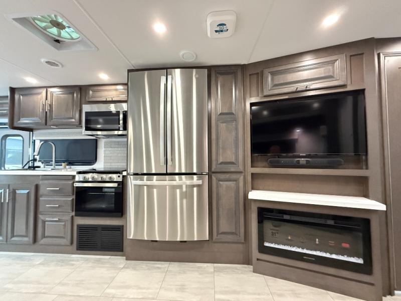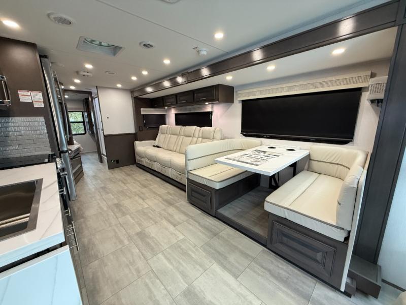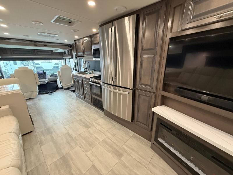 You will love the spacious living entertainment in this motorhome! There is a Thomas Payne 4-person theater seating that reclines with adjustable headrests, heat, massage and has USB outlets. There is also a 5,000 BTU fireplace with a 40" LED TV to watch your favorite movies in true comfort. The kitchen has everything you need to prepare your best home cooked meals including a brush nickel designer faucet with a pull-out spray wand for easy clean up, and you can enjoy all of your meals at the Dream Dinette. You will appreciate having your own private retreat with the rear bedroom which has a 72" x 80" king bed slide across from a dresser with a 32" LED TV, a wardrobe on one side, and another wardrobe on the other with an optional combo washer and dryer. There is also a power front overhead bunk for more sleeping space!
