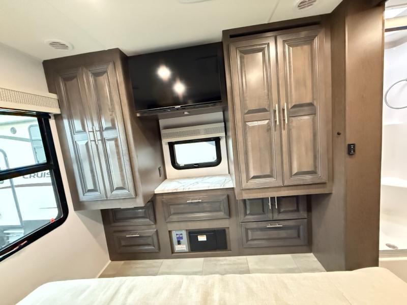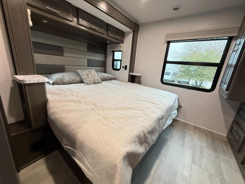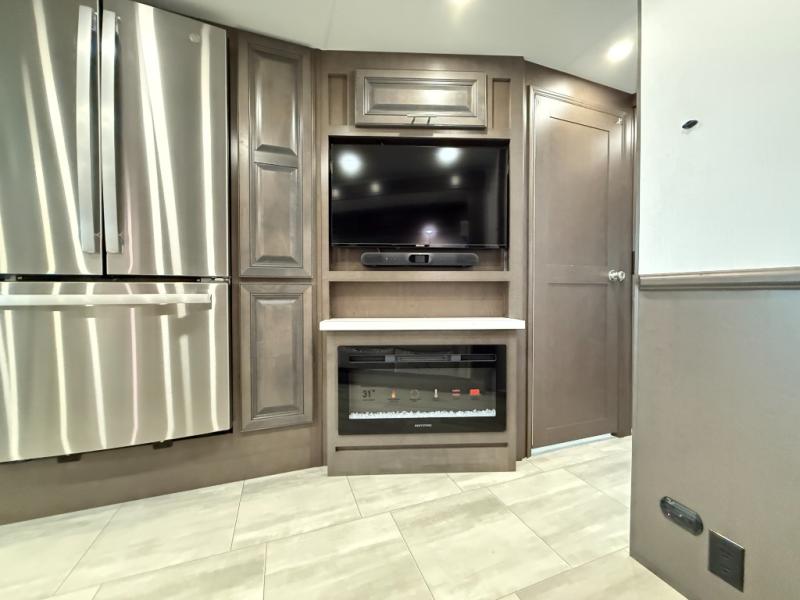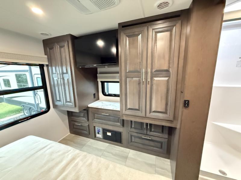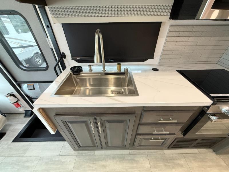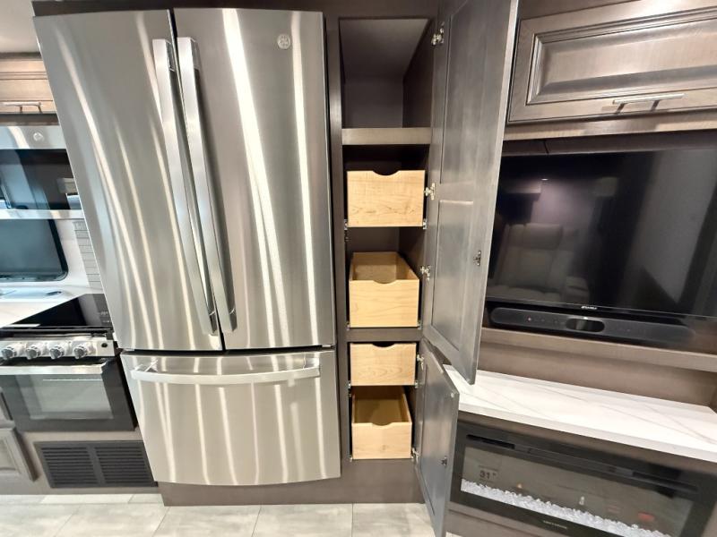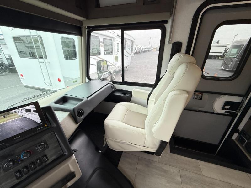 You will love the spacious living entertainment in this motorhome! There is a Thomas Payne 4-person theater seating that reclines with adjustable headrests, heat, massage and has USB outlets. There is also a 5,000 BTU fireplace with a 40" LED TV to watch your favorite movies in true comfort. The kitchen has everything you need to prepare your best home cooked meals including a brush nickel designer faucet with a pull-out spray wand for easy clean up, and you can enjoy all of your meals at the Dream Dinette. You will appreciate having your own private retreat with the rear bedroom which has a 72" x 80" king bed slide across from a dresser with a 32" LED TV, a wardrobe on one side, and another wardrobe on the other with an optional combo washer and dryer. There is also a power front overhead bunk for more sleeping space!