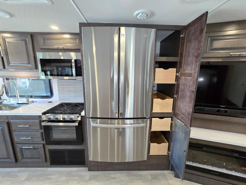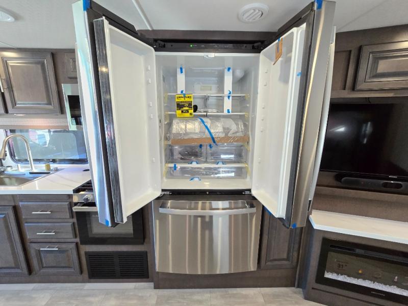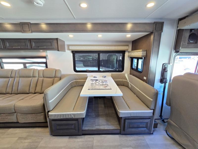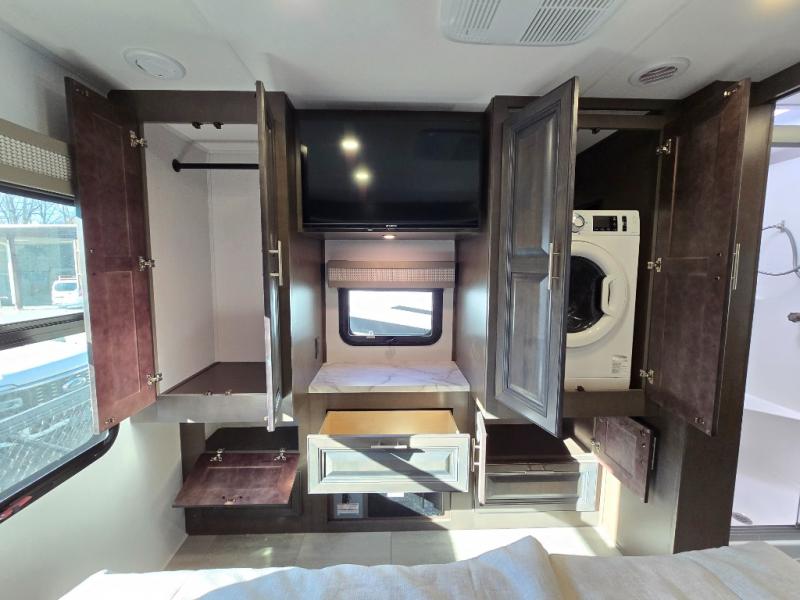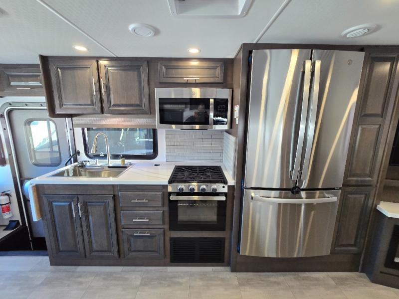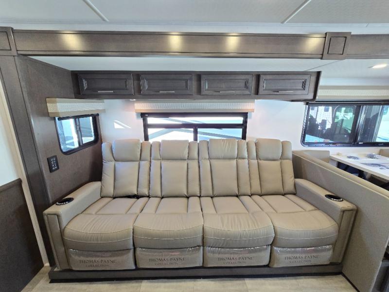 You will love the spacious living entertainment in this motorhome! There is a Thomas Payne 4-person theater seating that reclines with adjustable headrests, heat, massage and has USB outlets. There is also a 5,000 BTU fireplace with a 40" LED TV to watch your favorite movies in true comfort. The kitchen has everything you need to prepare your best home cooked meals including a brush nickel designer faucet with a pull-out spray wand for easy clean up, and you can enjoy all of your meals at the Dream Dinette. You will appreciate having your own private retreat with the rear bedroom which has a 72" x 80" king bed slide across from a dresser with a 32" LED TV, a wardrobe on one side, and another wardrobe on the other with an optional combo washer and dryer. There is also a power front overhead bunk for more sleeping space!