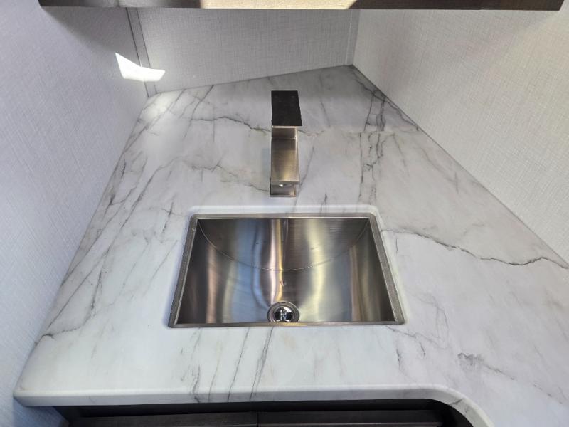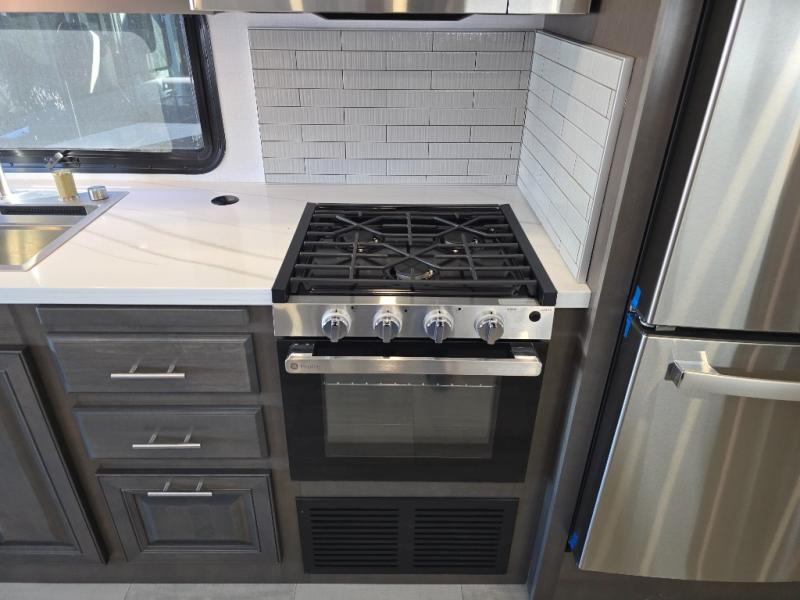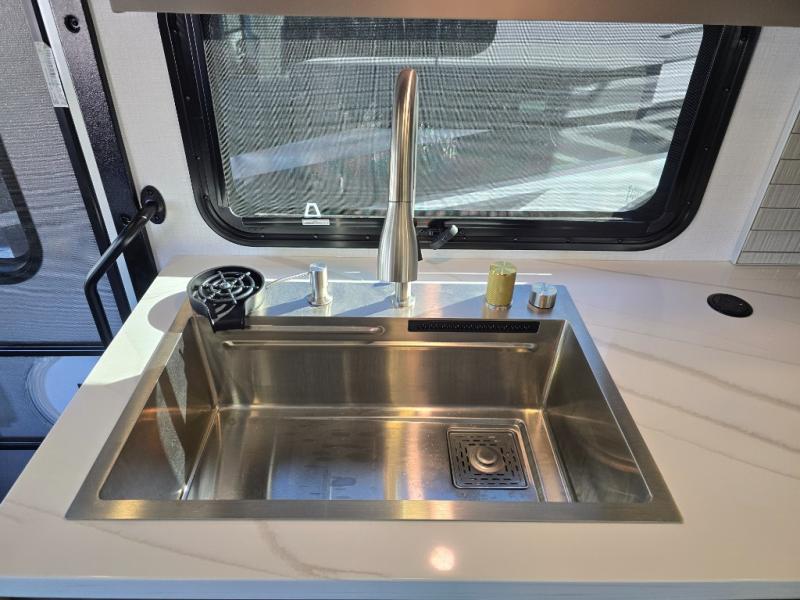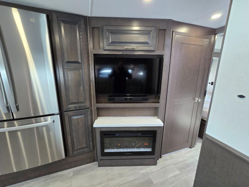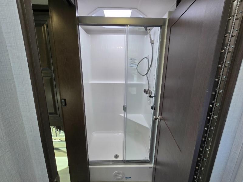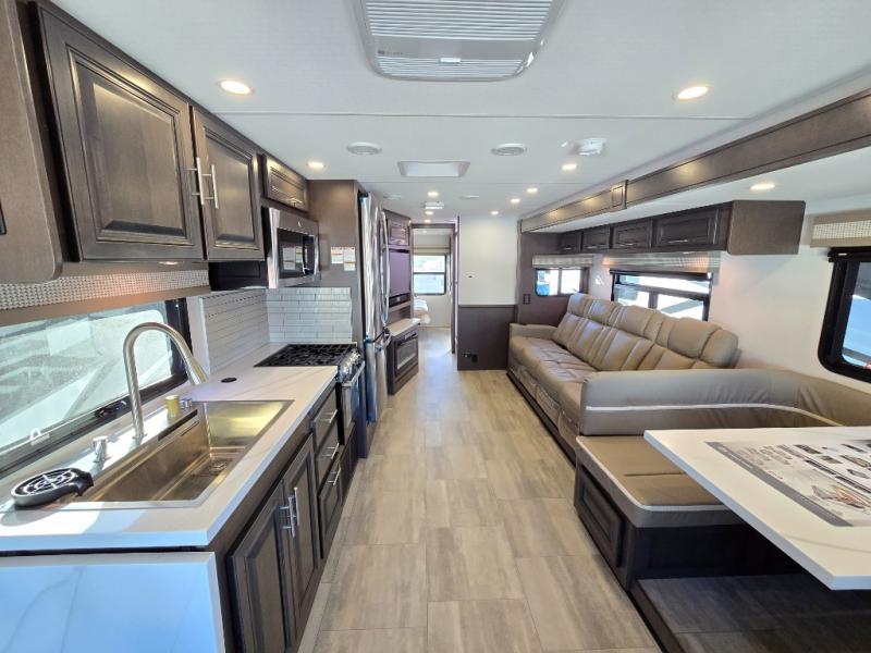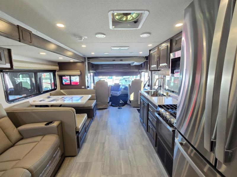 You will love the spacious living entertainment in this motorhome! There is a Thomas Payne 4-person theater seating that reclines with adjustable headrests, heat, massage and has USB outlets. There is also a 5,000 BTU fireplace with a 40" LED TV to watch your favorite movies in true comfort. The kitchen has everything you need to prepare your best home cooked meals including a brush nickel designer faucet with a pull-out spray wand for easy clean up, and you can enjoy all of your meals at the Dream Dinette. You will appreciate having your own private retreat with the rear bedroom which has a 72" x 80" king bed slide across from a dresser with a 32" LED TV, a wardrobe on one side, and another wardrobe on the other with an optional combo washer and dryer. There is also a power front overhead bunk for more sleeping space!