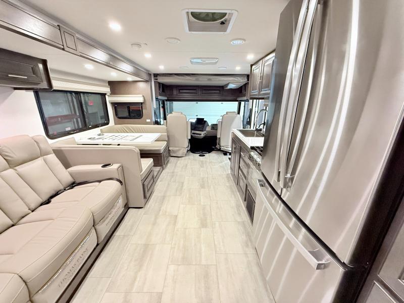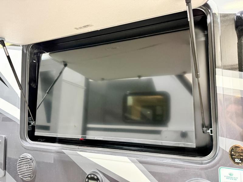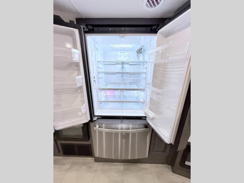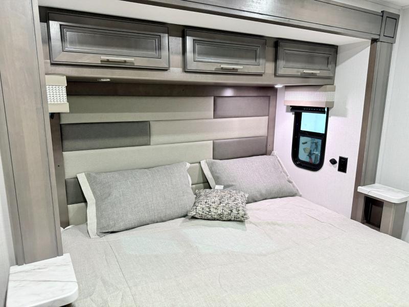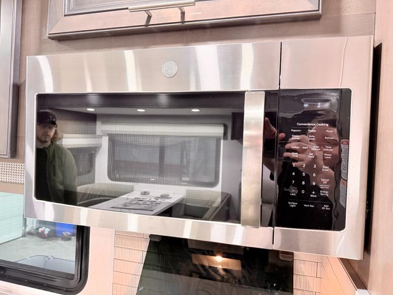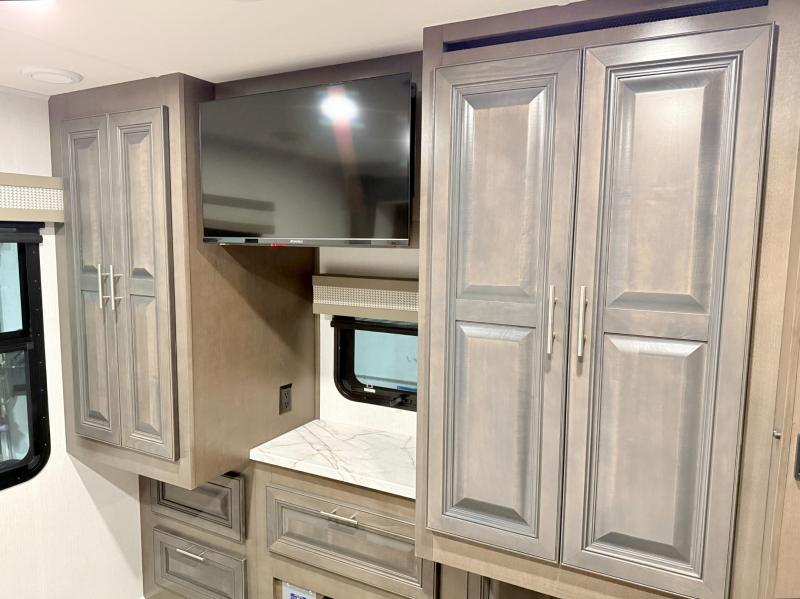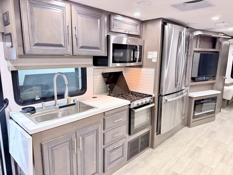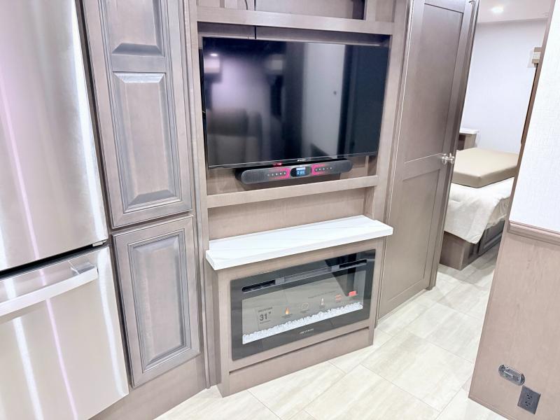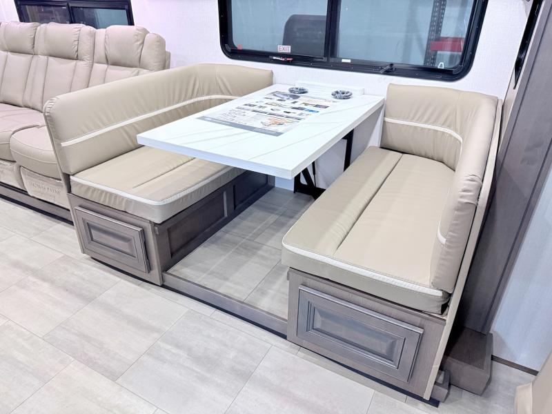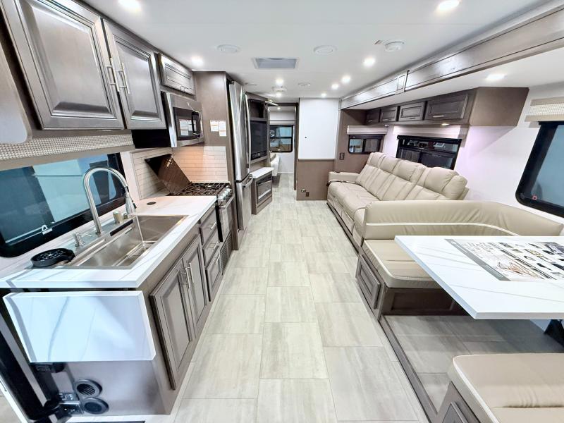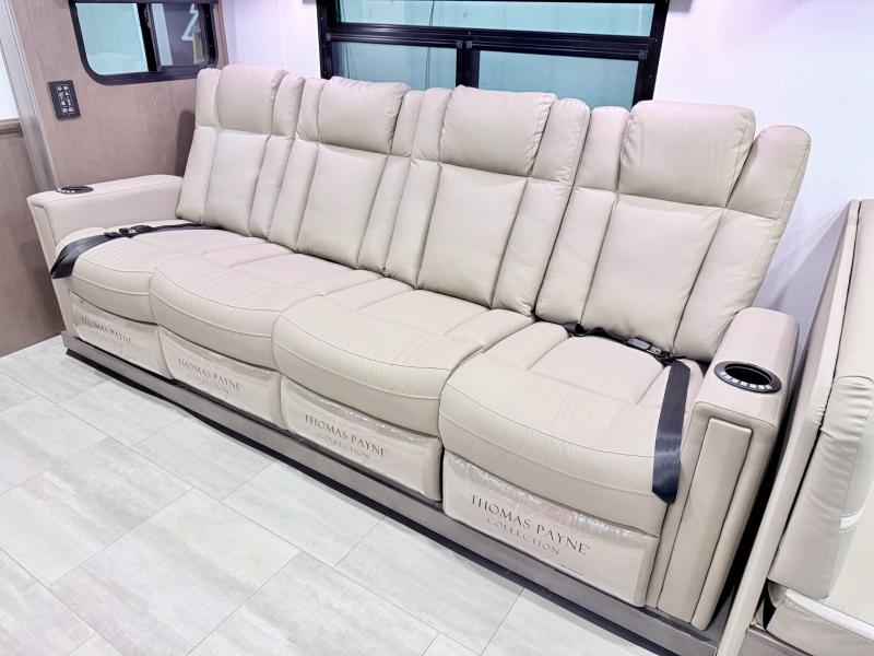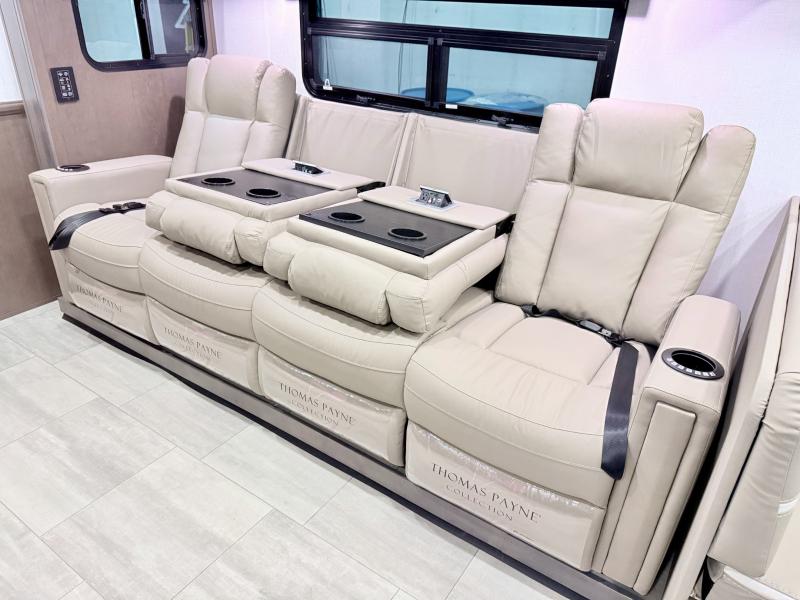 You will love the spacious living entertainment in this motorhome! There is a Thomas Payne 4-person theater seating that reclines with adjustable headrests, heat, massage and has USB outlets. There is also a 5,000 BTU fireplace with a 40" LED TV to watch your favorite movies in true comfort. The kitchen has everything you need to prepare your best home cooked meals including a brush nickel designer faucet with a pull-out spray wand for easy clean up, and you can enjoy all of your meals at the Dream Dinette. You will appreciate having your own private retreat with the rear bedroom which has a 72" x 80" king bed slide across from a dresser with a 32" LED TV, a wardrobe on one side, and another wardrobe on the other with an optional combo washer and dryer. There is also a power front overhead bunk for more sleeping space!