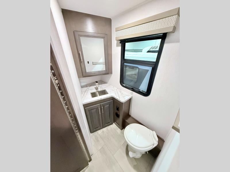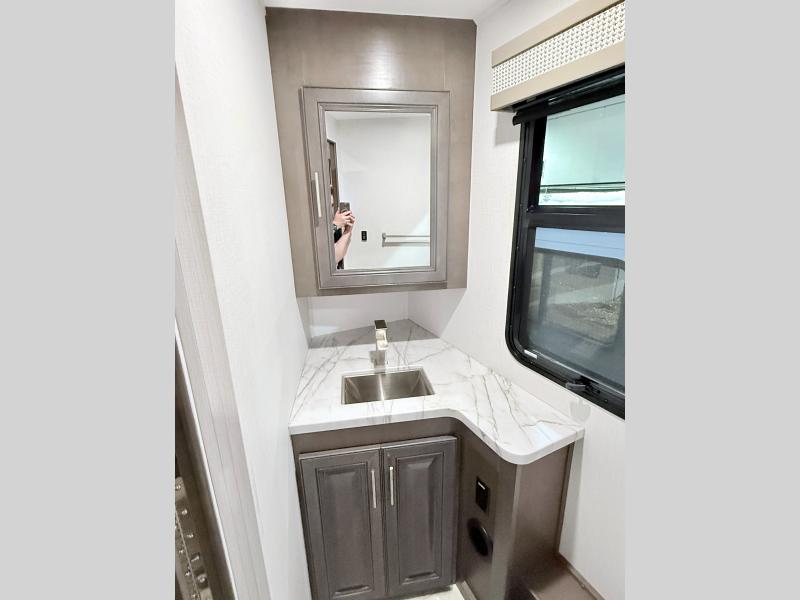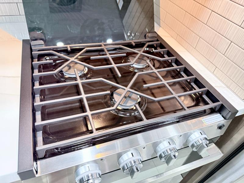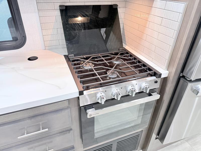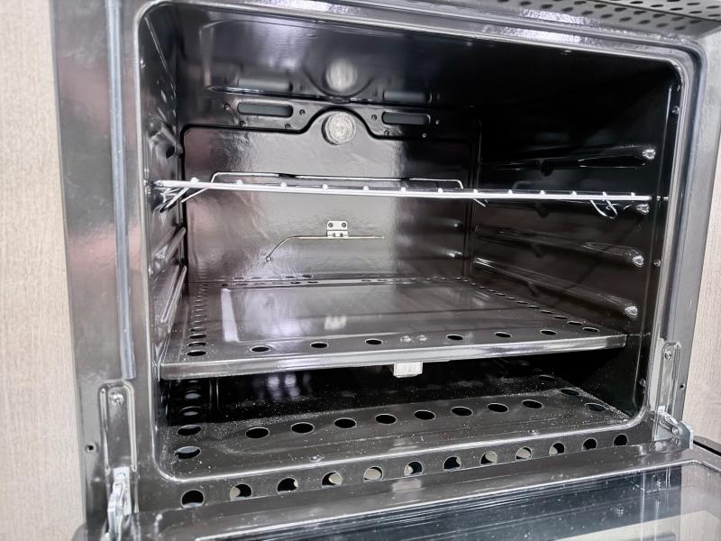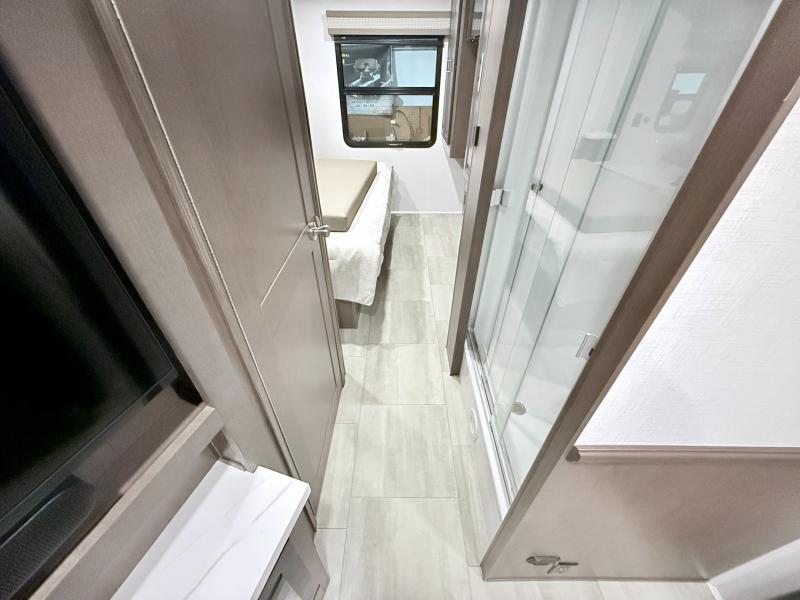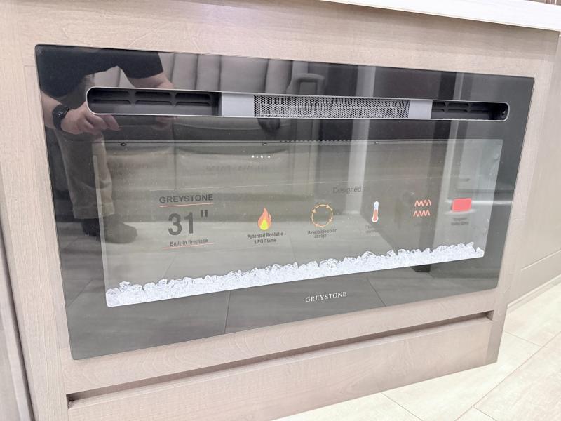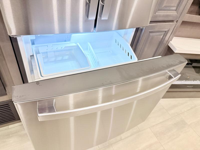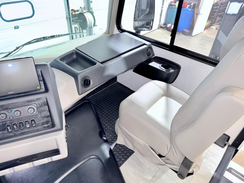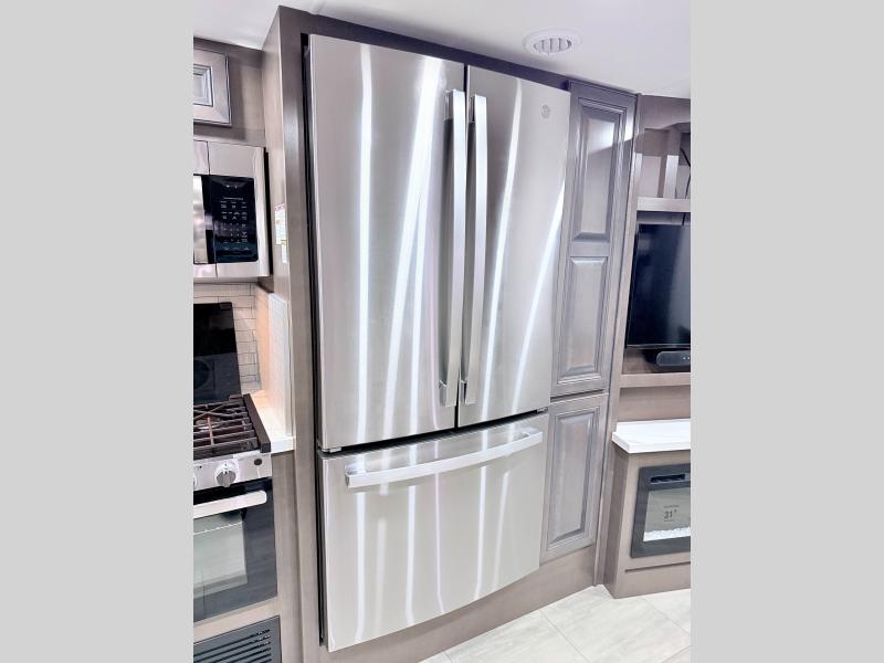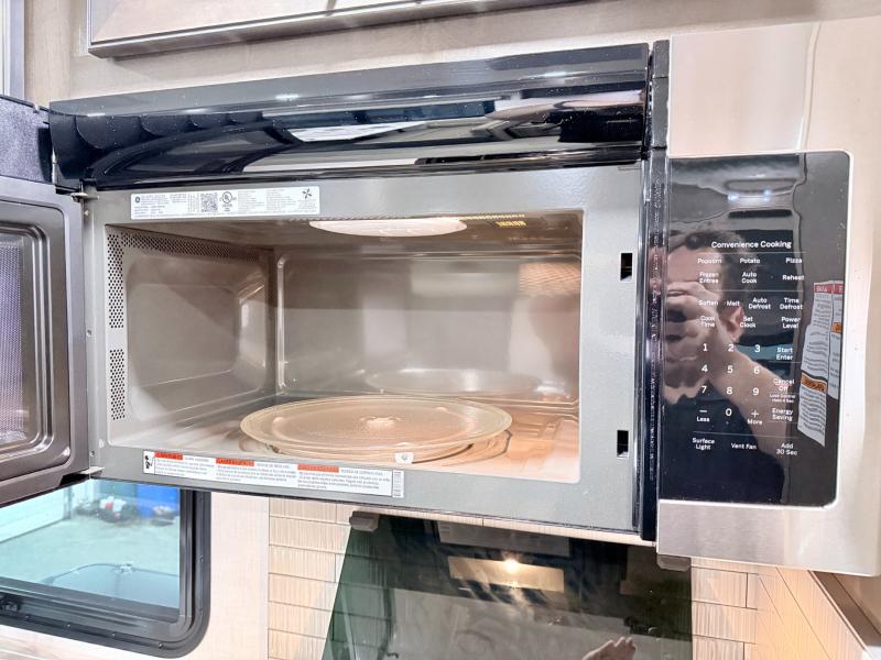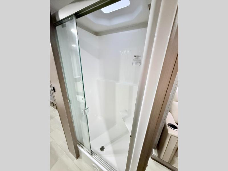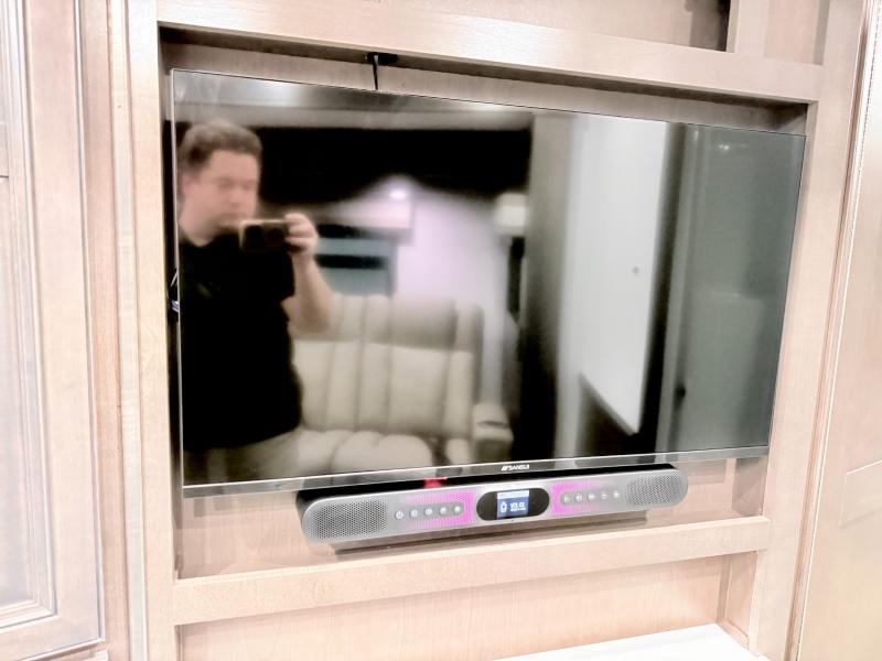 You will love the spacious living entertainment in this motorhome! There is a Thomas Payne 4-person theater seating that reclines with adjustable headrests, heat, massage and has USB outlets. There is also a 5,000 BTU fireplace with a 40" LED TV to watch your favorite movies in true comfort. The kitchen has everything you need to prepare your best home cooked meals including a brush nickel designer faucet with a pull-out spray wand for easy clean up, and you can enjoy all of your meals at the Dream Dinette. You will appreciate having your own private retreat with the rear bedroom which has a 72" x 80" king bed slide across from a dresser with a 32" LED TV, a wardrobe on one side, and another wardrobe on the other with an optional combo washer and dryer. There is also a power front overhead bunk for more sleeping space!