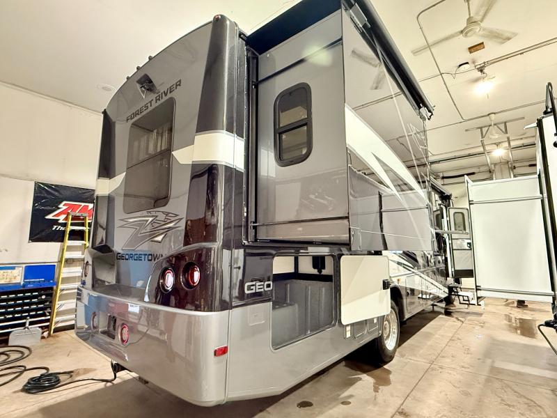 A spacious design and true luxury come together to create these Forest River Georgetown 5 Series Class A gas motorhomes! Their solid surface kitchen countertops, day and night shades throughout, and designer bedspread will have you feeling right at home. The color side and rear cameras help to prevent any dings or bumps while you travel, and the automatic hydraulic leveling jacks will keep your unit leveled wherever you set up. Durable construction consists of a crowned roof, 2" aluminum framed vacuum bonded gel coated sidewalls, plus high density block foam insulation that will allow you to travel at any time of the year. You will appreciate the 50 Amp service, two house batteries, and 6,000-watt Yamaha generator to keep you powered up. An outside shower is also included on all models, along with rotocast storage compartments with drains, a power awning, and so much more!