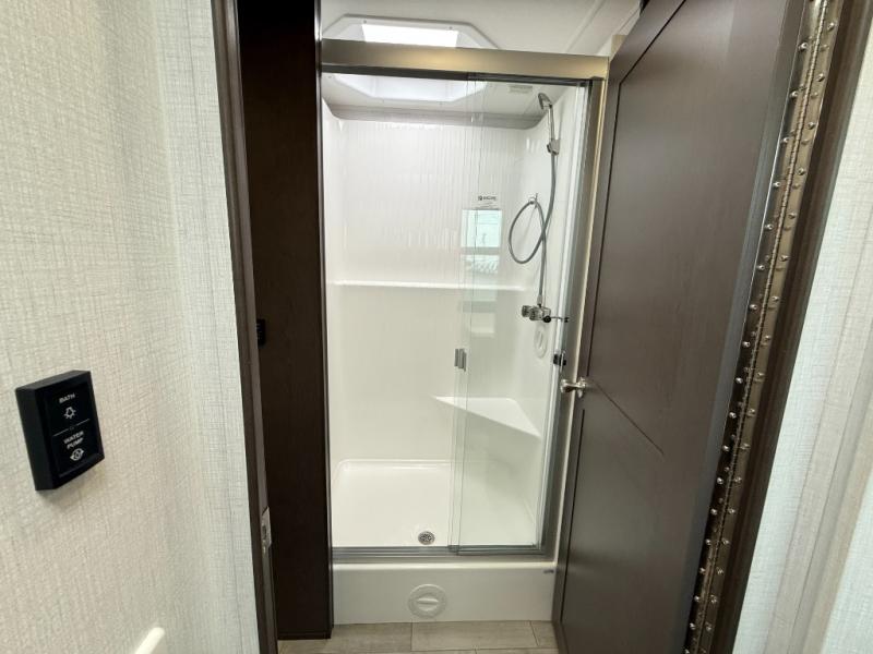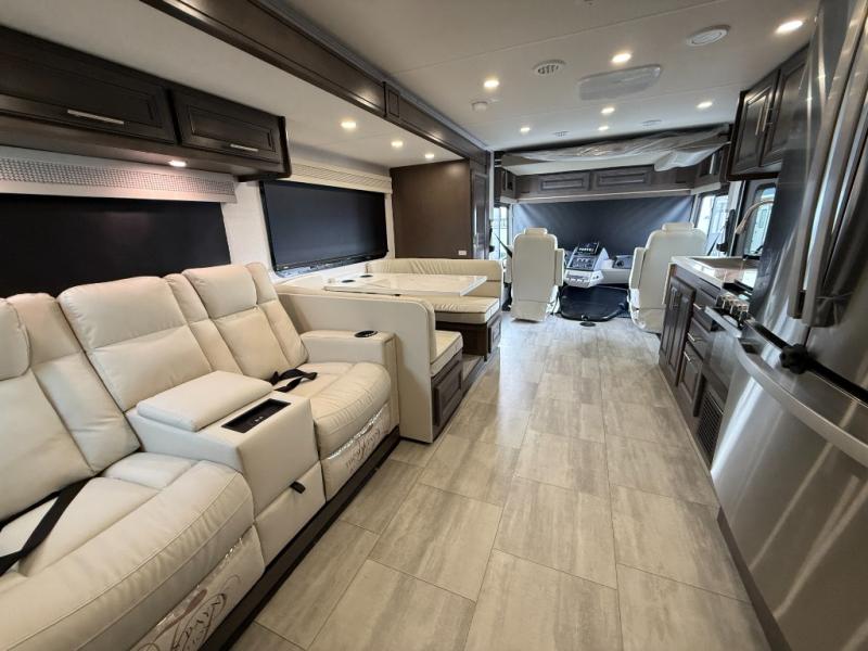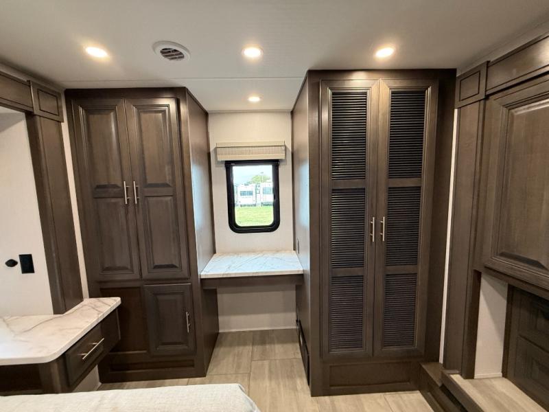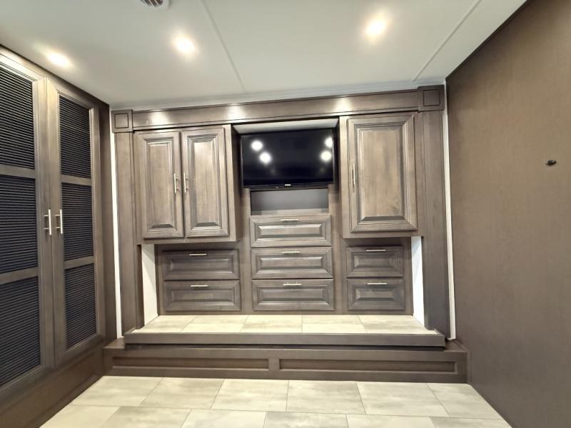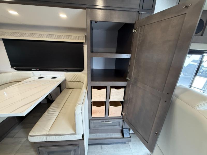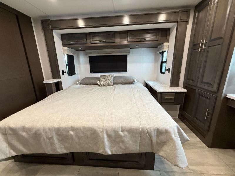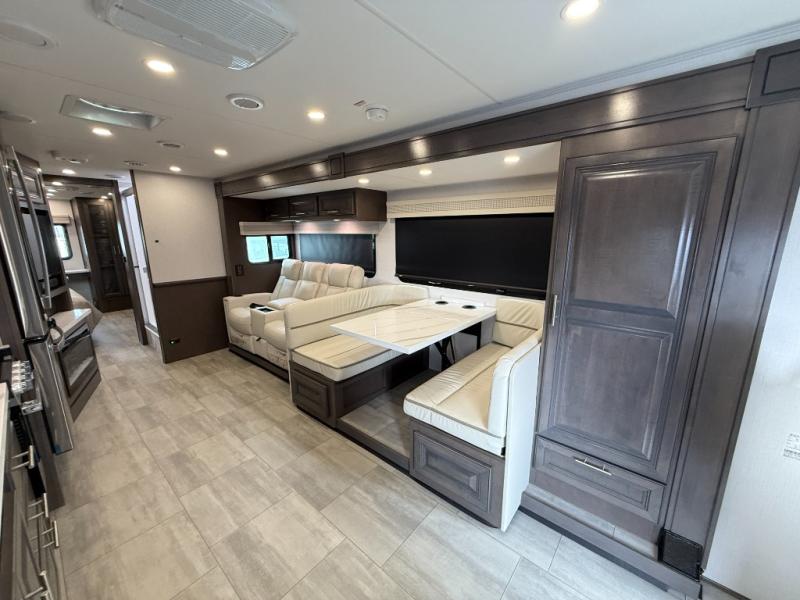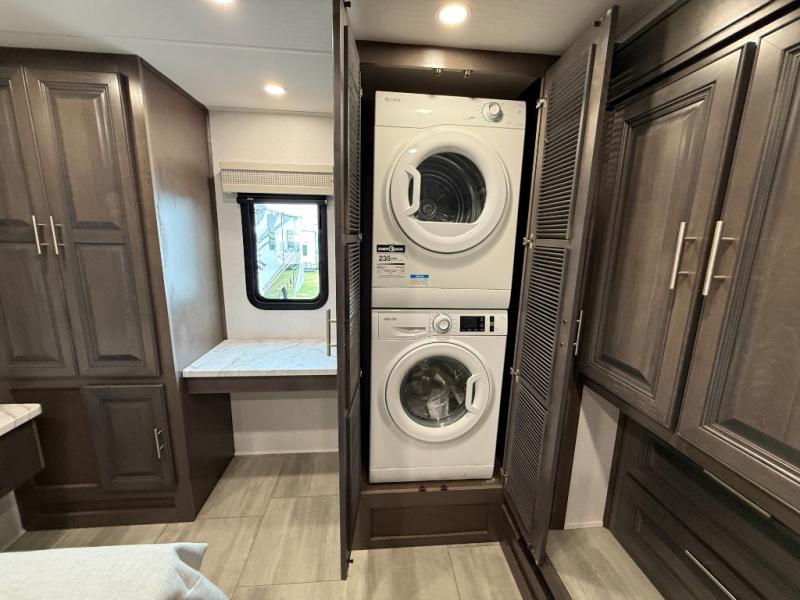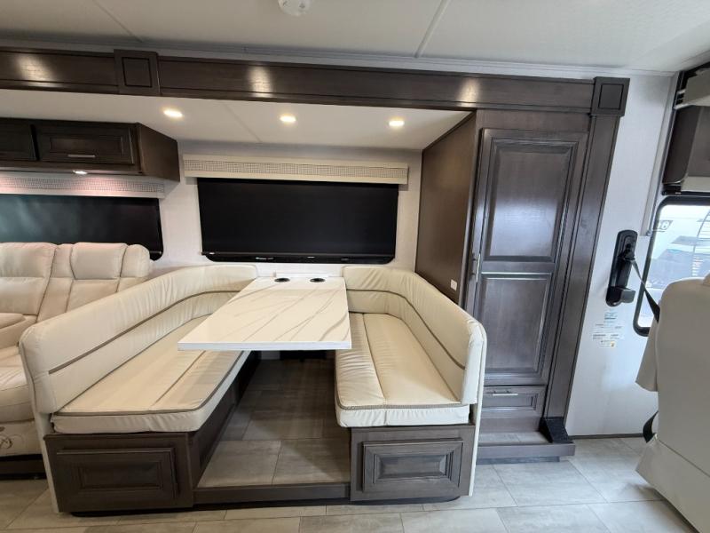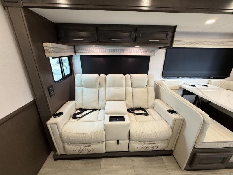You won't believe all that the rear private bedroom has to offer in this motorhome! It features a 72" x 80" king bed slide with overhead cabinets, a dresser with a 32" TV and overhead cabinets, wardrobes on either side of the dresser, and a desk with wardrobes on either. And one of the wardrobes features an optional stacked washer and dryer for convenience! The split-style bathroom makes it easy for one person to freshen up in the shower with a seat while another uses the private toilet and sink. After a long day of traveling, you can relax on either the Thomas Payne theater seating with heat and massage across from the 5,000 BTU fireplace with a 40" LED TV above it or play a game and eat a meal at the Dream Dinette. There is also a power front overhead bunk for more sleeping space!