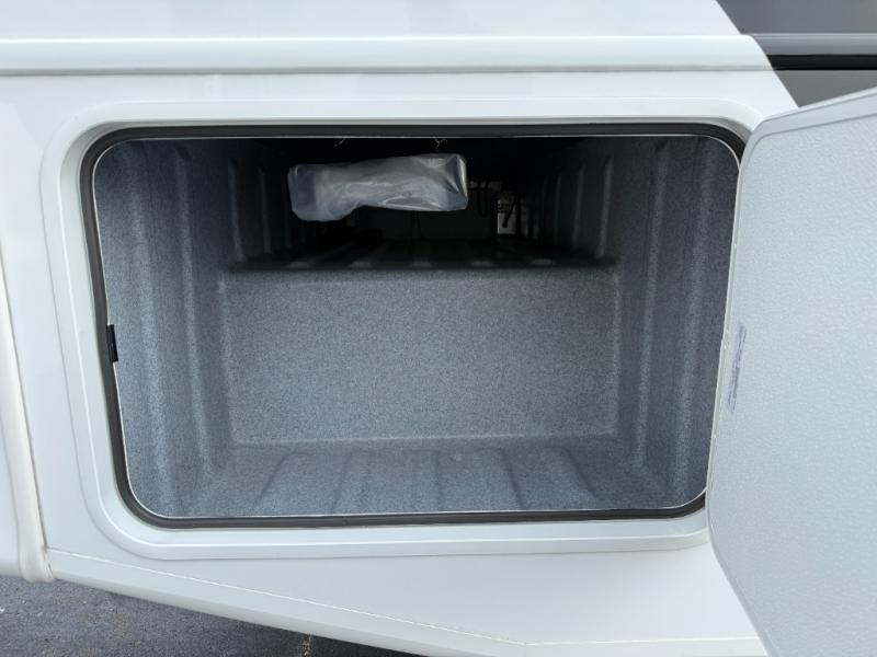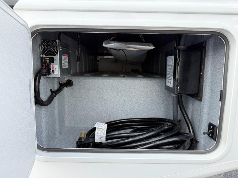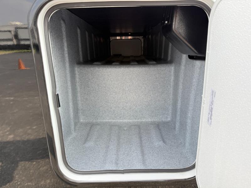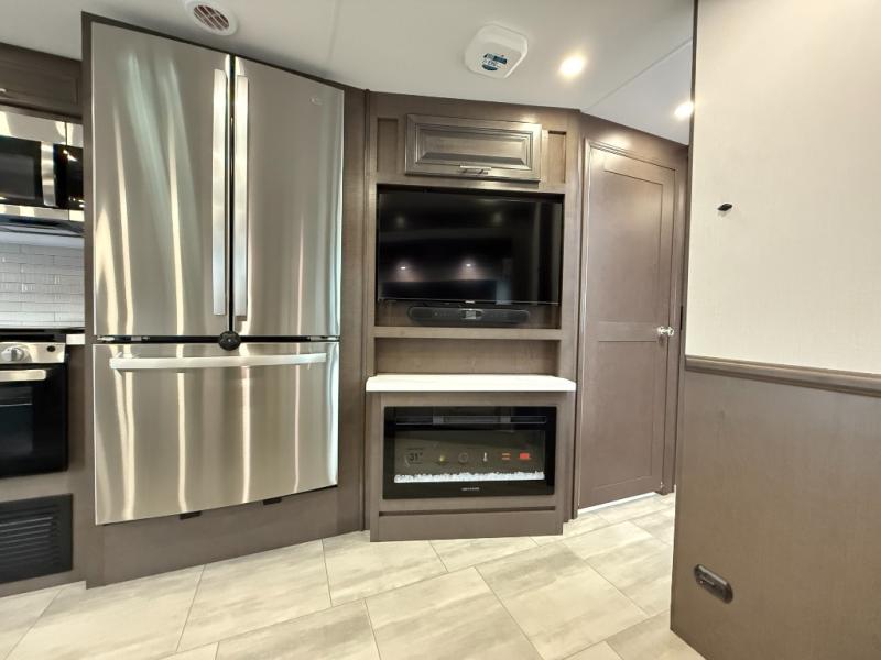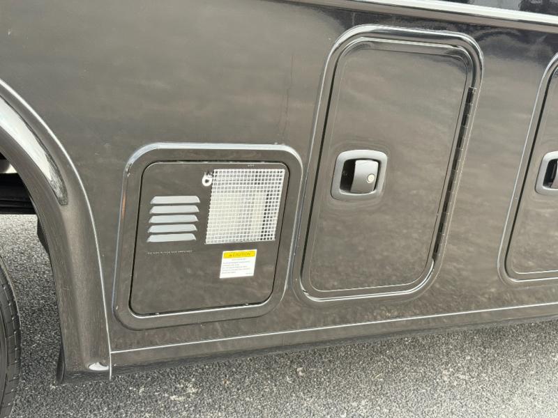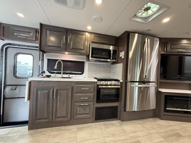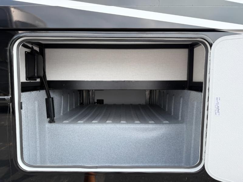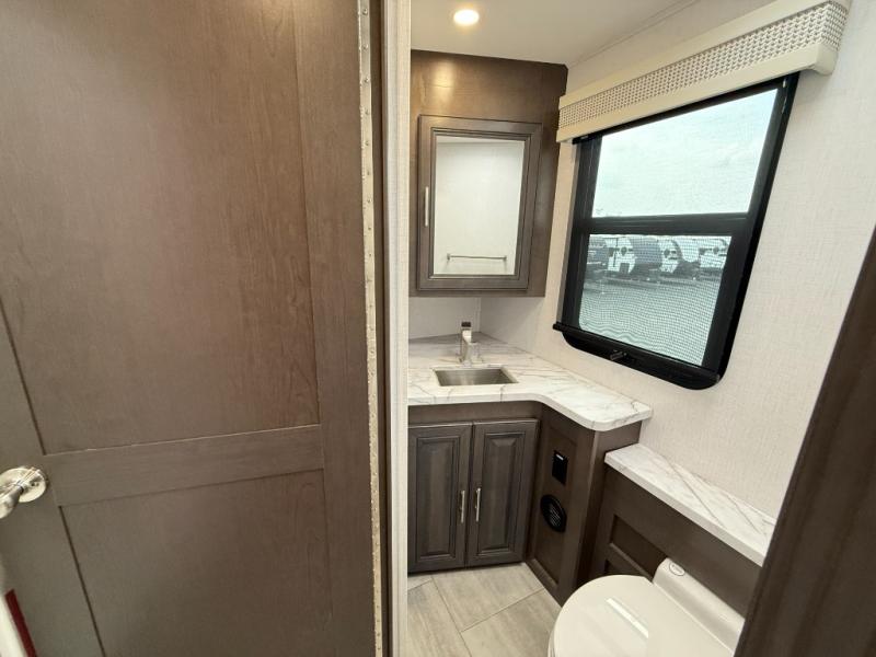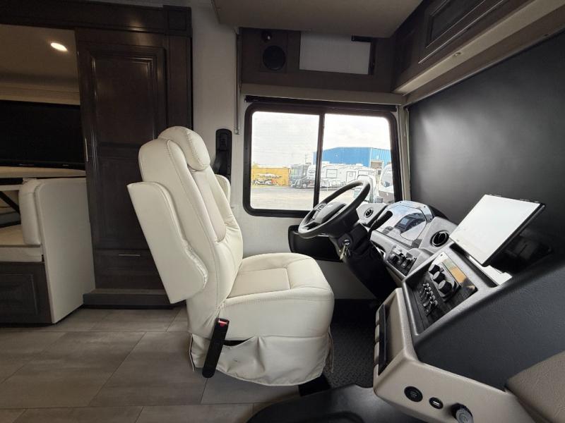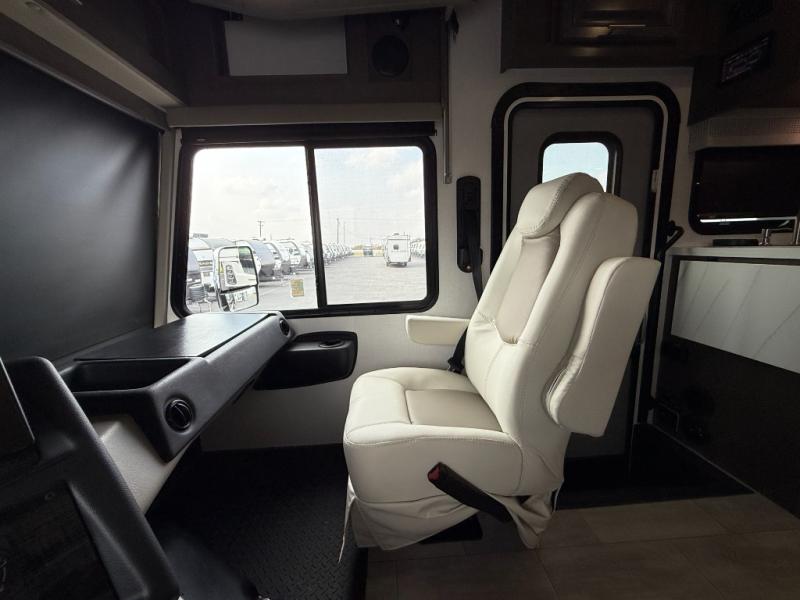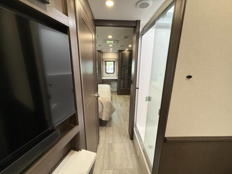You won't believe all that the rear private bedroom has to offer in this motorhome! It features a 72" x 80" king bed slide with overhead cabinets, a dresser with a 32" TV and overhead cabinets, wardrobes on either side of the dresser, and a desk with wardrobes on either. And one of the wardrobes features an optional stacked washer and dryer for convenience! The split-style bathroom makes it easy for one person to freshen up in the shower with a seat while another uses the private toilet and sink. After a long day of traveling, you can relax on either the Thomas Payne theater seating with heat and massage across from the 5,000 BTU fireplace with a 40" LED TV above it or play a game and eat a meal at the Dream Dinette. There is also a power front overhead bunk for more sleeping space!