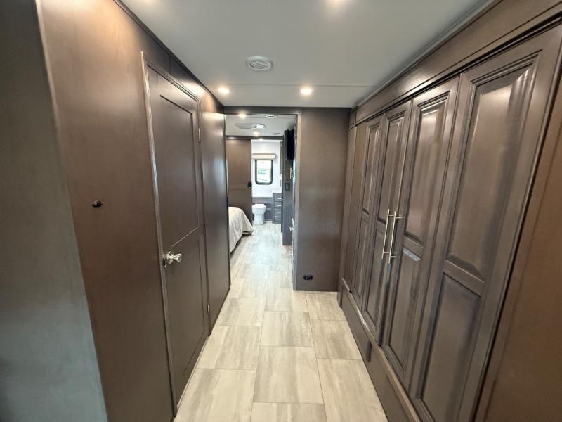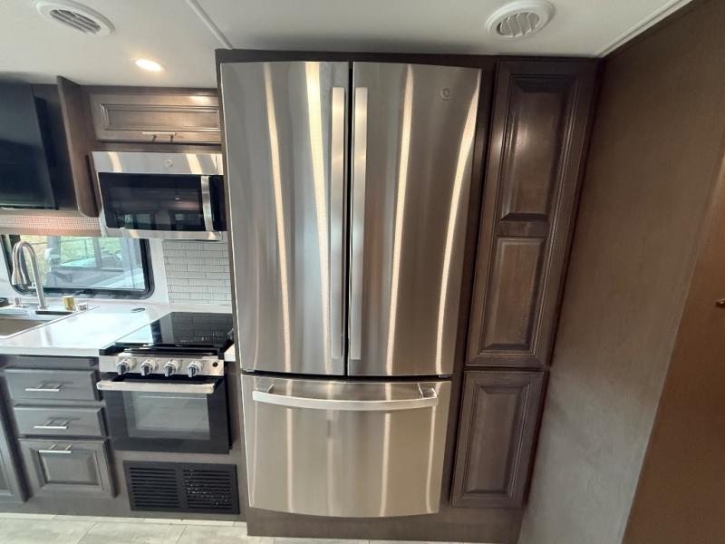 A spacious design and true luxury come together to create these Forest River Georgetown 5 Series Class A gas motorhomes! Their solid surface kitchen countertops, day and night shades throughout, and designer bedspread will have you feeling right at home. The color side and rear cameras help to prevent any dings or bumps while you travel, and the automatic hydraulic leveling jacks will keep your unit leveled wherever you set up. Durable construction consists of a crowned roof, 2" aluminum framed vacuum bonded gel coated sidewalls, plus high density block foam insulation that will allow you to travel at any time of the year. You will appreciate the 50 Amp service, two house batteries, and 6,000-watt Yamaha generator to keep you powered up. An outside shower is also included on all models, along with rotocast storage compartments with drains, a power awning, and so much more!