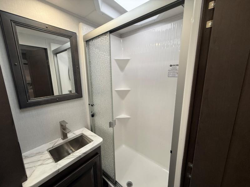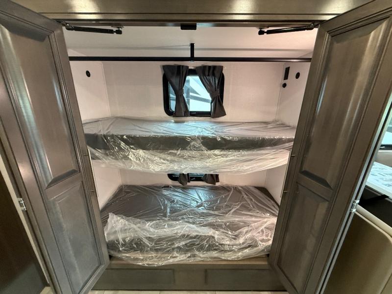 You won't have to search far for comfort in this spacious coach for up to eight! The little ones will love having bunk beds to sleep on, plus there is a full bath right across the hall for convenience. The master bedroom with a king bed slide out will have you feeling right at home, and the second full bath includes ample counter space to set out your necessities. Everyone can meet in the main living area to relax on the hide-a-bed sofa, or you can choose the optional power theater seats if you don't need more sleeping space. You will surely never get bored with a 40" LED TV in the living room, 32" LED TV in the bedroom, plus a 40" LED TV outdoors with a radio and exterior speakers!