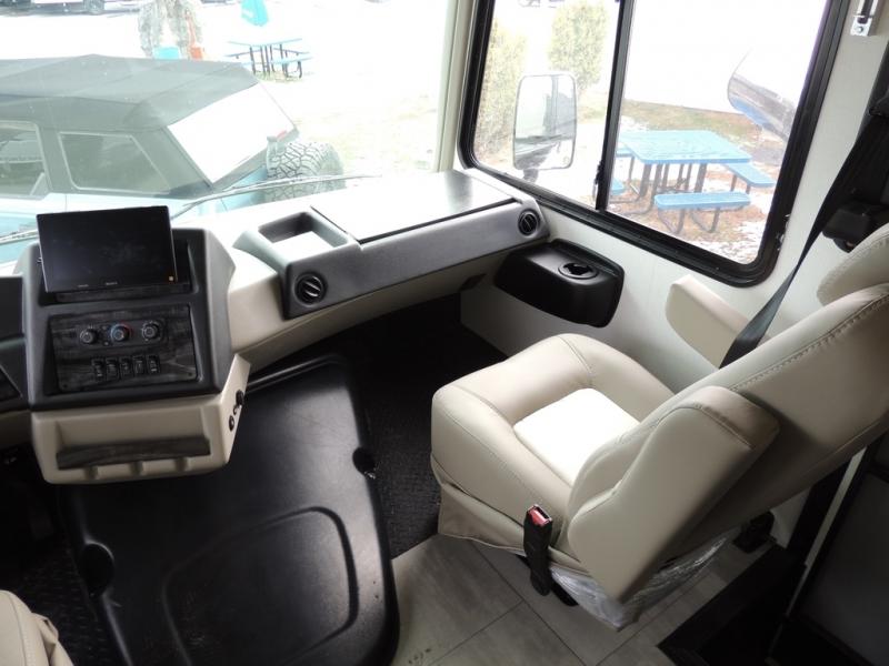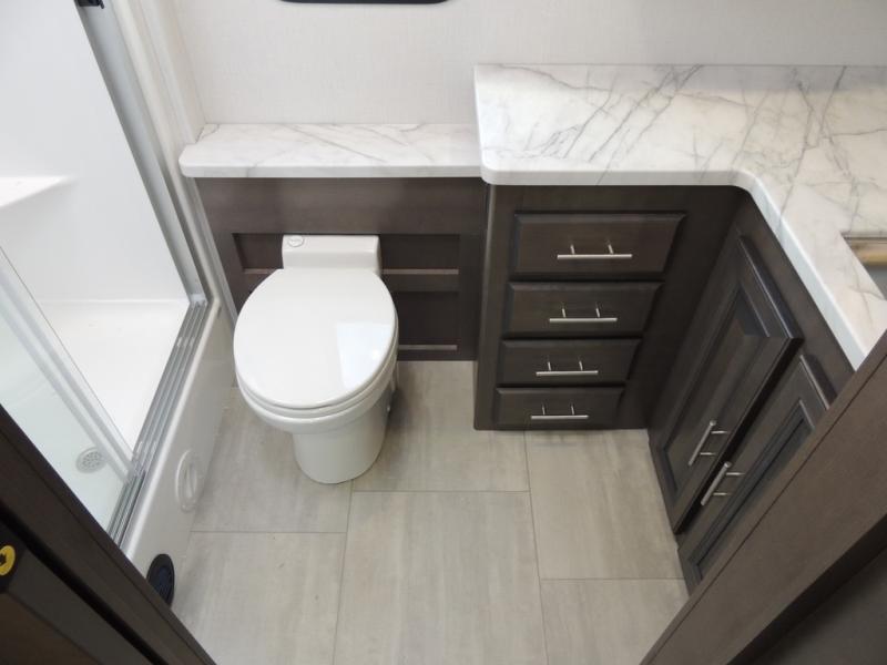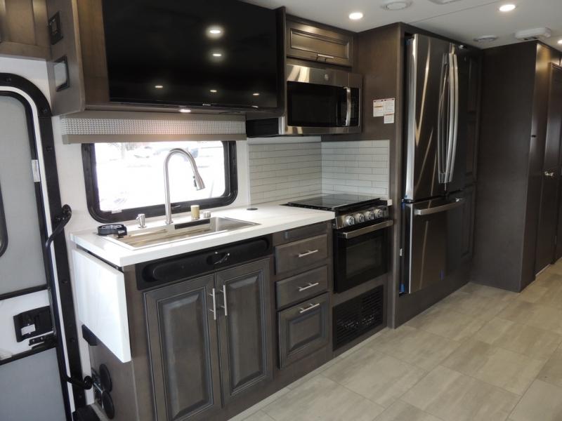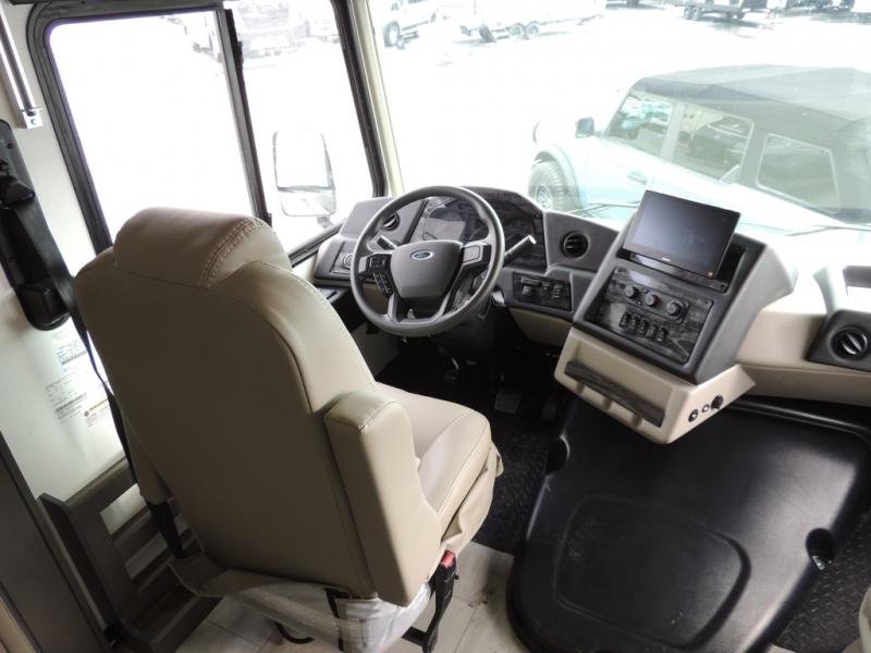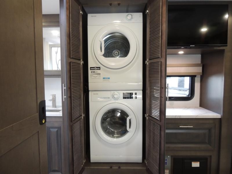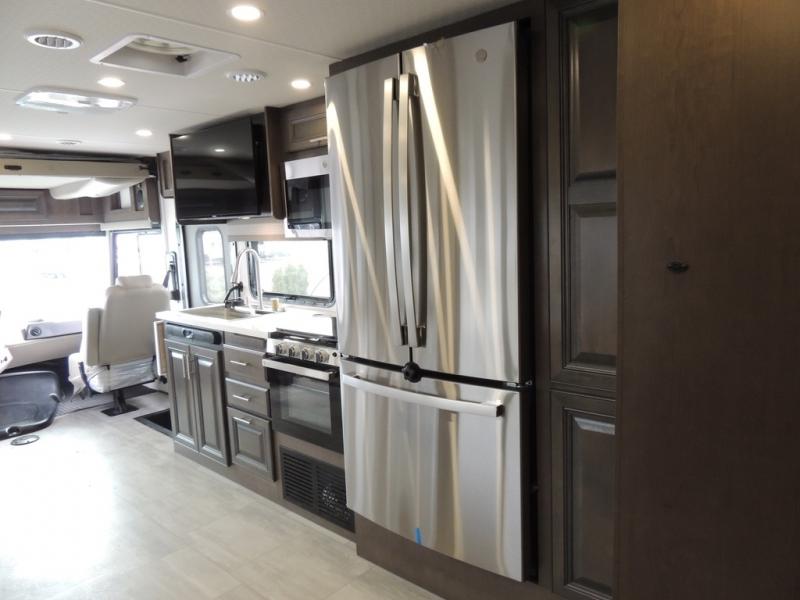 A spacious design and true luxury come together to create these Forest River Georgetown 5 Series Class A gas motorhomes! Their solid surface kitchen countertops, day and night shades throughout, and designer bedspread will have you feeling right at home. The color side and rear cameras help to prevent any dings or bumps while you travel, and the automatic hydraulic leveling jacks will keep your unit leveled wherever you set up. Durable construction consists of a crowned roof, 2" aluminum framed vacuum bonded gel coated sidewalls, plus high density block foam insulation that will allow you to travel at any time of the year. You will appreciate the 50 Amp service, two house batteries, and 6,000-watt Yamaha generator to keep you powered up. An outside shower is also included on all models, along with rotocast storage compartments with drains, a power awning, and so much more!