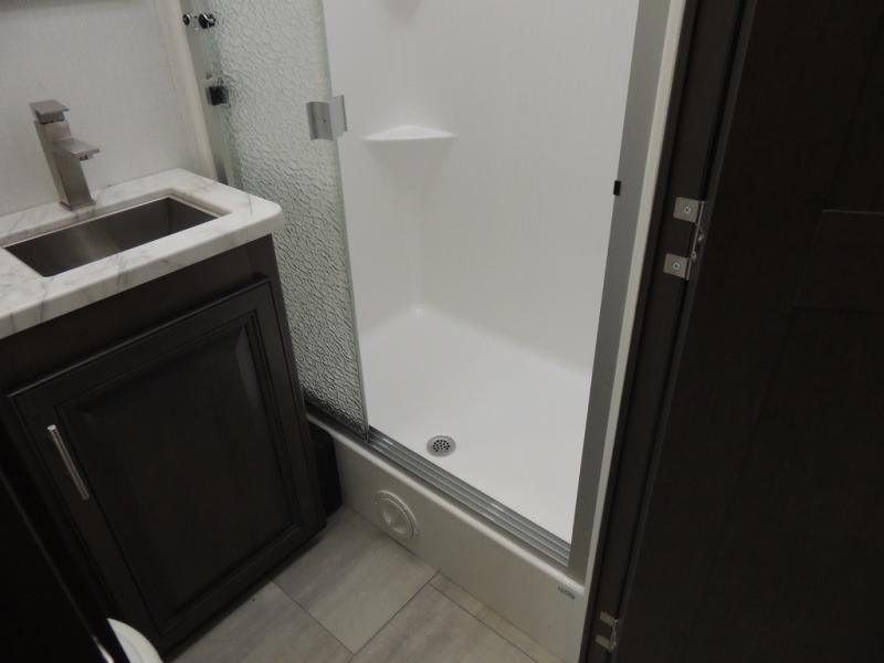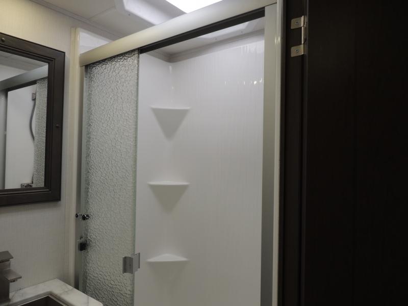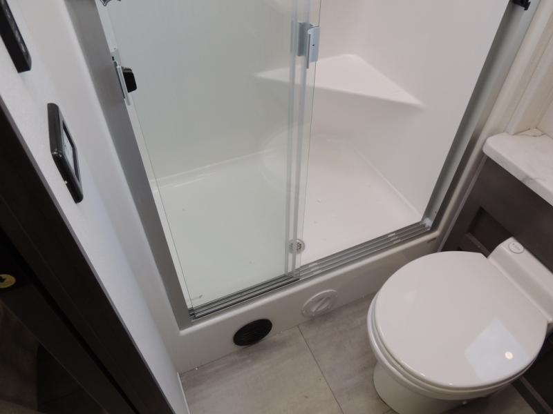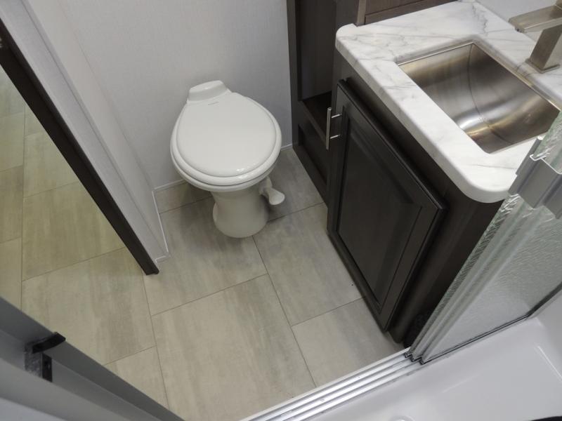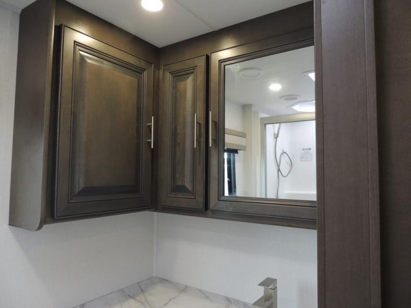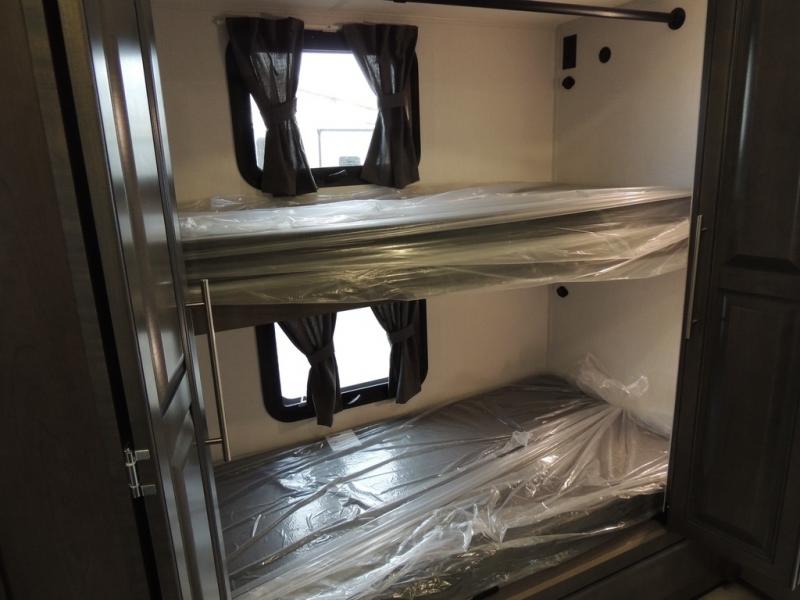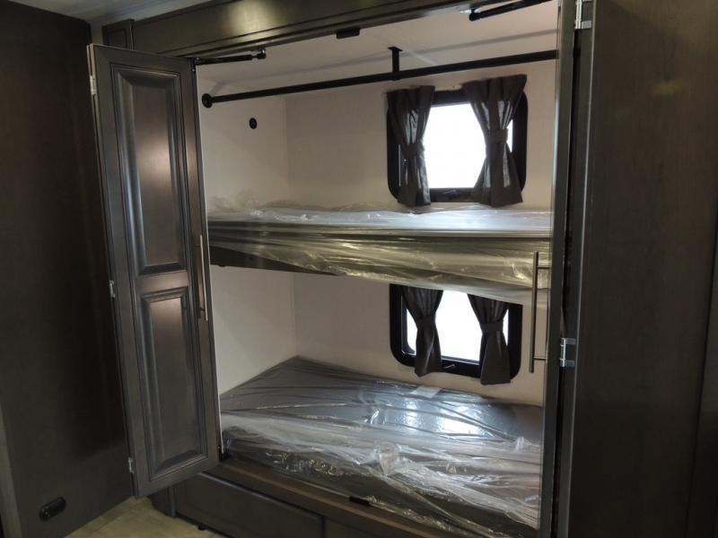 You won't have to search far for comfort in this spacious coach for up to eight! The little ones will love having bunk beds to sleep on, plus there is a full bath right across the hall for convenience. The master bedroom with a king bed slide out will have you feeling right at home, and the second full bath includes ample counter space to set out your necessities. Everyone can meet in the main living area to relax on the hide-a-bed sofa, or you can choose the optional power theater seats if you don't need more sleeping space. You will surely never get bored with a 40" LED TV in the living room, 32" LED TV in the bedroom, plus a 40" LED TV outdoors with a radio and exterior speakers!