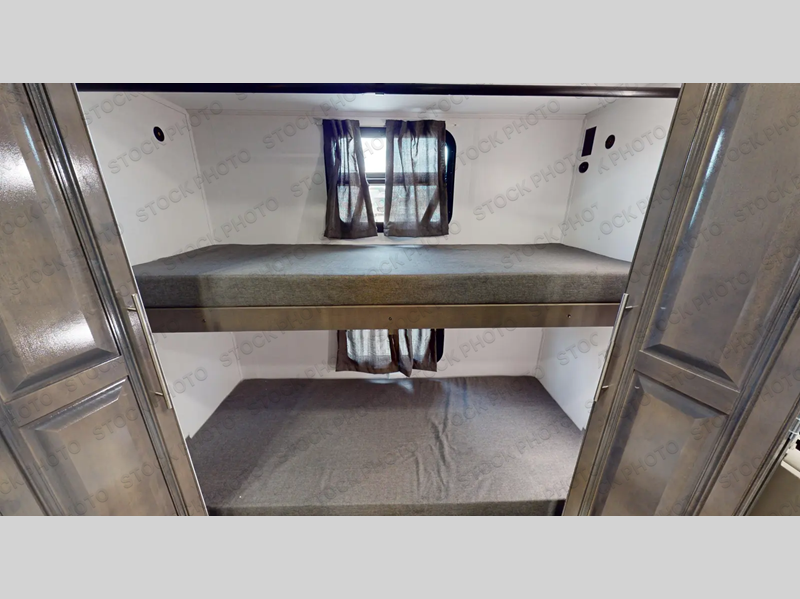 You won't have to search far for comfort in this spacious coach for up to eight! The little ones will love having bunk beds to sleep on, plus there is a full bath right across the hall for convenience. The master bedroom with a king bed slide out will have you feeling right at home, and the second full bath includes ample counter space to set out your necessities. Everyone can meet in the main living area to relax on the hide-a-bed sofa, or you can choose the optional power theater seats if you don't need more sleeping space. You will surely never get bored with a 40" LED TV in the living room, 32" LED TV in the bedroom, plus a 40" LED TV outdoors with a radio and exterior speakers!