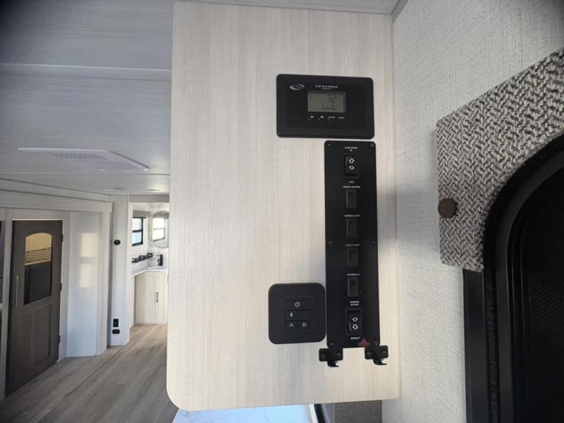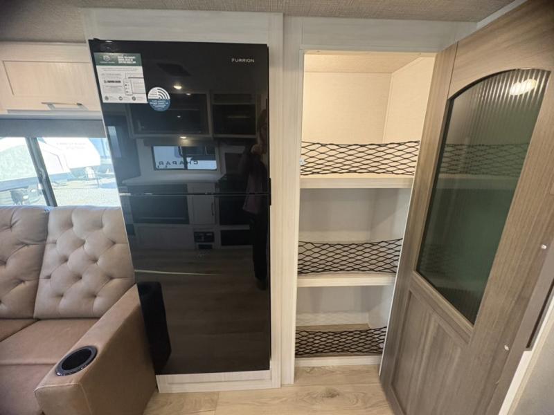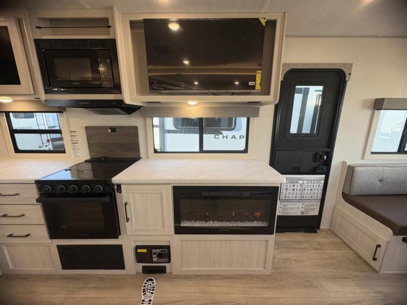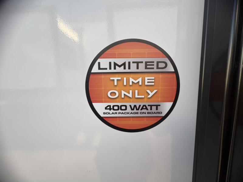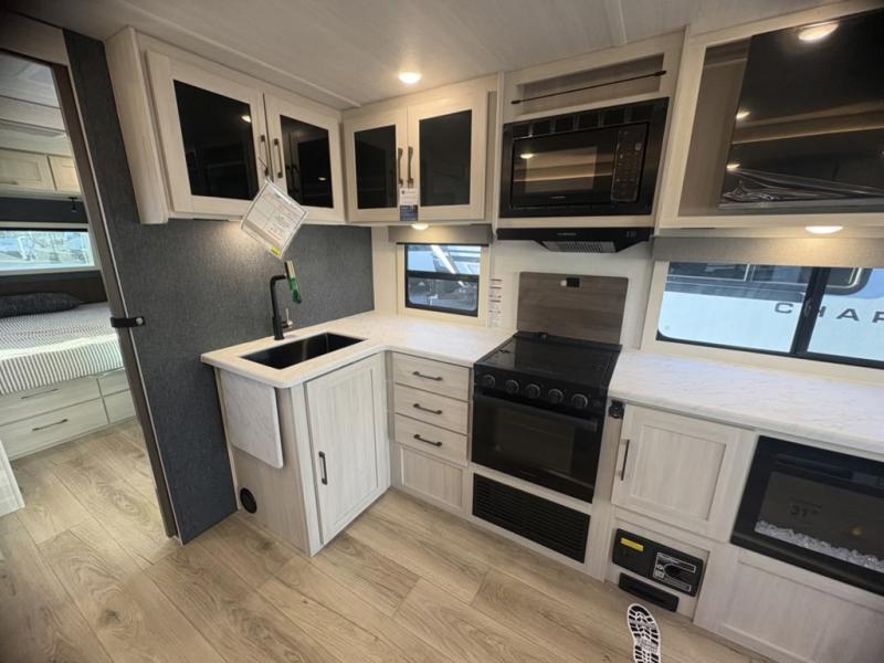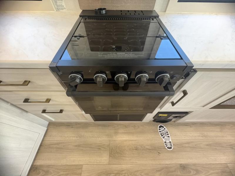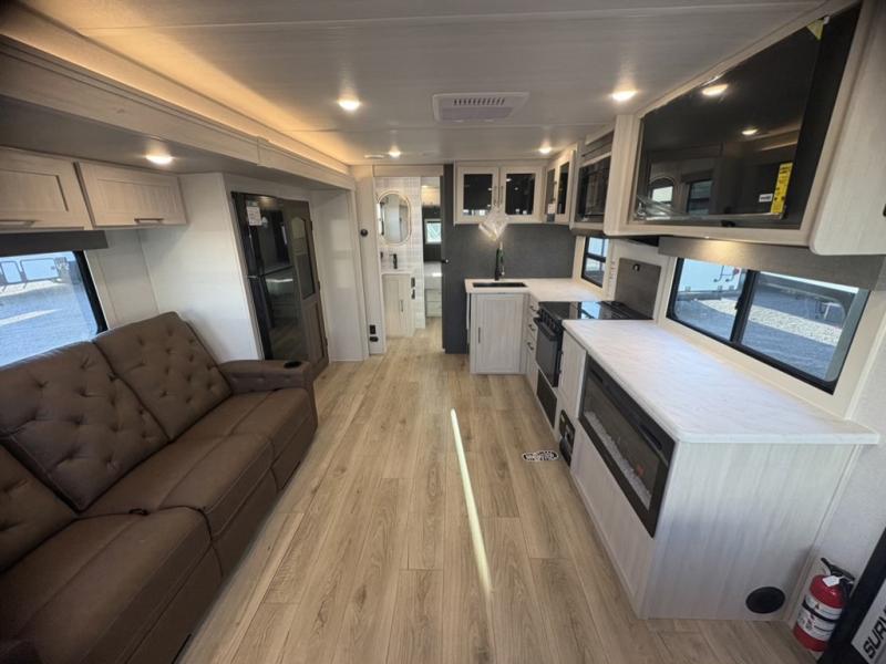Camping your favorite site has never been more relaxing than in this travel trailer. You can comfortably sleep five to six each night with the custom king bed in the front master bedroom, plus the theater seat and u-dinette in the rear living area. There is also a walk-through bath that will easily accessible for everyone to use. Whip up your best meals on the residential range, or head outdoors to cook on the gas griddle included within the outdoor kitchen. You'll also find a sink and a refrigerator, and a 21' power awning with LED lights to create the perfect outdoor living space. After a day outdoors, you can relax by the fireplace or watch a movie on the HD TV, and there is a large kitchen pantry to stock up on snacks!