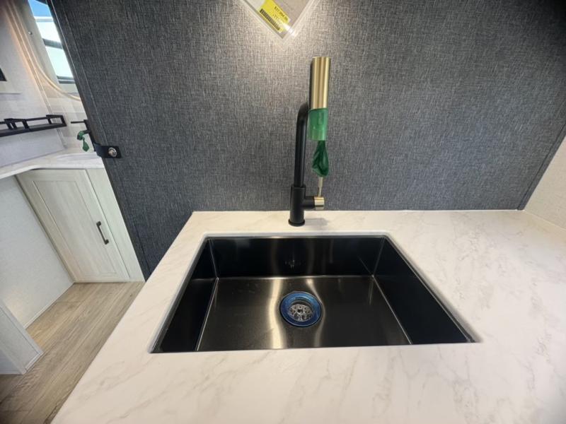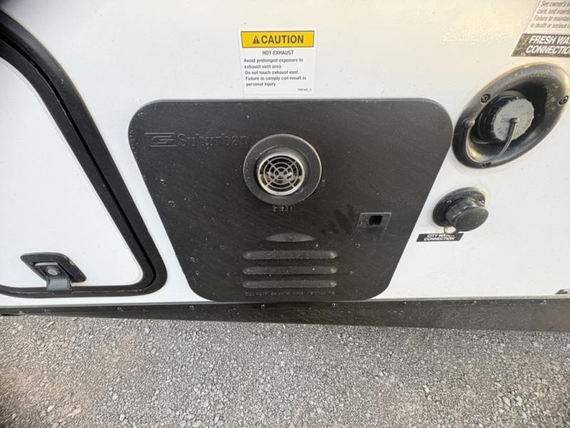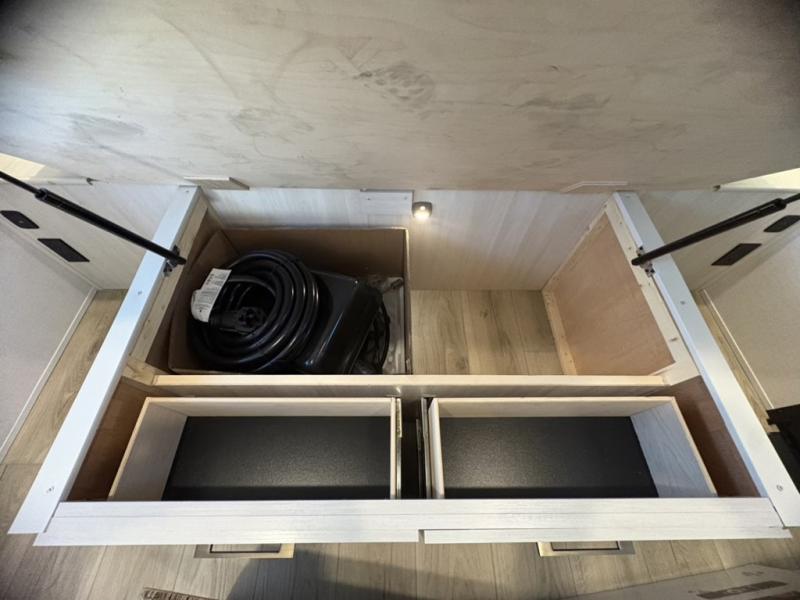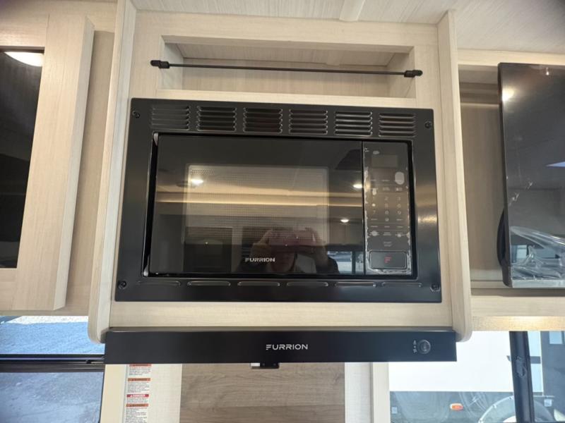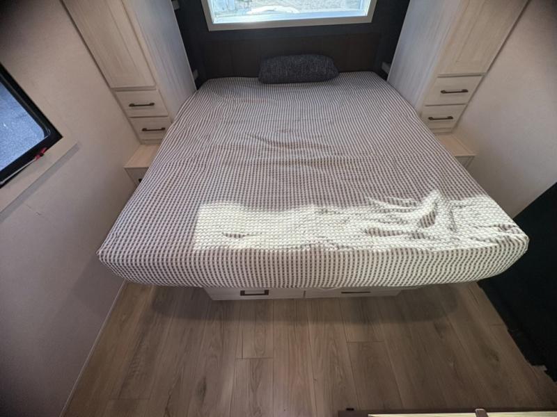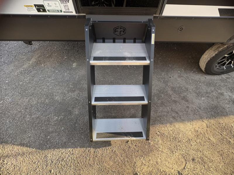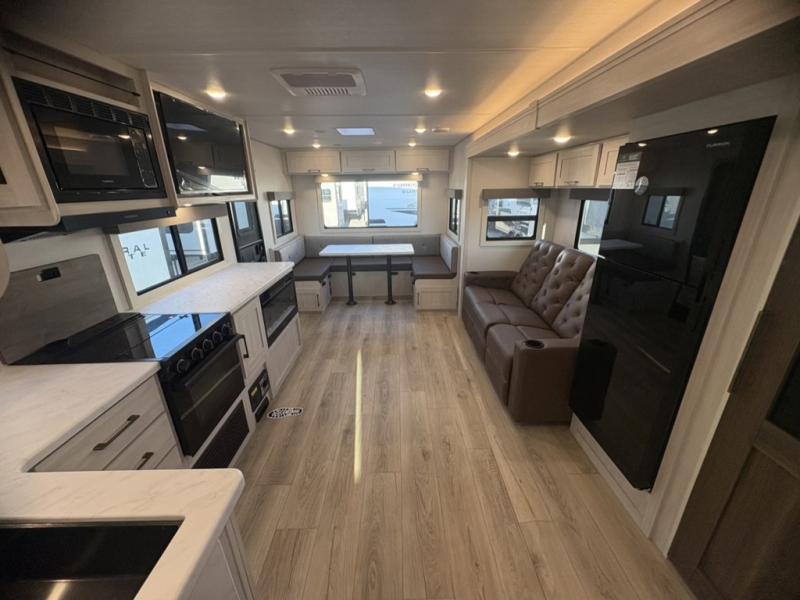 Camping your favorite site has never been more relaxing than in this travel trailer. You can comfortably sleep five to six each night with the custom king bed in the front master bedroom, plus the theater seat and u-dinette in the rear living area. There is also a walk-through bath that will easily accessible for everyone to use. Whip up your best meals on the residential range, or head outdoors to cook on the gas griddle included within the outdoor kitchen. You'll also find a sink and a refrigerator, and a 21' power awning with LED lights to create the perfect outdoor living space. After a day outdoors, you can relax by the fireplace or watch a movie on the HD TV, and there is a large kitchen pantry to stock up on snacks!