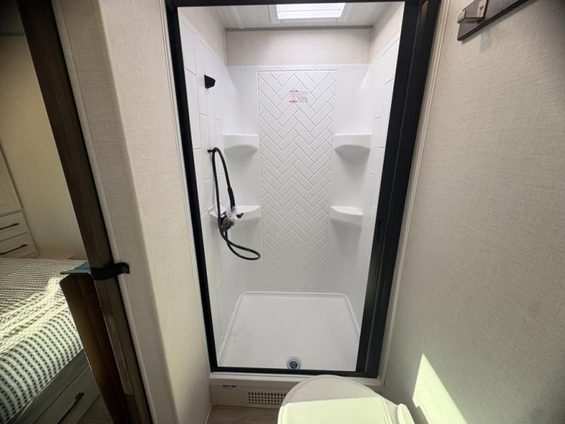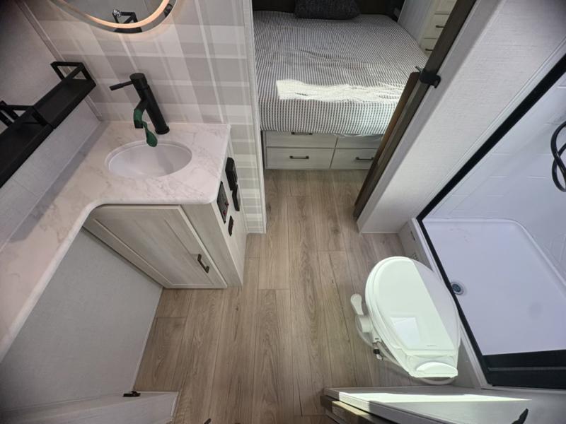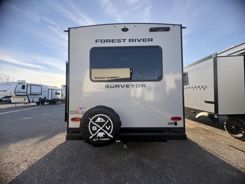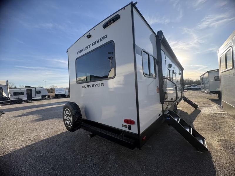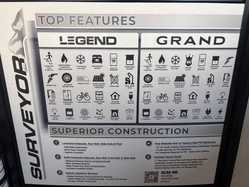 With any Grand Surveyor travel trailer by Forest River you will enjoy turn-key ready-to-go features and quality construction! Each model includes Azdel composite walls and a gel coated fiberglass front cap with an automotive style tinted windshield for a sleek look. There are friction hinge black glass entry door(s), an adjustable platform step with a night light, plus Goodyear tires and a power tongue jack for easy towing. The interior will have you feeling right at home with roller shades, residential faucets, sinks, and bathroom vanity, plus Surf(x) seamless countertops throughout. You can also plan for adventure with a 2" rear accessory and exterior spray port, and there are slam latch exterior baggage doors throughout to keep all your gear secure. Other stand-out features include a central vacuum system, a 200 watt solar panel with a 30 amp controller, a tankless water heater, carpet-free interiors, and the list goes on!
