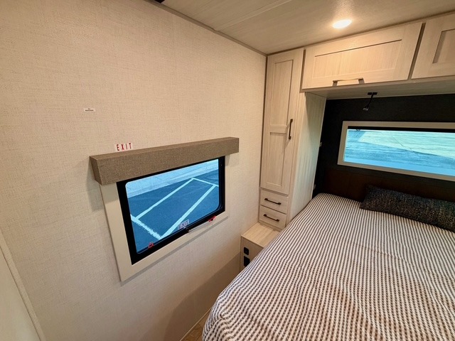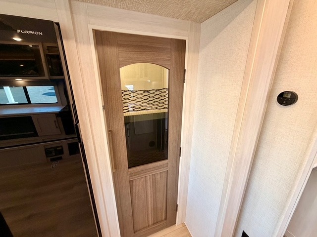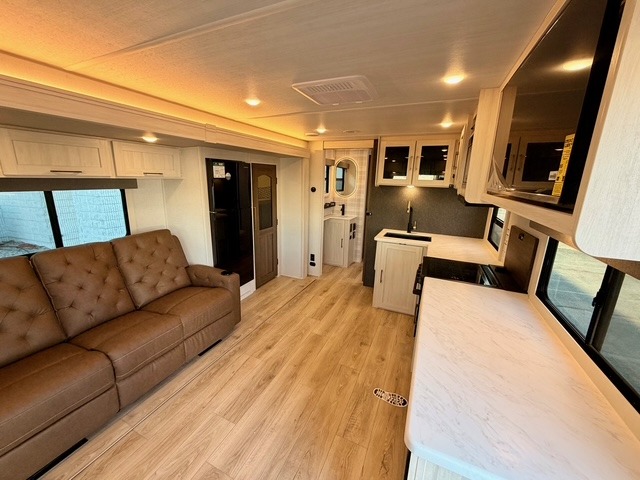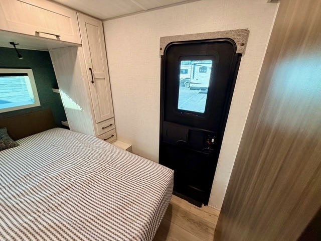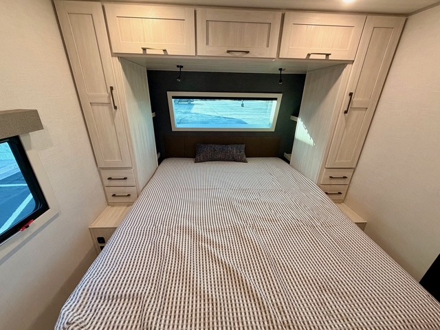 Camping at your favorite site has never been more relaxing than in this expertly designed rear-living travel trailer. The floorplan comfortably sleeps five to six people, anchored by a front master bedroom featuring a luxury custom king bed. One of the standout conveniences is the dual entry door system, allowing you to enter the bedroom directly from the outside or use the main rear entrance. The walk-through bath serves as a spacious bridge between the living area and the bedroom, providing easy access for everyone on board.
