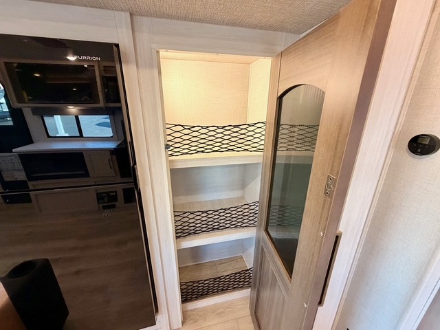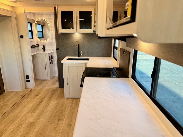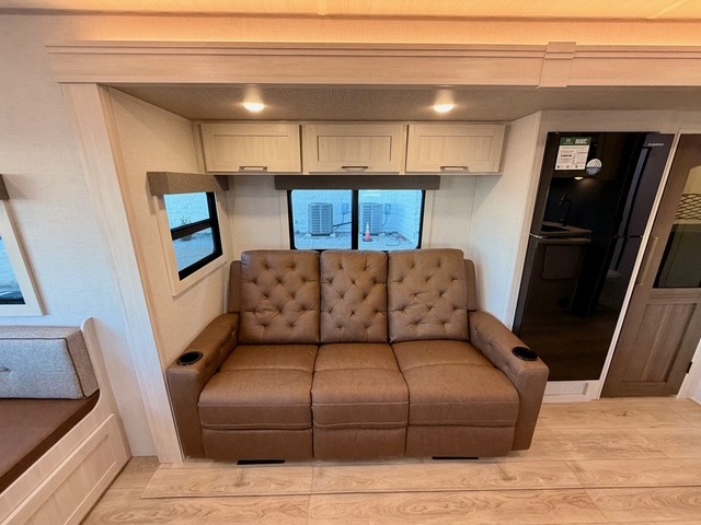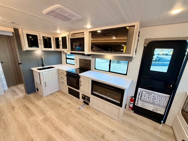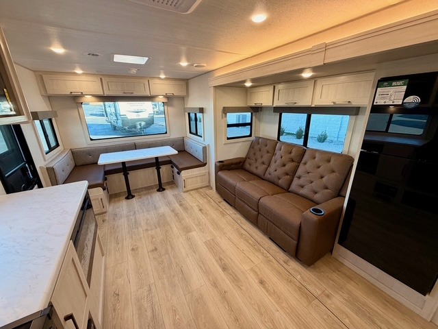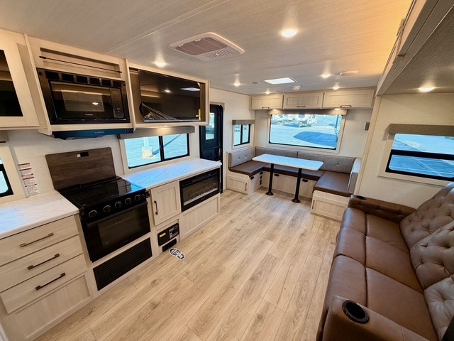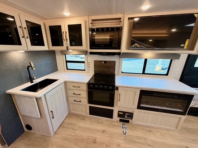 The main living area is opened up by a large slide-out that houses premium theater seating and a versatile U-shaped dinette. The chef of the group can choose between the indoor kitchen—complete with a residential range and a large kitchen pantry—or the deluxe outdoor kitchen, which includes a gas griddle, sink, and refrigerator. After a day of exploring, you can cozy up by the electric fireplace or enjoy a movie on the HD TV, all within a climate-controlled, high-end environment.