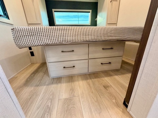 Every Grand Surveyor is built with a "no-compromise" approach to durability, featuring Azdel composite walls that are lighter and more rot-resistant than wood, along with a gel-coated fiberglass front cap and a striking automotive-style tinted windshield. Towing is a breeze thanks to American-made Goodyear® tires and a power tongue jack with an integrated hitch light. The exterior is further enhanced by slam-latch baggage doors, a 2" rear accessory hitch for bike racks, and an exterior spray port for quick cleanups.