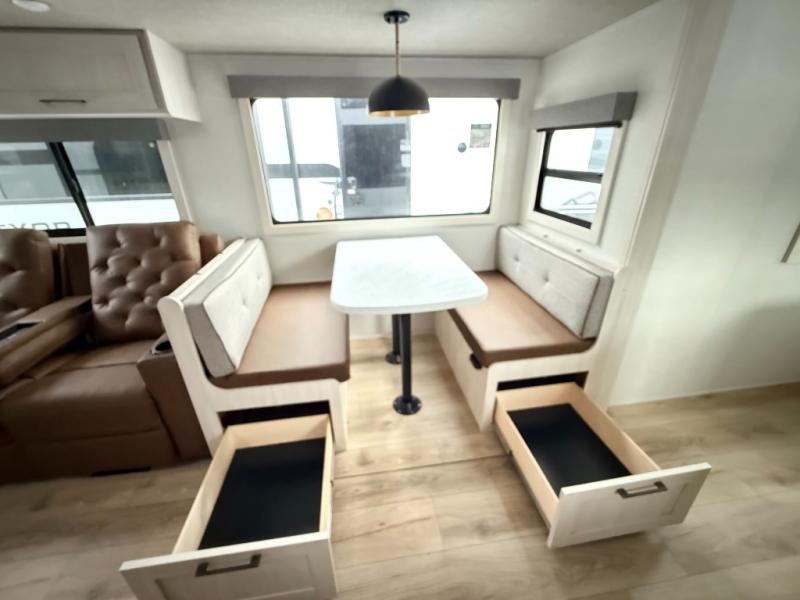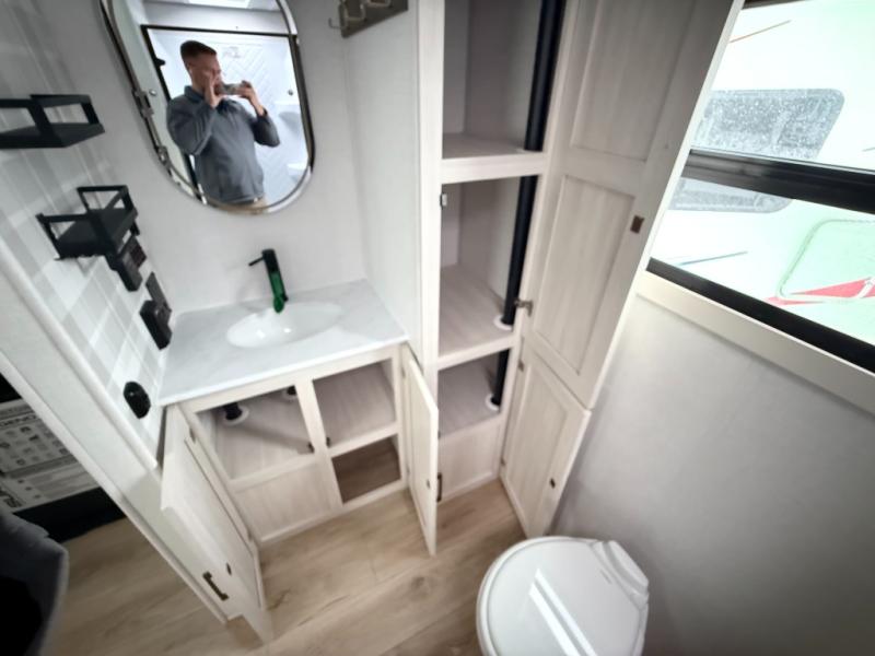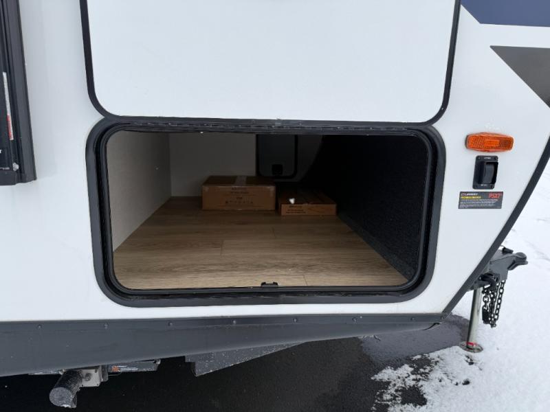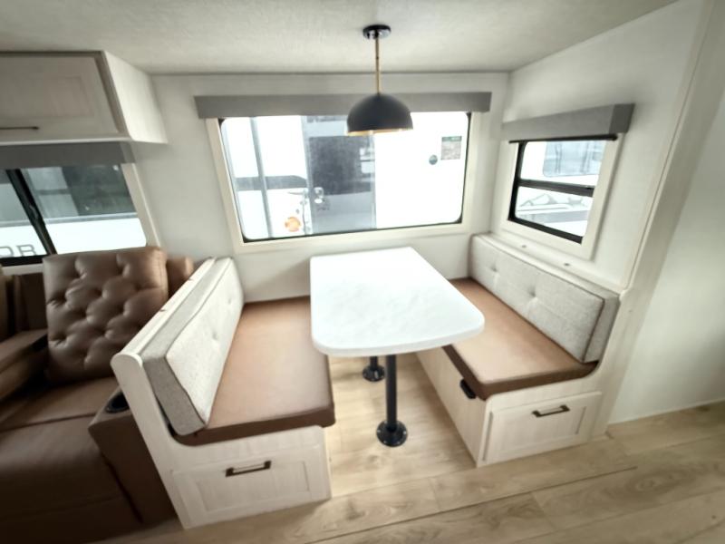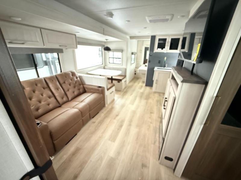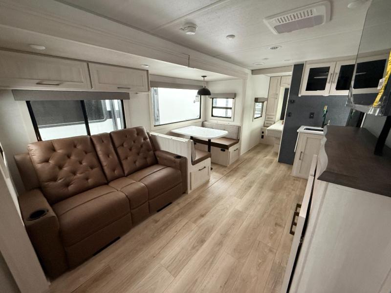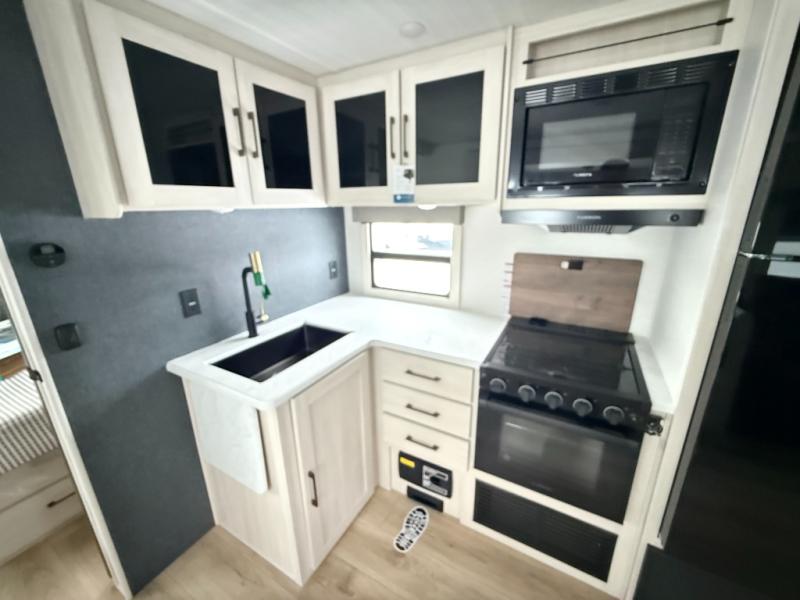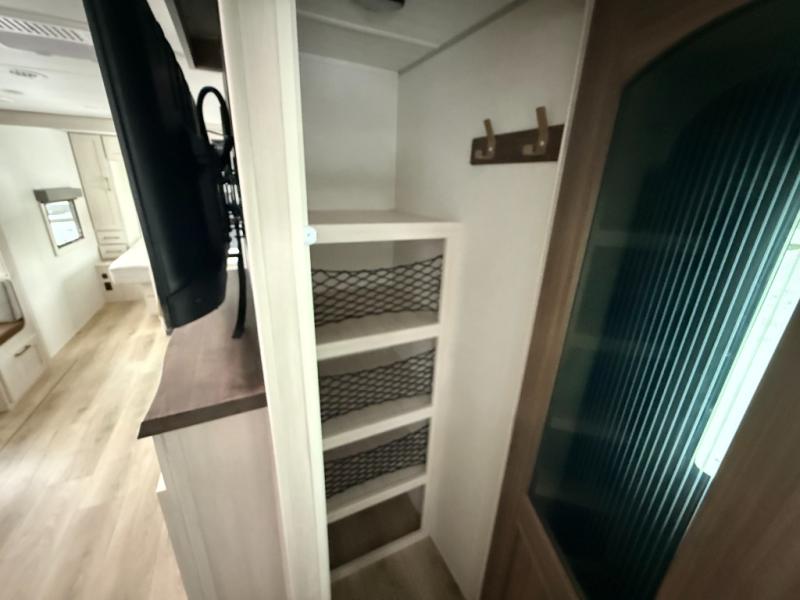 No need to rough it when you camp; this trailer offers amenities that allow you to "Glamp" if you want! The rear spacious bathroom is tucked away behind a beautiful barn door, and inside features a shower, wardrobe, and linen storage. The front master bedroom offers privacy, a walk-around custom king bed, dual wardrobes and underbed storage, plus TV prep if you want the option to watch movies in bed. The L-shaped counter in the kitchen provides enough space to have everything at your fingertips while you cook, plus there is a countertop extension for more prep and serving space if needed. A nice walk-in pantry just inside the entry door will be perfect for chips and snacks or canned goods for those longer camping trips. If dining inside, the booth dinette with pull-out dinette drawers will be comfortable plus you will enjoy the view provided by the panoramic windows within the slide out. An outside kitchen will be a favorite for anyone that cooks, and the 19' awning will provide some protection and offering an outdoor living area to enjoy with everyone.
