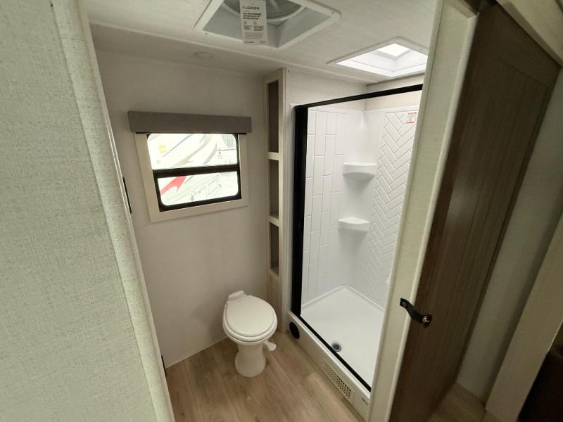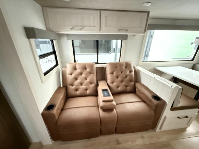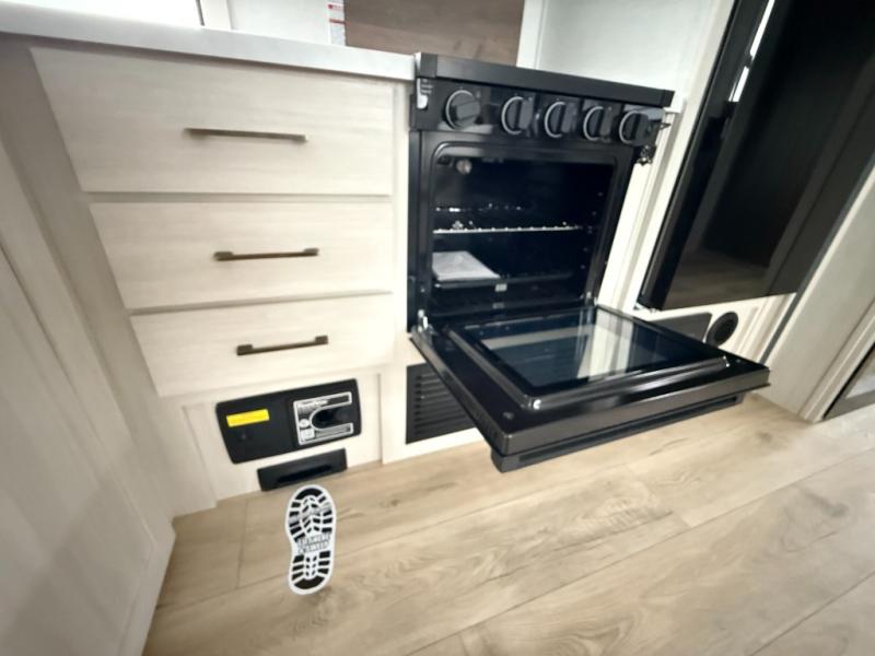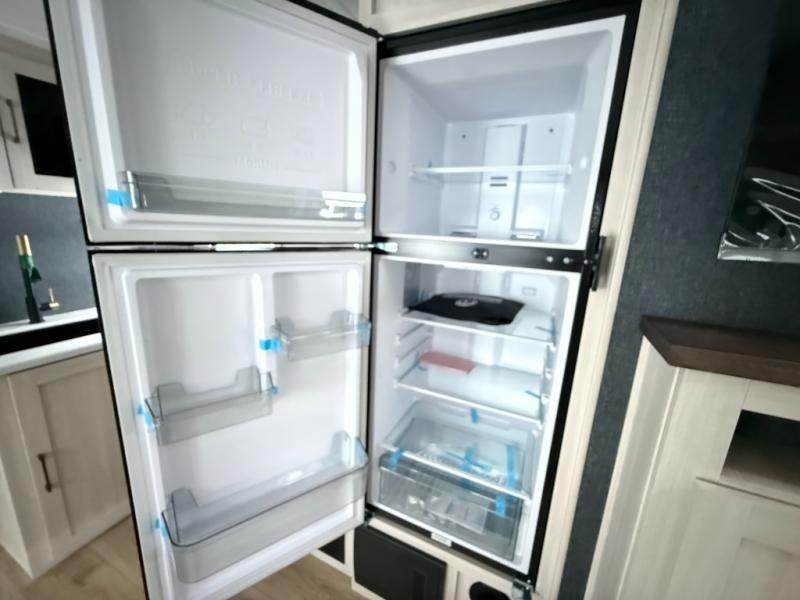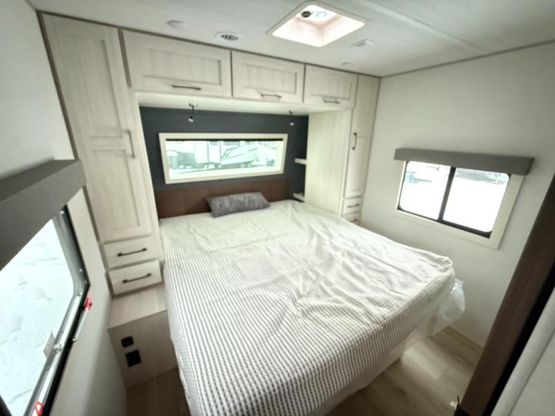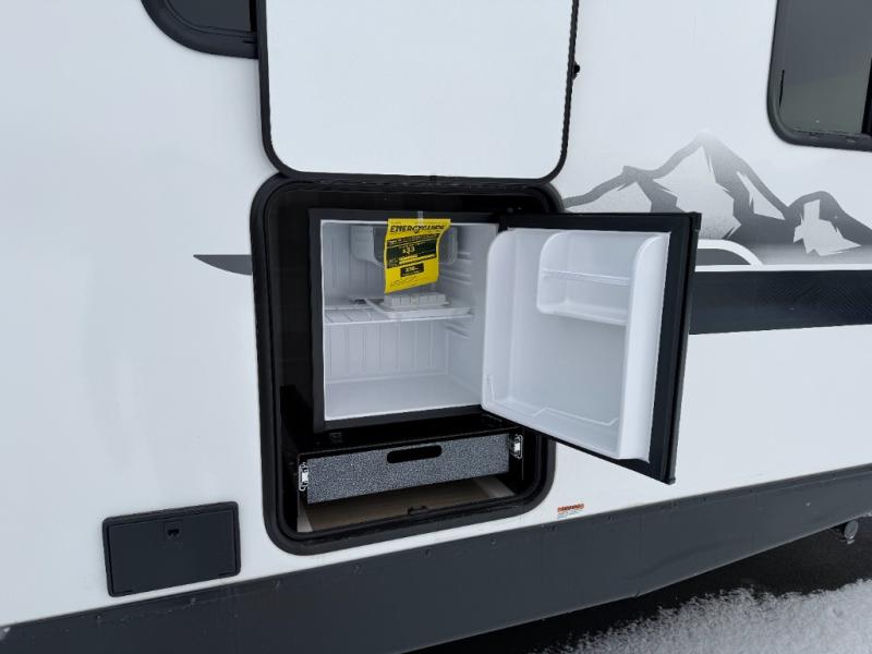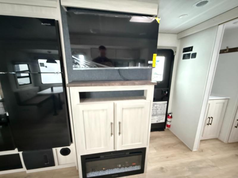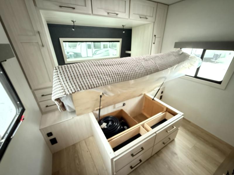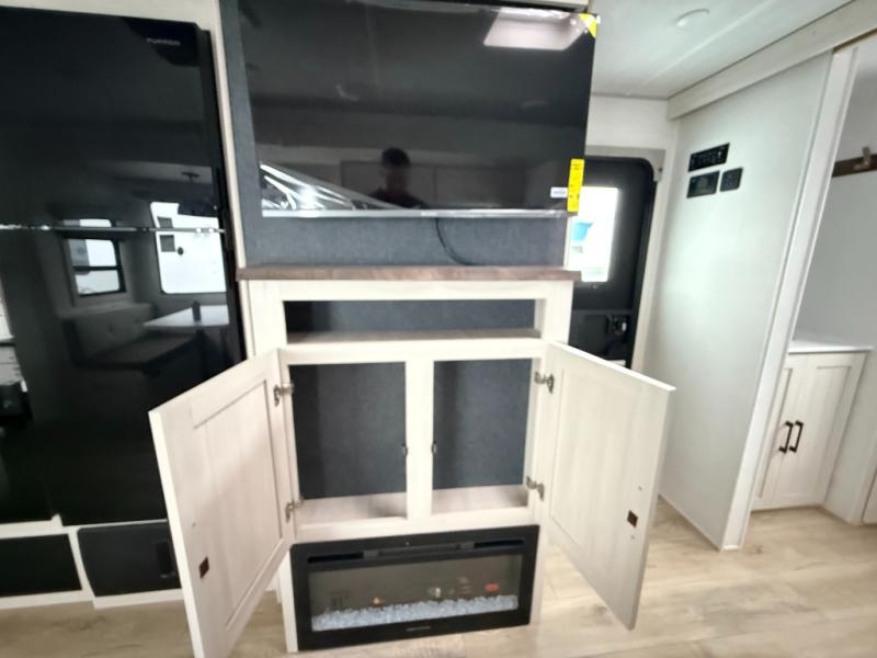 No need to rough it when you camp; this trailer offers amenities that allow you to "Glamp" if you want! The rear spacious bathroom is tucked away behind a beautiful barn door, and inside features a shower, wardrobe, and linen storage. The front master bedroom offers privacy, a walk-around custom king bed, dual wardrobes and underbed storage, plus TV prep if you want the option to watch movies in bed. The L-shaped counter in the kitchen provides enough space to have everything at your fingertips while you cook, plus there is a countertop extension for more prep and serving space if needed. A nice walk-in pantry just inside the entry door will be perfect for chips and snacks or canned goods for those longer camping trips. If dining inside, the booth dinette with pull-out dinette drawers will be comfortable plus you will enjoy the view provided by the panoramic windows within the slide out. An outside kitchen will be a favorite for anyone that cooks, and the 19' awning will provide some protection and offering an outdoor living area to enjoy with everyone.