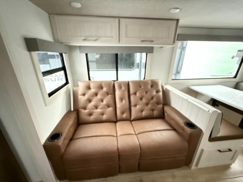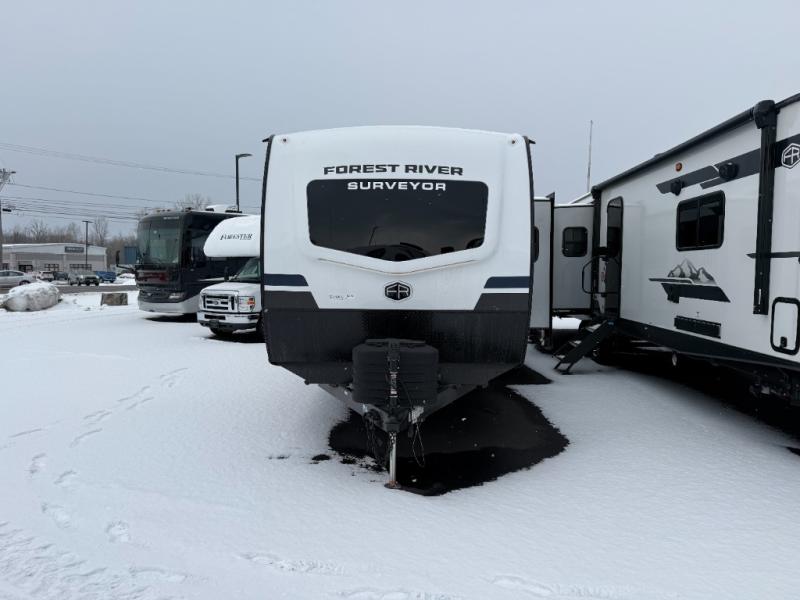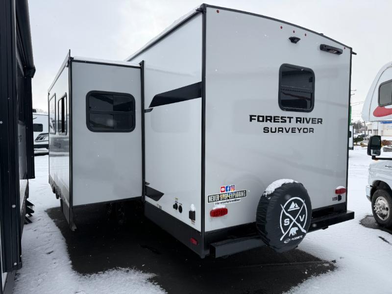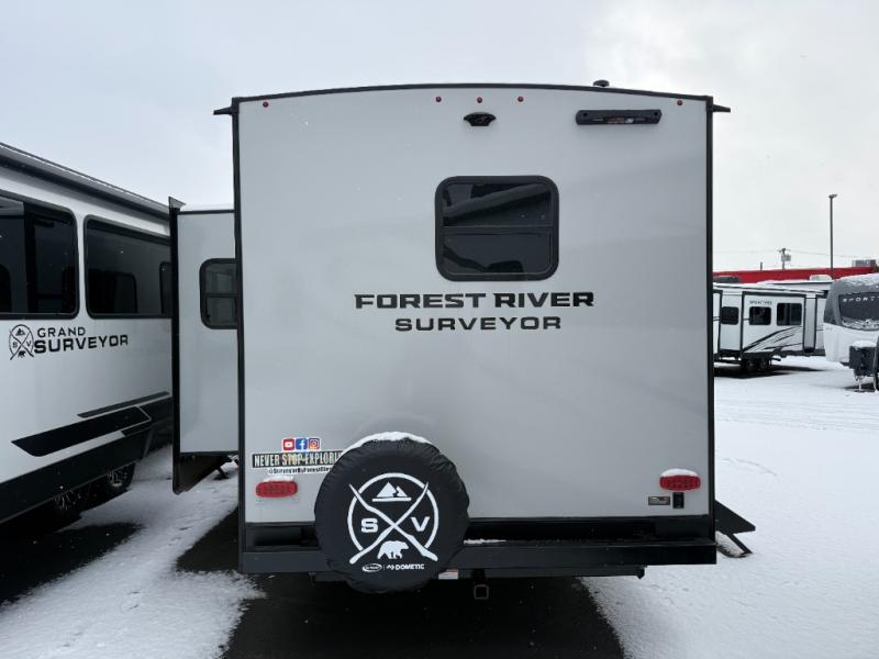 With any Grand Surveyor travel trailer by Forest River you will enjoy turn-key ready-to-go features and quality construction! Each model includes Azdel composite walls and a gel coated fiberglass front cap with an automotive style tinted windshield for a sleek look. There are friction hinge black glass entry door(s), an adjustable platform step with a night light, plus Goodyear tires and a power tongue jack for easy towing. The interior will have you feeling right at home with roller shades, residential faucets, sinks, and bathroom vanity, plus Surf(x) seamless countertops throughout. You can also plan for adventure with a 2" rear accessory and exterior spray port, and there are slam latch exterior baggage doors throughout to keep all your gear secure. Other stand-out features include a central vacuum system, a 200 watt solar panel with a 30 amp controller, a tankless water heater, carpet-free interiors, and the list goes on!