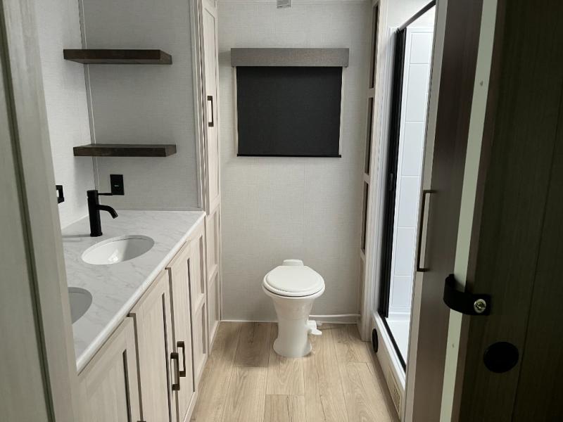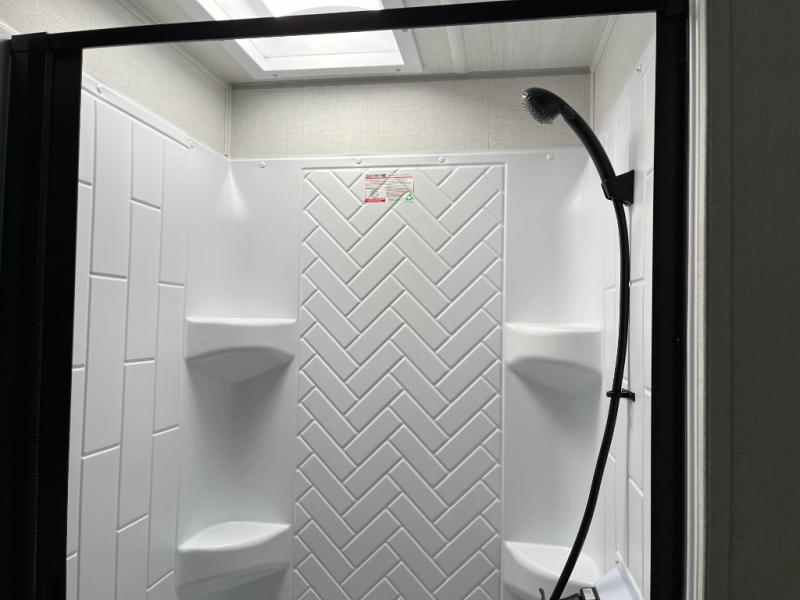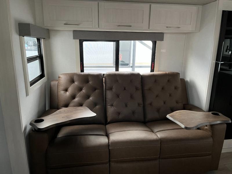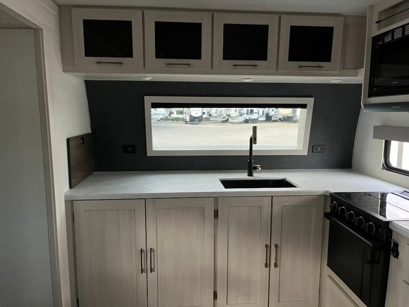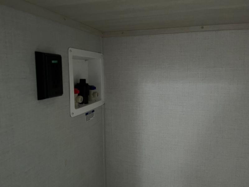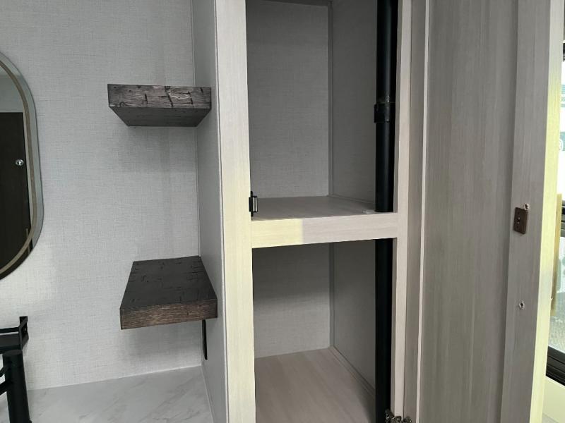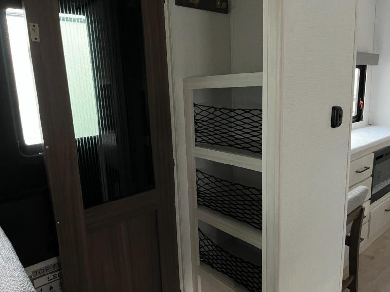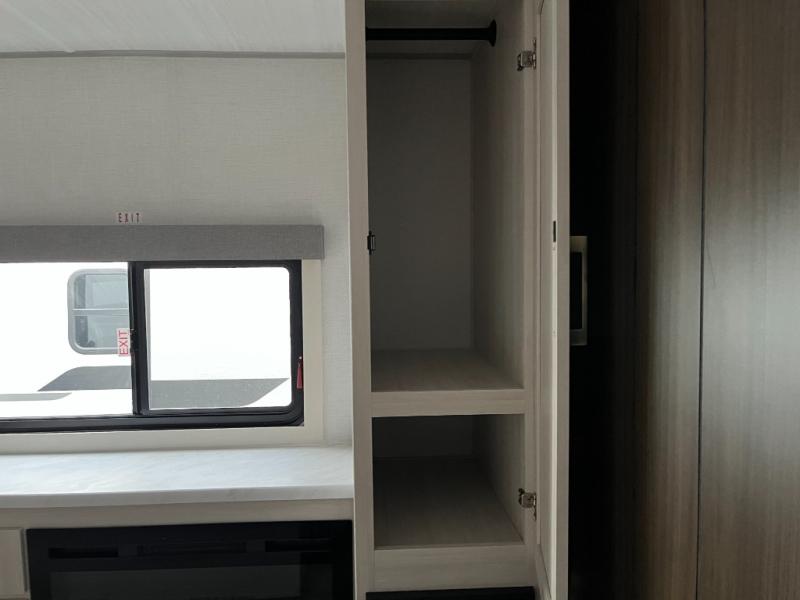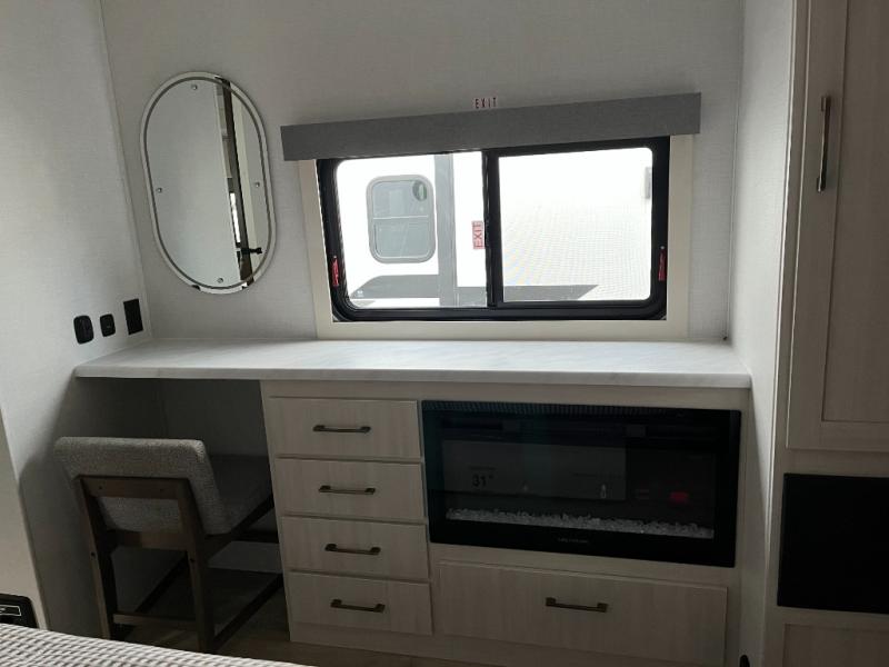 This couple's trailer will be giving you all the glamping vibes! There is a front kitchen with ample counter space, along with a counter with two bar stools, a central vacuum to easily clean up, and a slide out for more space! The second slide out is found in the middle master bedroom where you'll also enjoy a custom king bed across from a bedroom fireplace, a wardrobe, and a dresser with TV prep. Head towards the back and you'll be wowed by the full bath with dual bath sinks, an upgraded slow-close shower door, and a closet with washer and dryer prep. The exterior is just as impressive as the interior with its outside kitchen, 20' power awning with LED lights, slam-latch cargo doors, TV coax, and so much more!