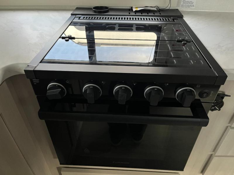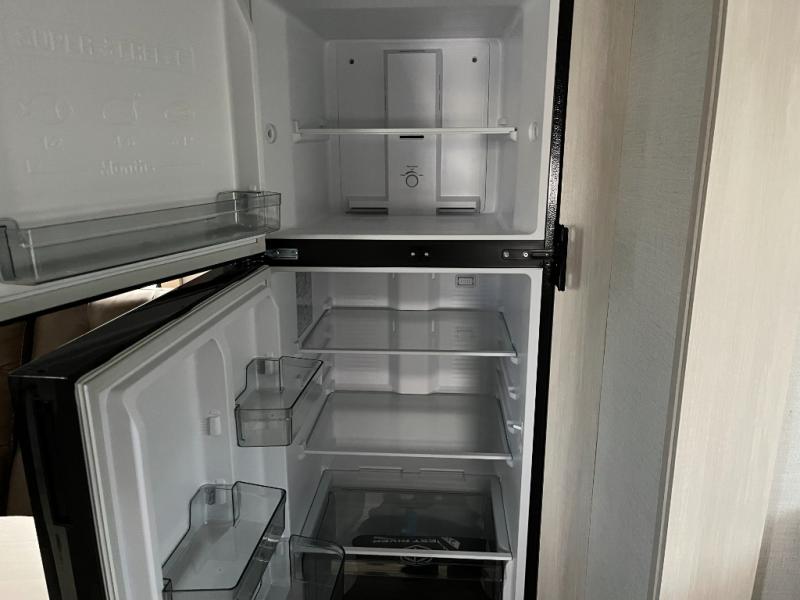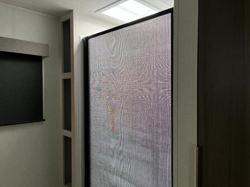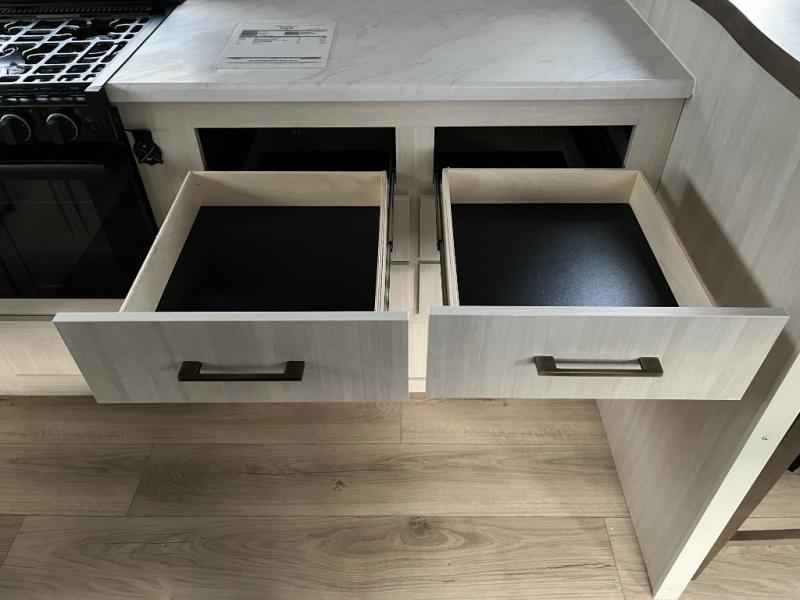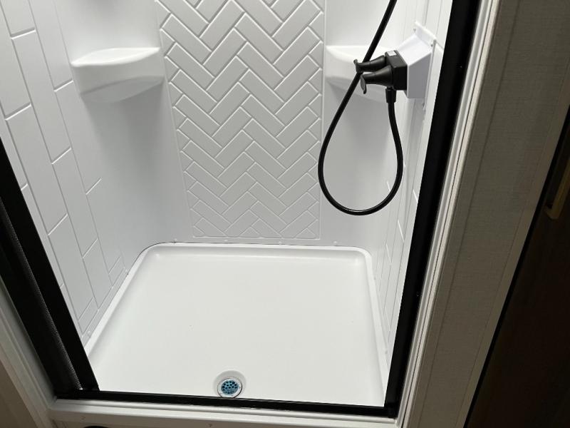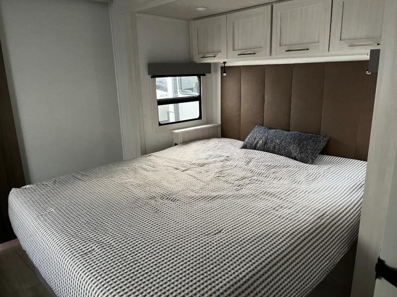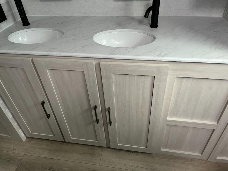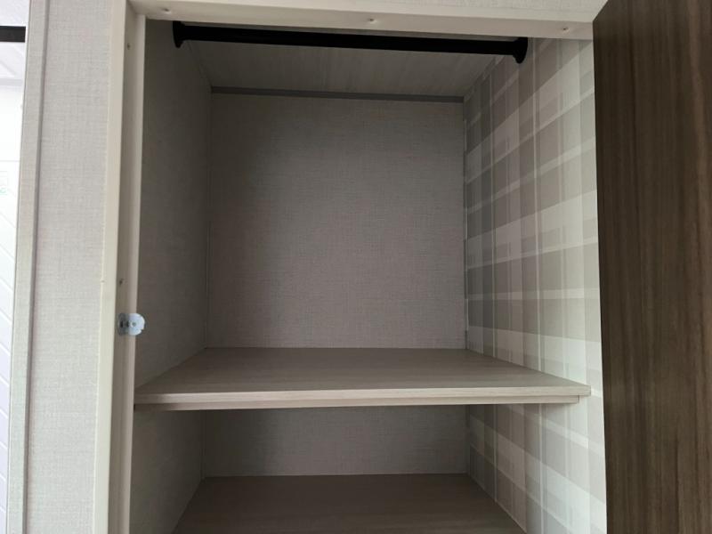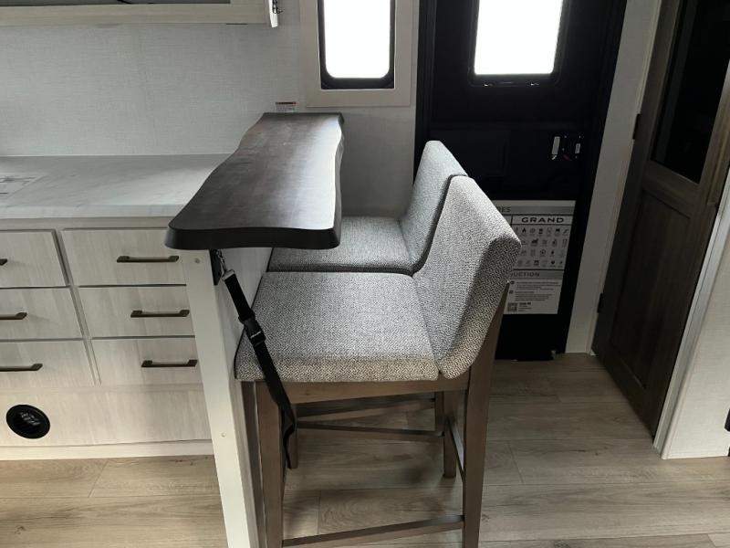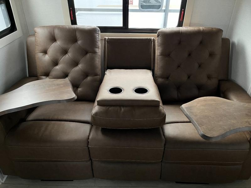 This couple's trailer will be giving you all the glamping vibes! There is a front kitchen with ample counter space, along with a counter with two bar stools, a central vacuum to easily clean up, and a slide out for more space! The second slide out is found in the middle master bedroom where you'll also enjoy a custom king bed across from a bedroom fireplace, a wardrobe, and a dresser with TV prep. Head towards the back and you'll be wowed by the full bath with dual bath sinks, an upgraded slow-close shower door, and a closet with washer and dryer prep. The exterior is just as impressive as the interior with its outside kitchen, 20' power awning with LED lights, slam-latch cargo doors, TV coax, and so much more!