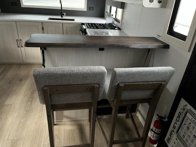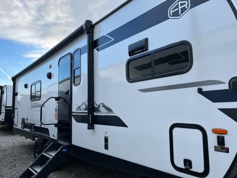 With any Grand Surveyor travel trailer by Forest River you will enjoy turn-key ready-to-go features and quality construction! Each model includes Azdel composite walls and a gel coated fiberglass front cap with an automotive style tinted windshield for a sleek look. There are friction hinge black glass entry door(s), an adjustable platform step with a night light, plus Goodyear tires and a power tongue jack for easy towing. The interior will have you feeling right at home with roller shades, residential faucets, sinks, and bathroom vanity, plus Surf(x) seamless countertops throughout. You can also plan for adventure with a 2" rear accessory and exterior spray port, and there are slam latch exterior baggage doors throughout to keep all your gear secure. Other stand-out features include a central vacuum system, a 200 watt solar panel with a 30 amp controller, a tankless water heater, carpet-free interiors, and the list goes on!