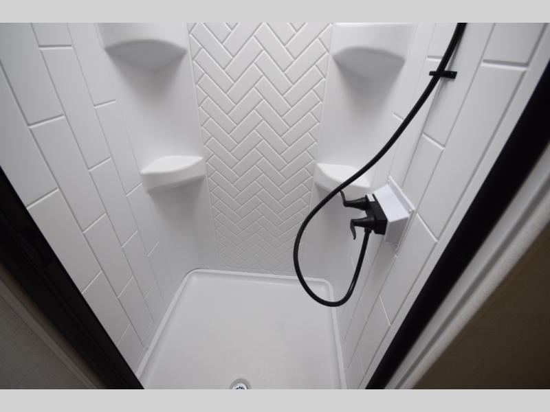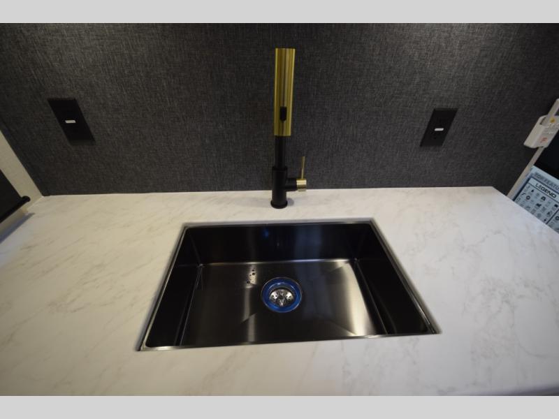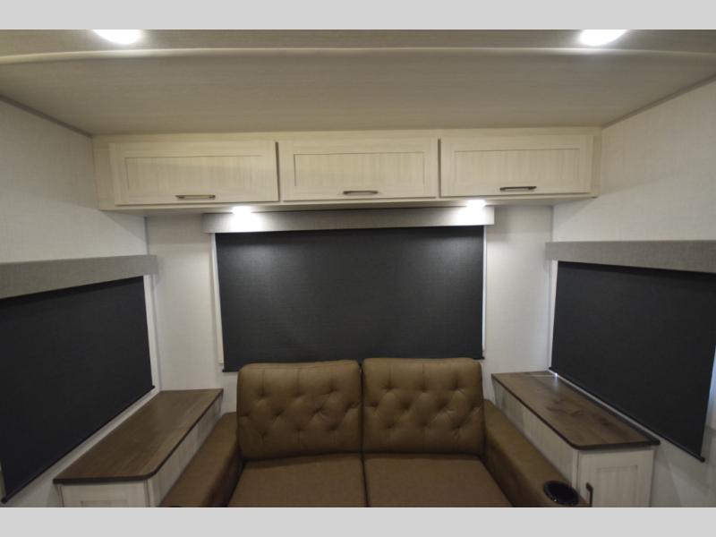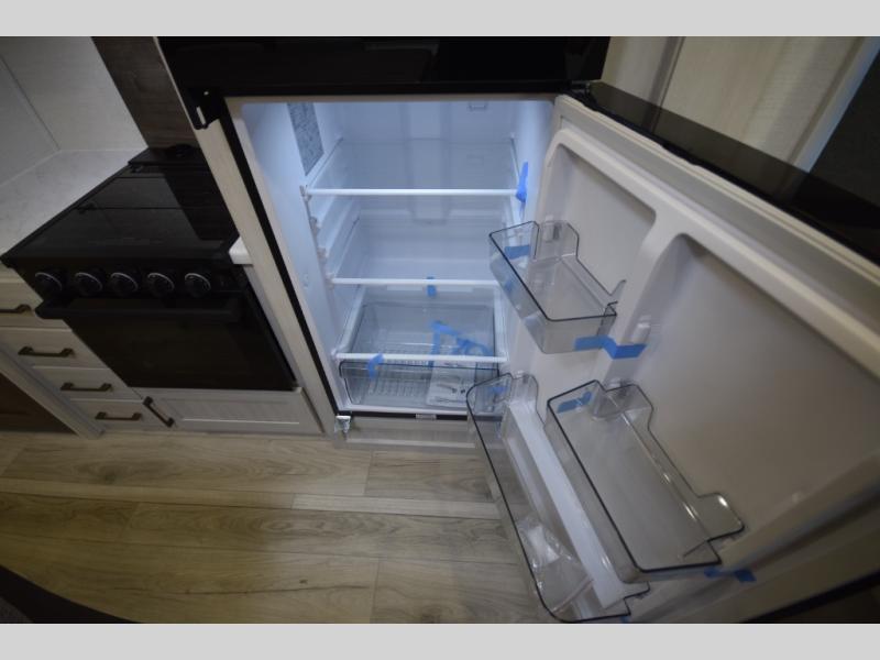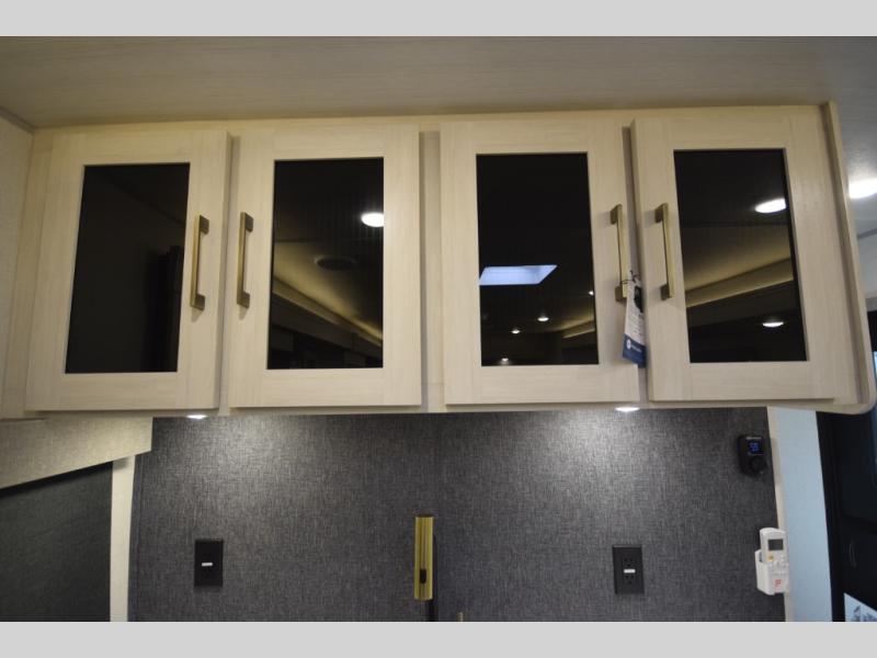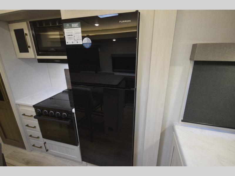 You’ll love the functional layout featuring a pantry, overhead cabinetry, generous counter space, and a 10 cu. ft. 12V black glass refrigerator—perfect for longer trips.