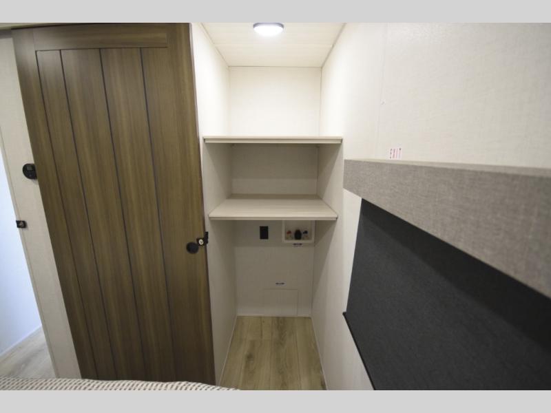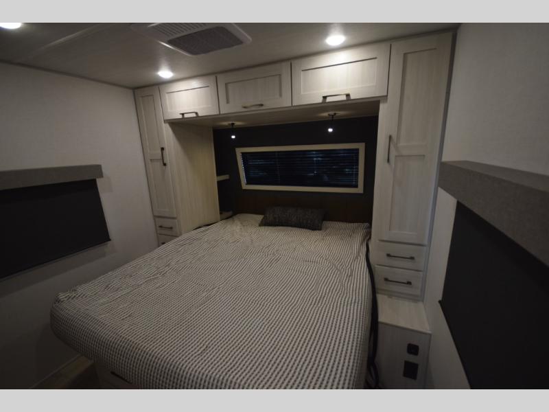Unwind in the front bedroom with a custom king bed, dual wardrobes, and overhead storage that makes organization simple and stress-free.