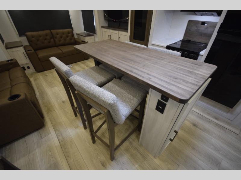 The elevated dinette creates a more residential dining experience and doubles as a great spot for meals, games, or planning your next adventure.