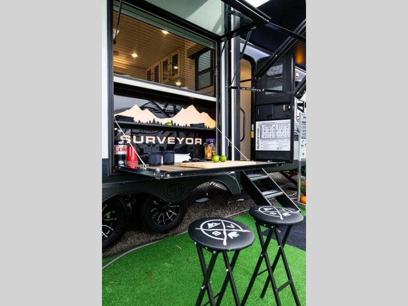 With any Grand Surveyor travel trailer by Forest River you will enjoy turn-key ready-to-go features and quality construction! Each model includes Azdel composite walls and a gel coated fiberglass front cap with an automotive style tinted windshield for a sleek look. There are friction hinge black glass entry door(s), an adjustable platform step with a night light, plus Goodyear tires and a power tongue jack for easy towing. The interior will have you feeling right at home with roller shades, residential faucets, sinks, and bathroom vanity, plus Surf(x) seamless countertops throughout. You can also plan for adventure with a 2" rear accessory and exterior spray port, and there are slam latch exterior baggage doors throughout to keep all your gear secure. Other stand-out features include a central vacuum system, a 200 watt solar panel with a 30 amp controller, a tankless water heater, carpet-free interiors, and the list goes on!