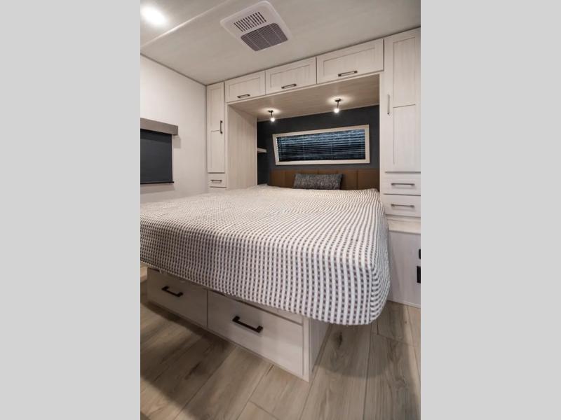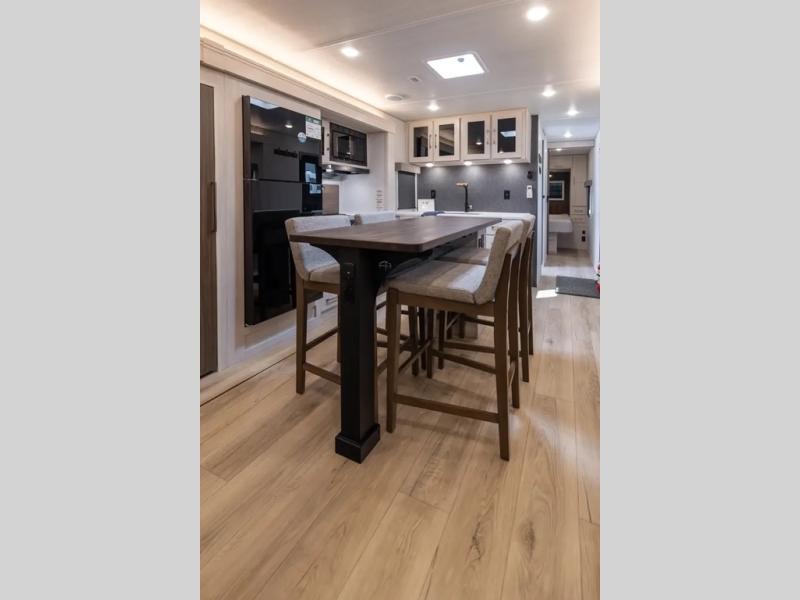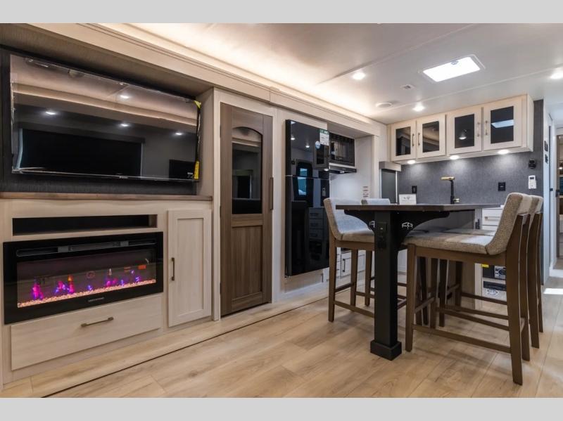 If comfort is what you're looking for, you won't have to search far with this travel trailer! There are dual opposing slides in the main living area for maximum space. The kitchen that flows from the living room area features a high-top dinette that gives a more residential feel to this space, plus there is a pantry, overhead storage, a 10 cu. ft. 12V black glass refrigerator, and more kitchen features you are sure to love. The rear living area includes an EZ-out sofa bed to provide sleeping space for two overnight guests, and there is a theater seat across from the fireplace and HD TV. You'll also enjoy a refreshing drink at the bar top that can also function as a desk! When it's time to call it a night, you can clean up in the spacious full bath, then head to the front bedroom. There is a custom king bed here along with two wardrobes and overhead storage that makes organizing easy!