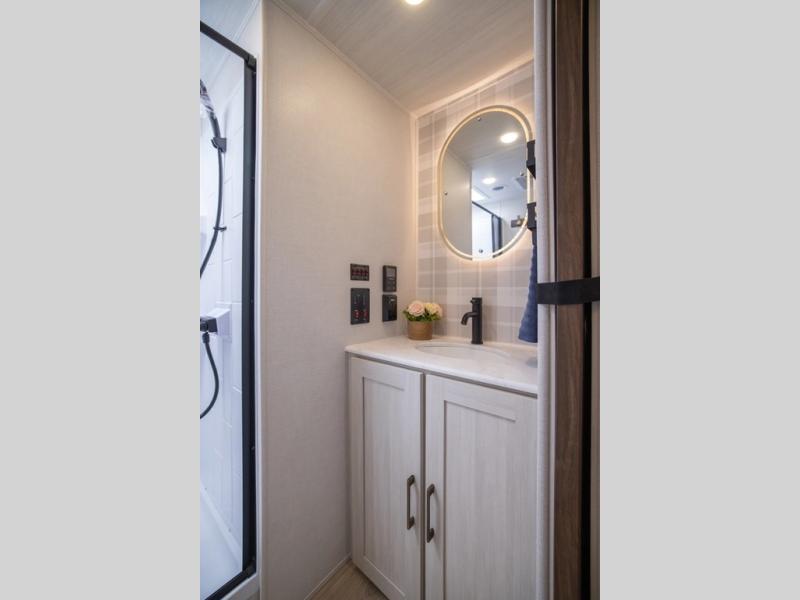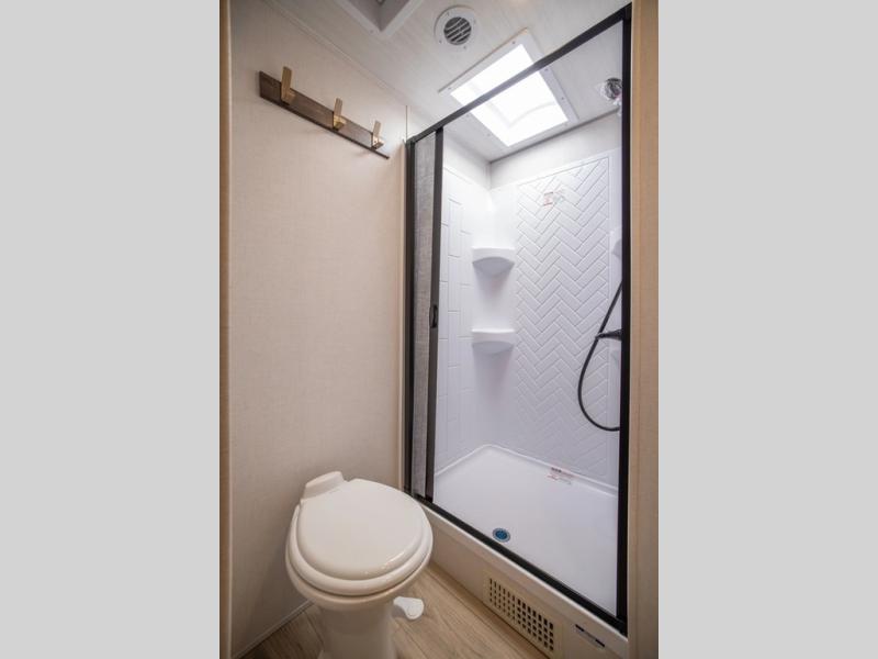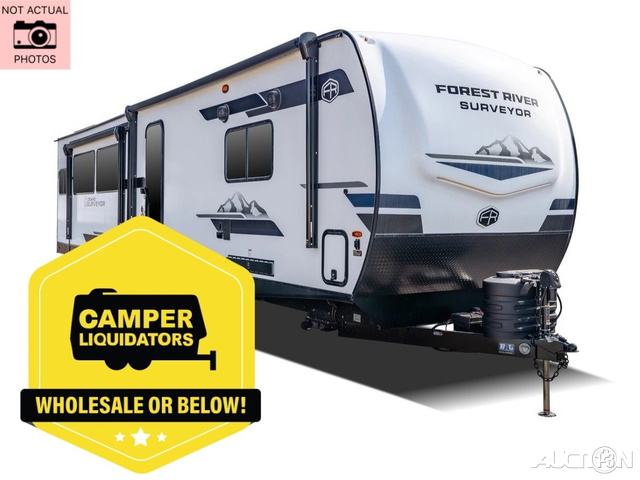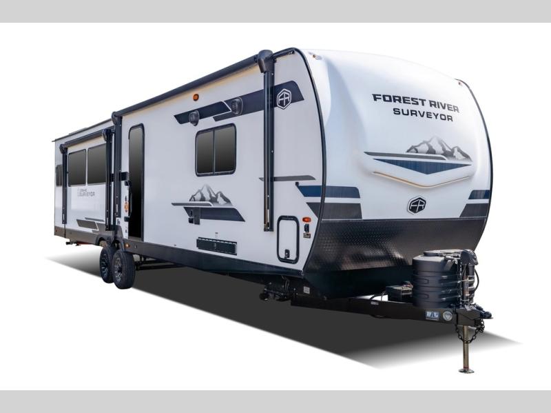 With any Grand Surveyor travel trailer by Forest River you will enjoy turn-key ready-to-go features and quality construction! Each model includes Azdel composite walls and a gel coated fiberglass front cap with an automotive style tinted windshield for a sleek look. There are friction hinge black glass entry door(s), an adjustable platform step with a night light, plus Goodyear tires and a power tongue jack for easy towing. The interior will have you feeling right at home with roller shades, residential faucets, sinks, and bathroom vanity, plus Surf(x) seamless countertops throughout. You can also plan for adventure with a 2" rear accessory and exterior spray port, and there are slam latch exterior baggage doors throughout to keep all your gear secure. Other stand-out features include a central vacuum system, a 200 watt solar panel with a 30 amp controller, a tankless water heater, carpet-free interiors, and the list goes on!