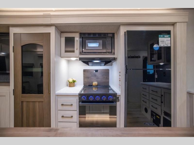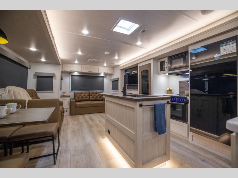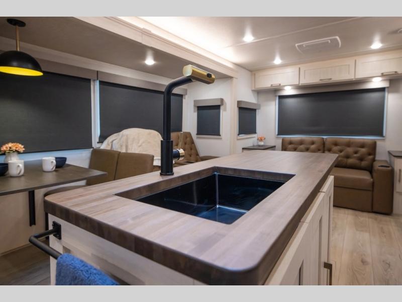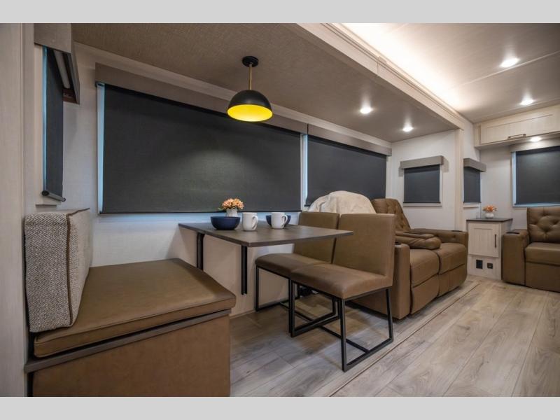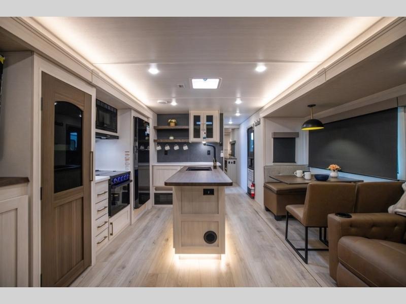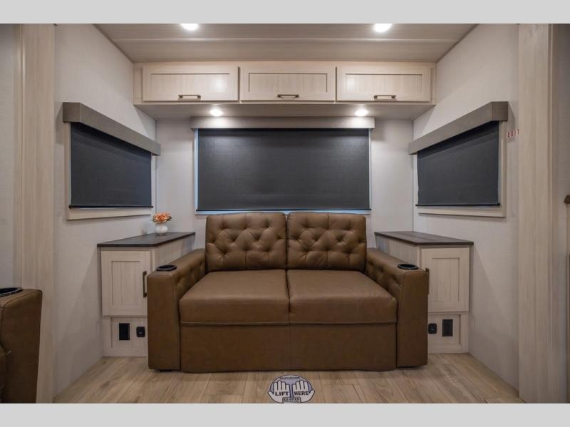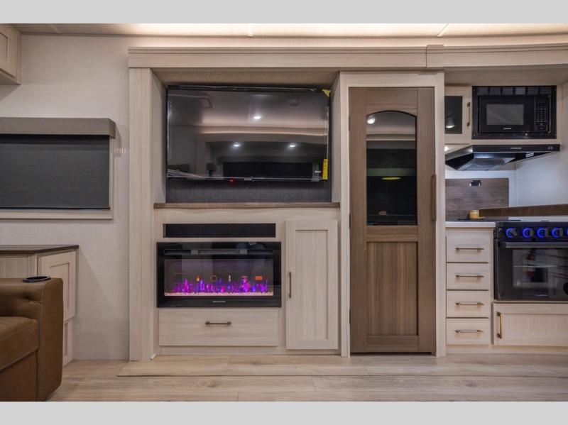 If luxury is what you're looking for, you won't have to search far with this travel trailer! There are triple slides, with dual opposing slides in the main living area for maximum space. The kitchen island gives a more residential feel to this space, plus there is a pantry, a hutch with shelves, a 10 cu. ft. 12V black glass refrigerator, and more kitchen features you are sure to love. The rear living area includes a tri-fold sofa to provide sleeping space for two overnight guests, and there is a theater seat across from the fireplace and HD TV. You'll also enjoy dining at the free-standing dinette with a multi-purpose ottoman! When it's time to call it a night, you can clean up in the spacious full bath, then head to the front master bedroom to retire. There is a custom king bed slide out here, along with a full-wall wardrobe in front, a dresser, a closet with washer and dryer prep, plus a bedroom fireplace!