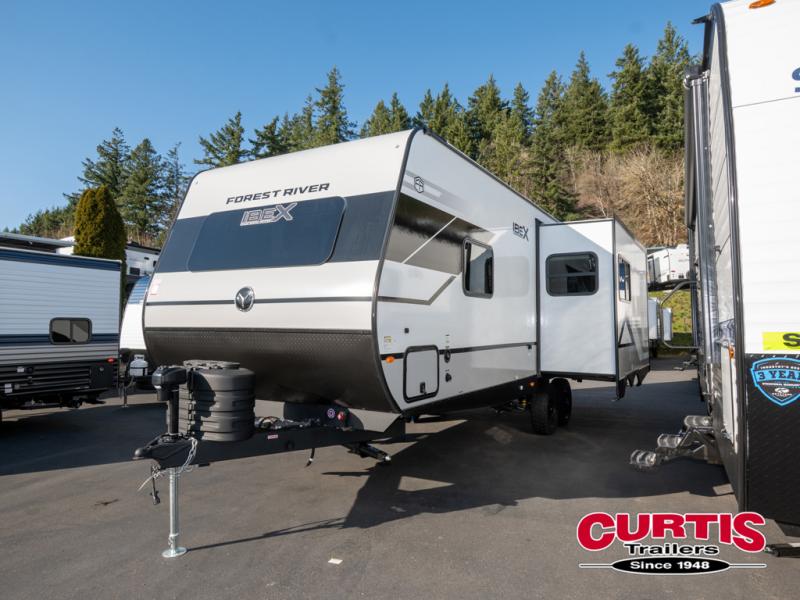 The Forest River IBEX travel trailers are extended season ready, and adventure approved! They are built with a sealed underbelly with forced heat and radiant foil barrier, along with an aluminum framed floor and 12V tank heaters. There are also all-terrain tires with TPMS, a 200-watt solar panel, a power tongue jack, and roof ladder prep. Inside, you'll love the Surf(X) seamless countertops and the large kitchen sink with a cup washer, plus there is Bluetooth audio with marine grade speakers so you can listen to your favorite tunes. The optional Black Canyon Beast Mode Package is available with an independent suspension, 400 watts of solar, a fresh water filter, and a Maxxair roof vent cover.