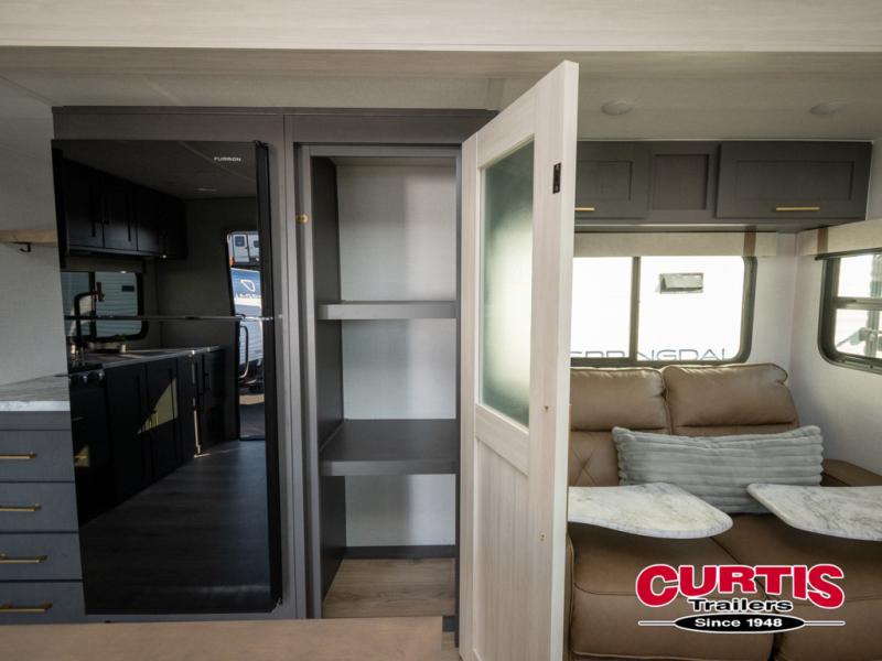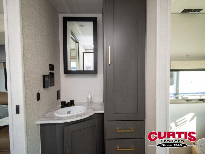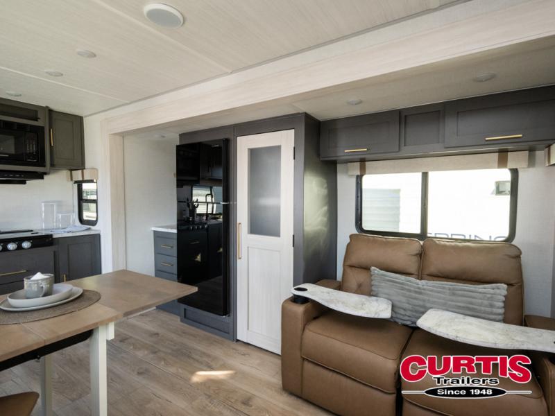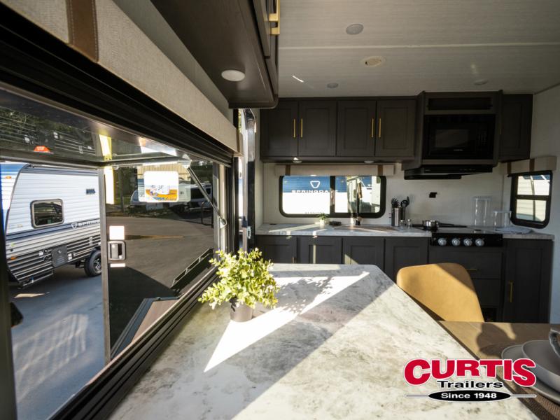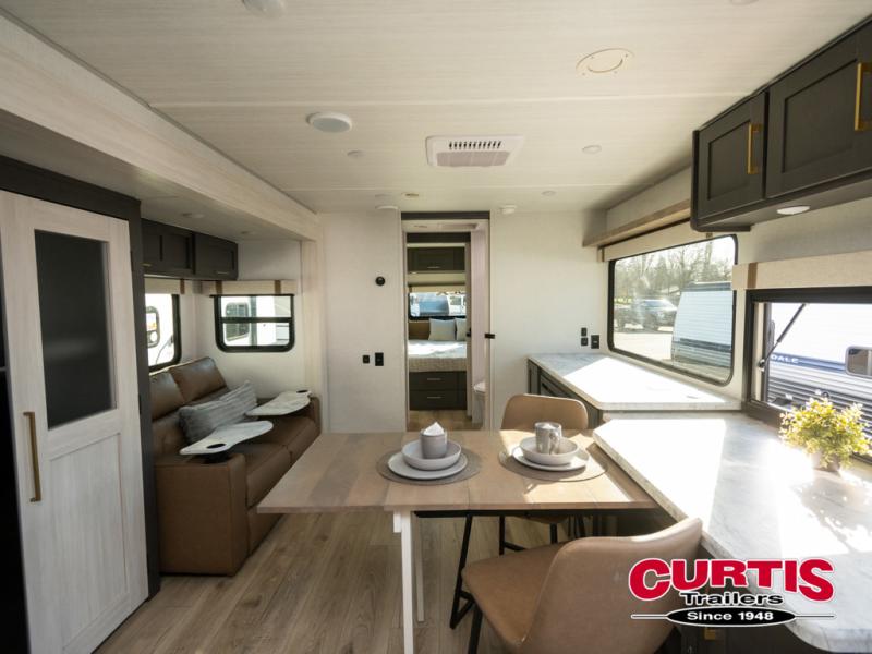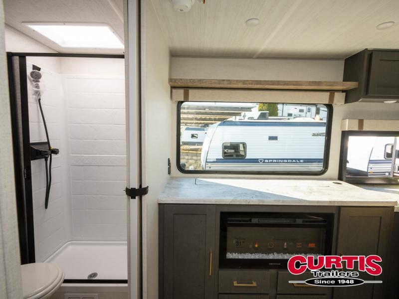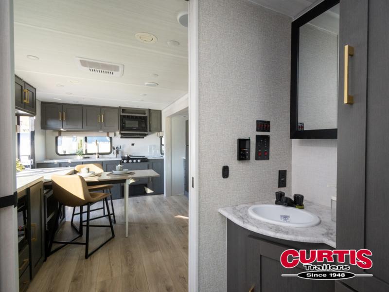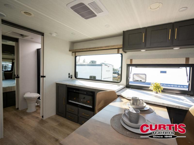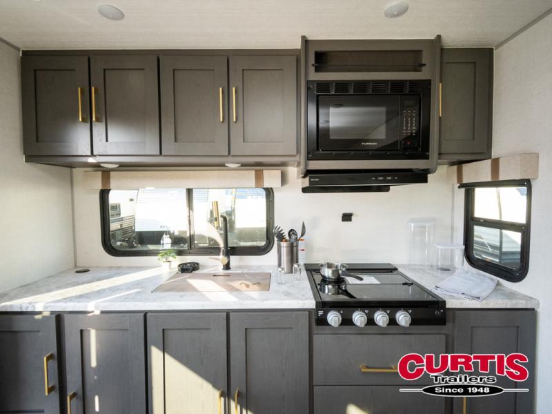This dual entry travel trailer will let you enter in through the front master bedroom or the rear kitchen! The bedroom includes a queen bed with dual wardrobes to keep your things tidy, plus you'll have quick access into the walk-thru bath. Head to the rear kitchen to make dinner on the cooktop and air fryer microwave, then dine at the Bar 2 Table in front of the flip-up window. There is also theater seating within the slide out, along with the 12V refrigerator, pantry, plus hutch with a shelf for ample storage. You will enjoy the entertainment center and fireplace across from the theater seating for cozy evenings indoors, or you may just head outdoors to enjoy the outside kitchen and power awning with LED lights!